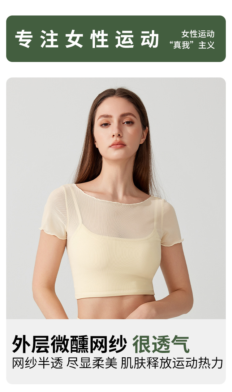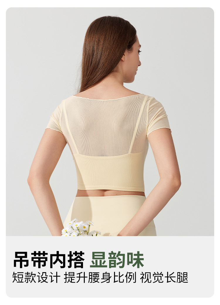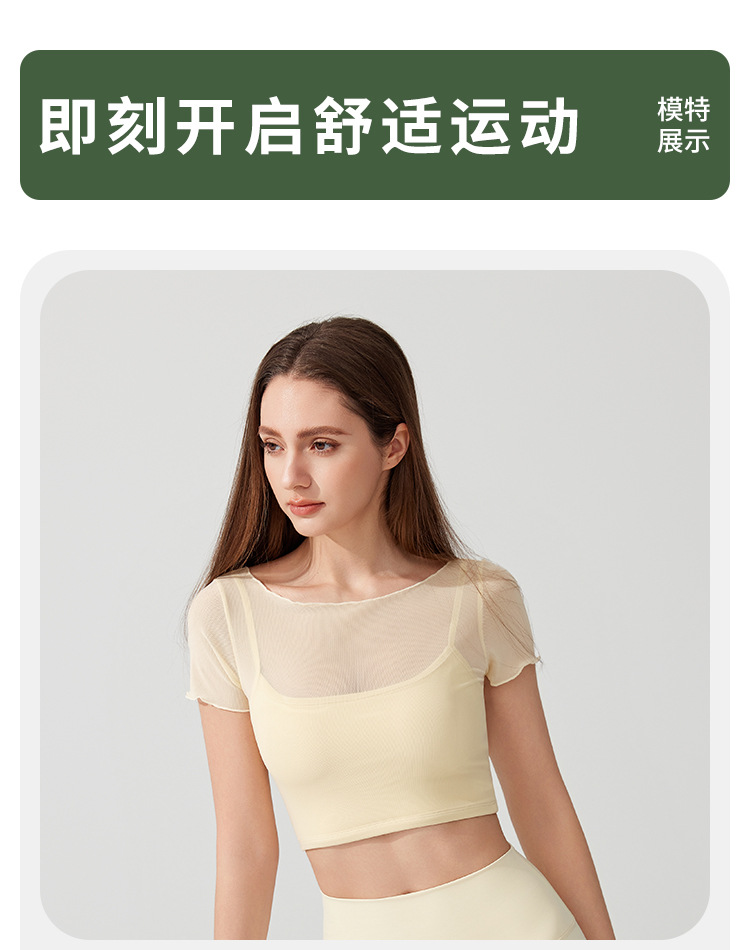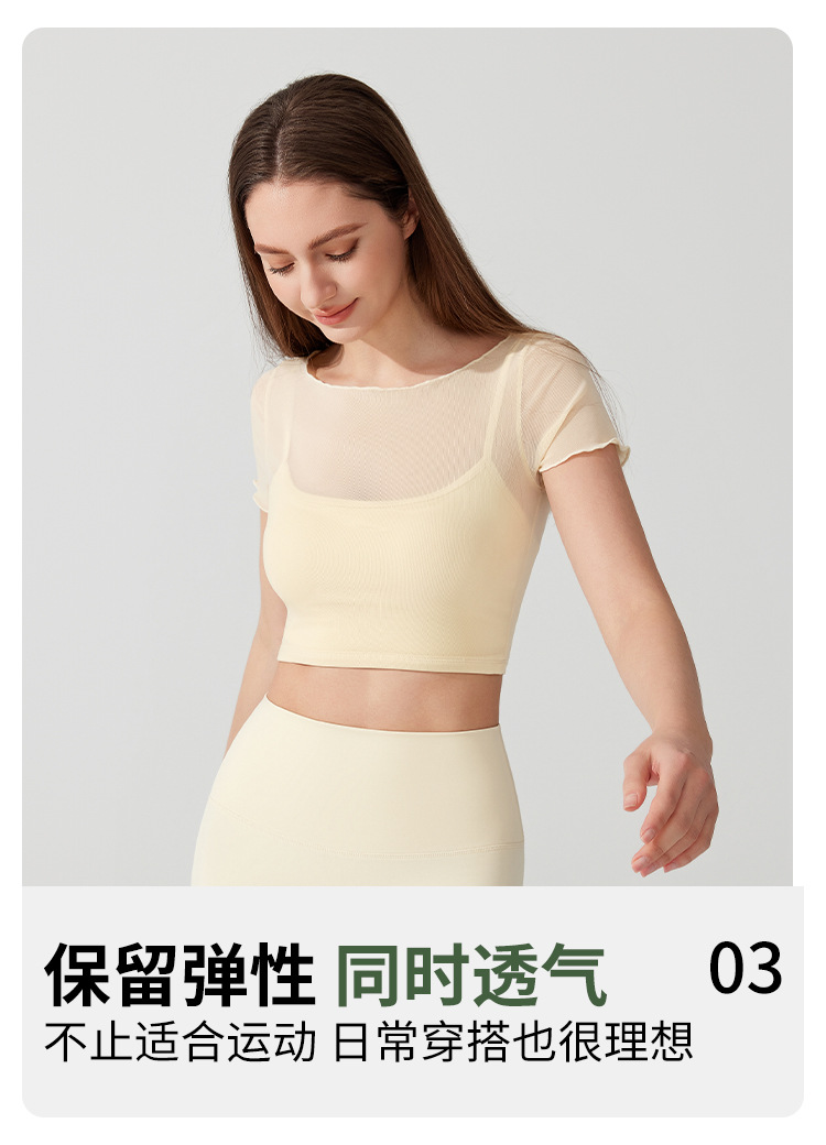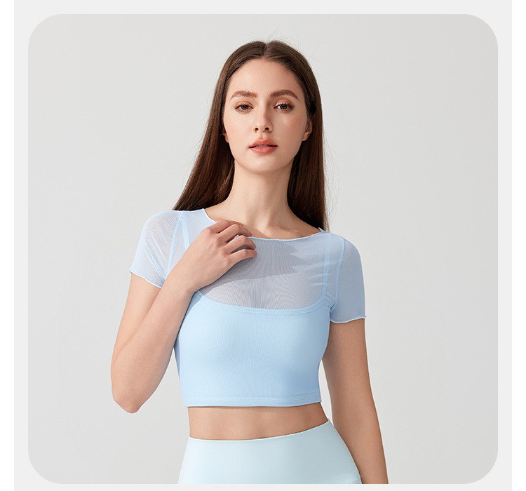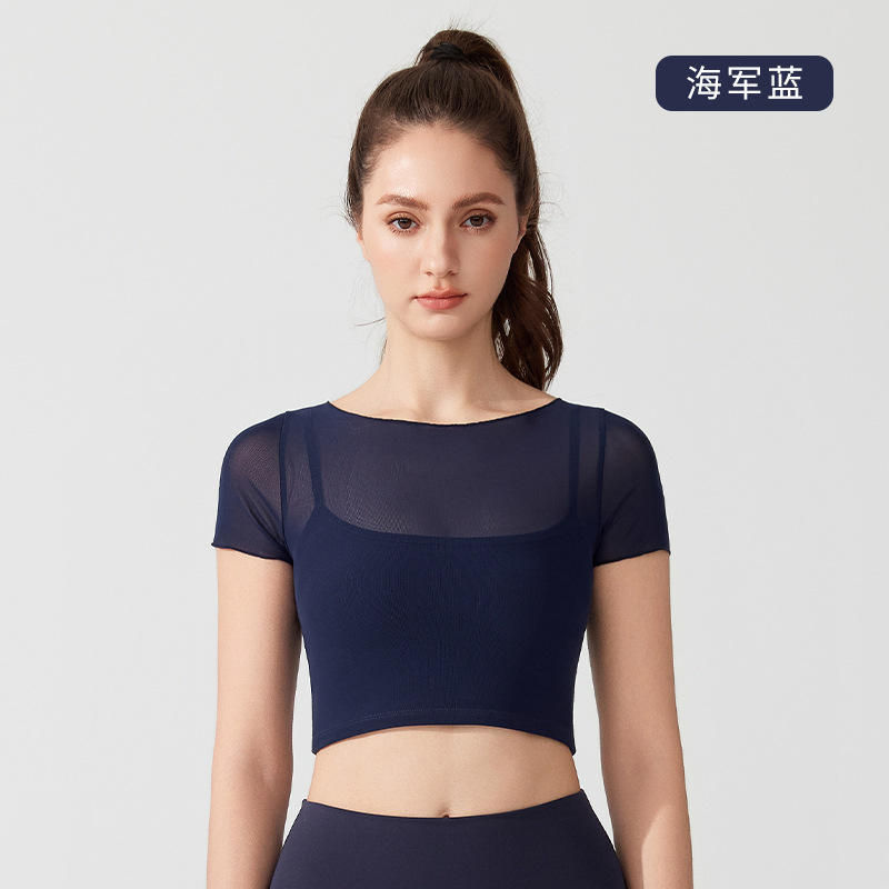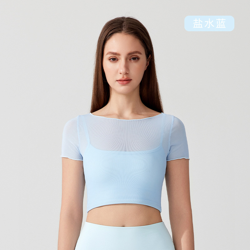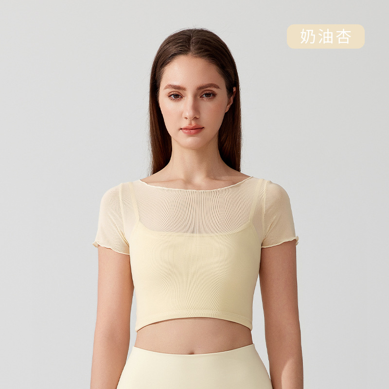 가슴 패드가 있는 여성용 여름 요가복, 반팔 티셔츠, 스포츠 상의, 메쉬 기질, 슬리밍 필라테스 트레이닝 피트니스복스토어 가기