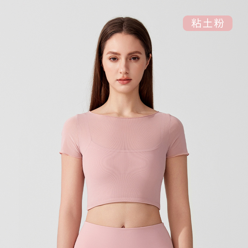 가슴 패드가 있는 여성용 여름 요가복, 반팔 티셔츠, 스포츠 상의, 메쉬 기질, 슬리밍 필라테스 트레이닝 피트니스복