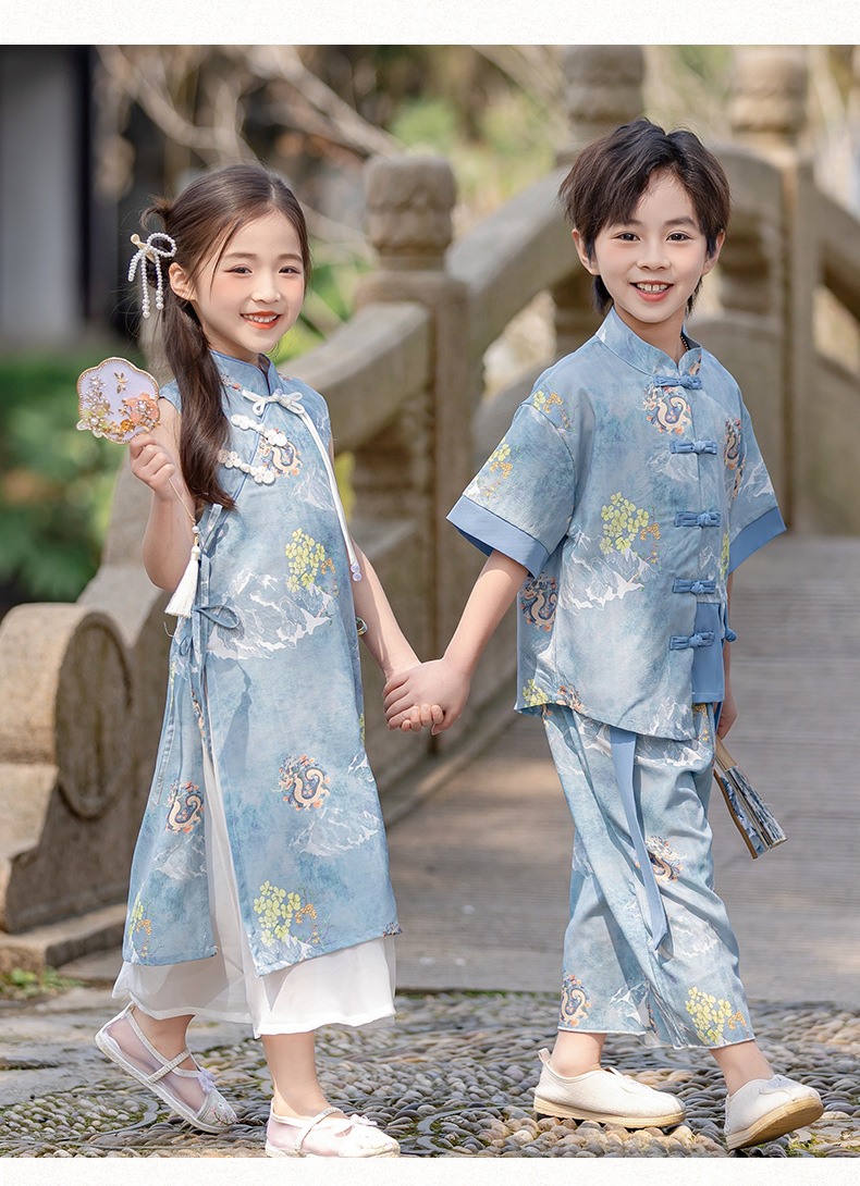 소년 소녀를위한 소녀 청삼 스커트 어린이 새로운 중국 한후 여름 중국 스타일 탕 세트 고대 세트 고대 스타일 공연 패션