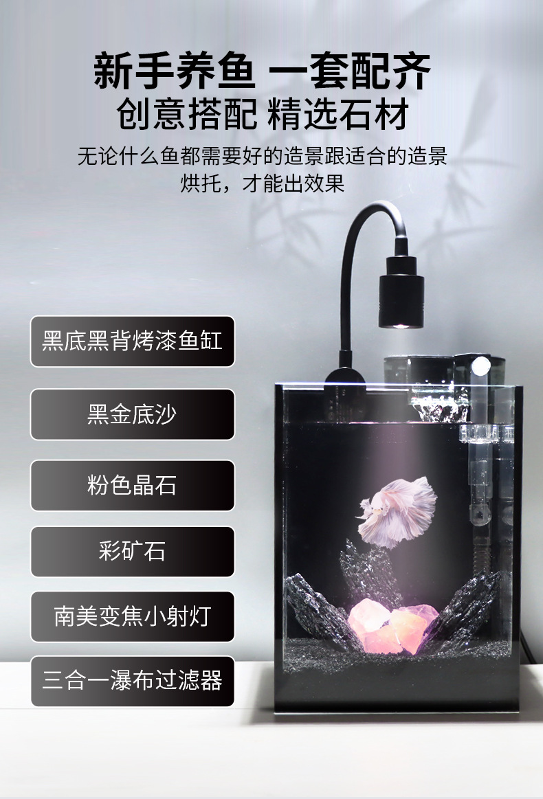 다크 스타일 데스크탑 수조 핑크 크리스탈 작은 유리 탱크 자체 순환 물 교환 없음 betta 생태 조경 수조