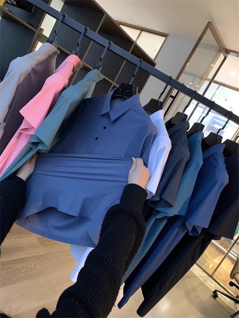 가벼운 고급 품질! 기술 얼음 실크 직물! 마크 압력 접착제 없음! 여름 남자 올 매치 솔리드 컬러 옷깃 폴로 셔츠스토어 가기