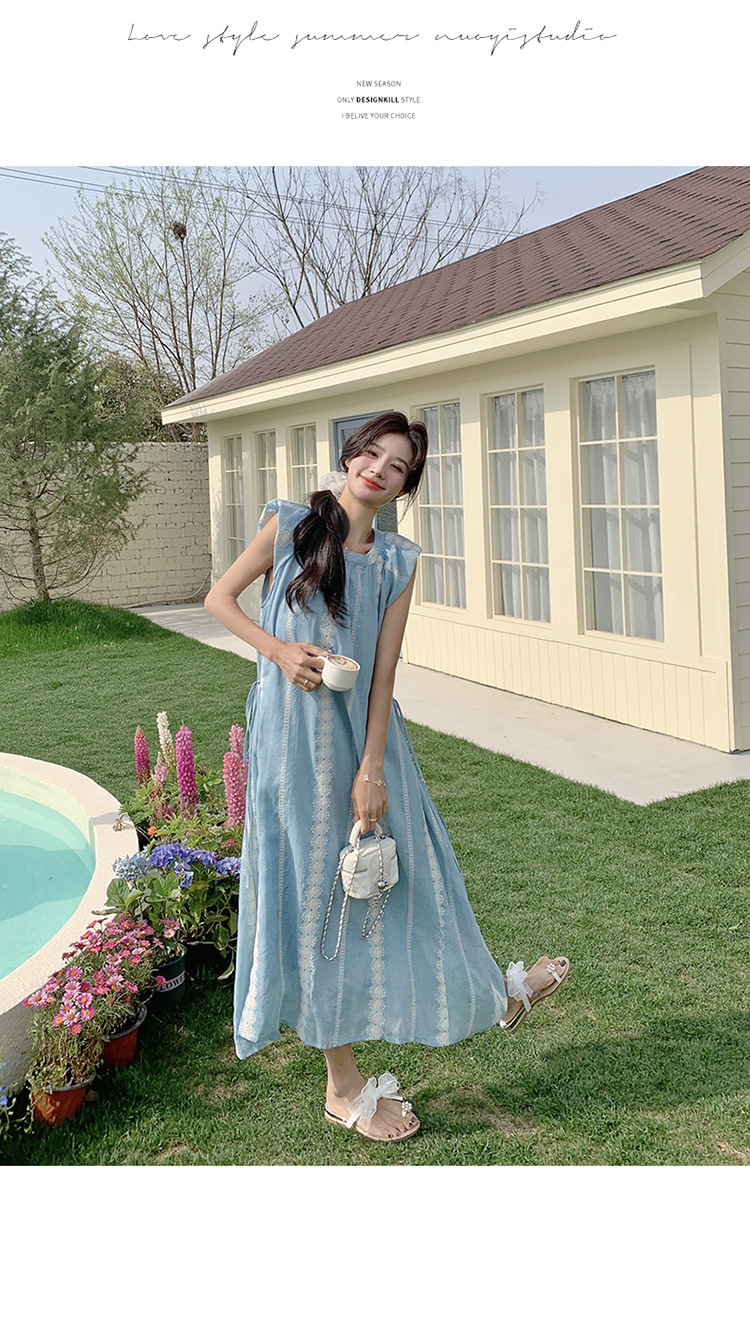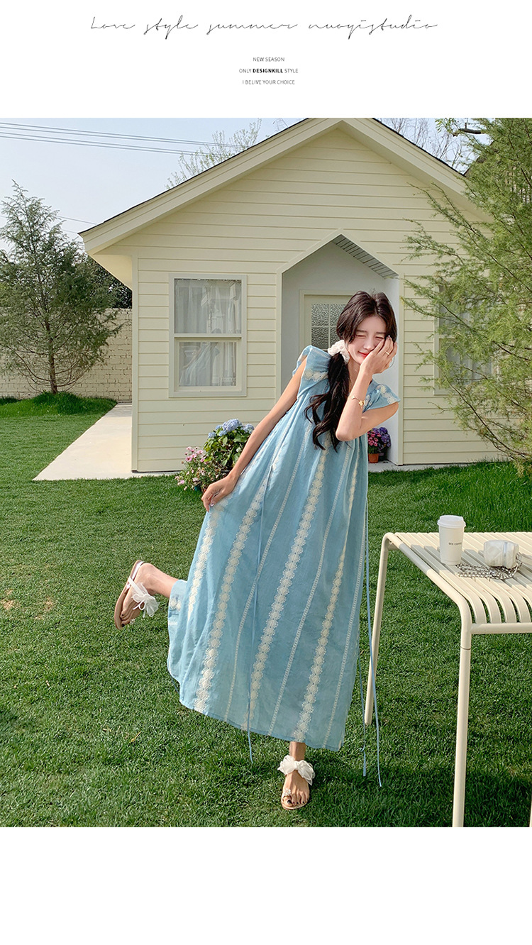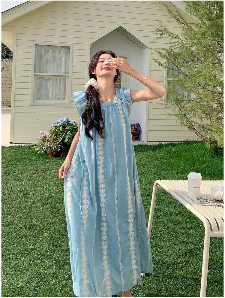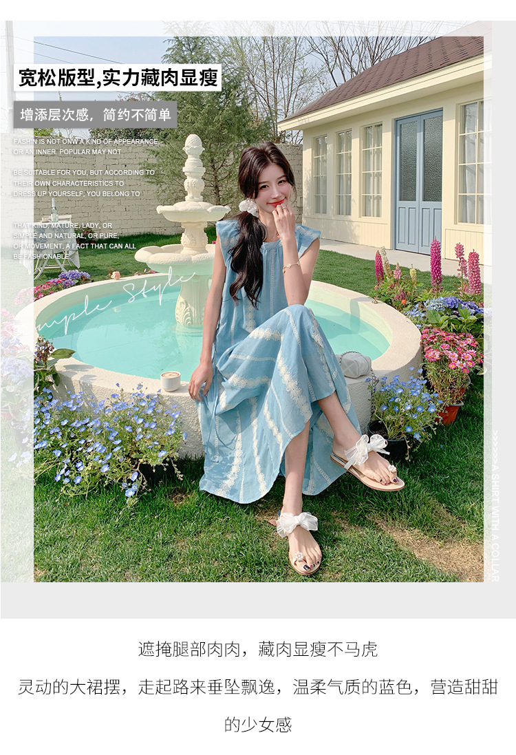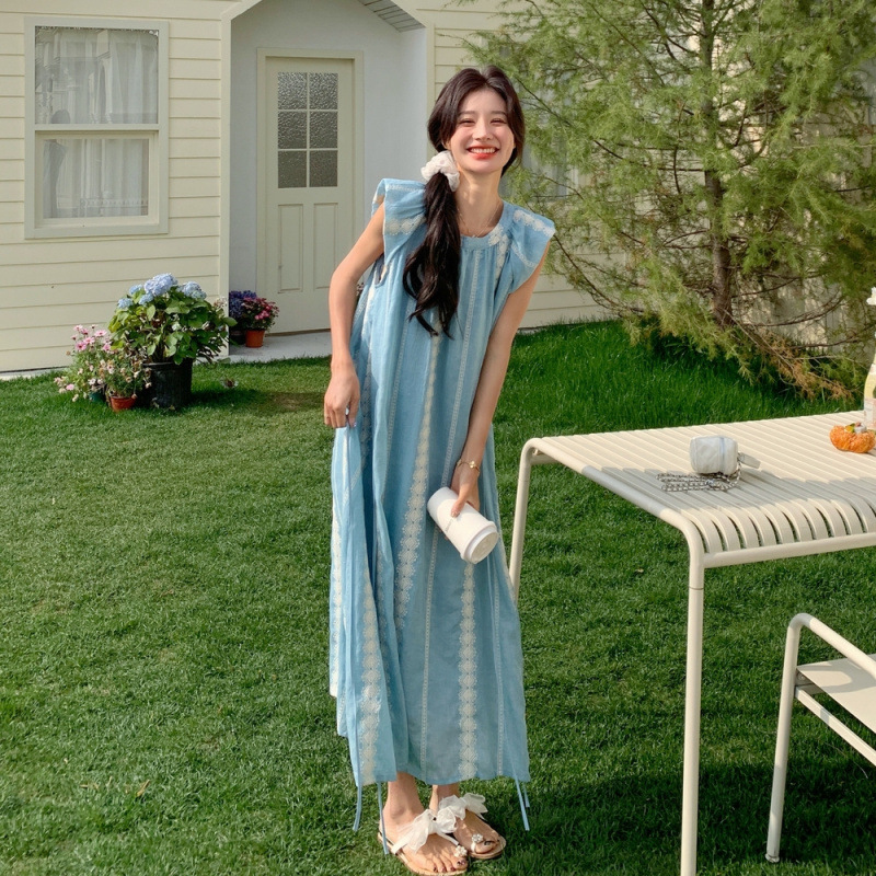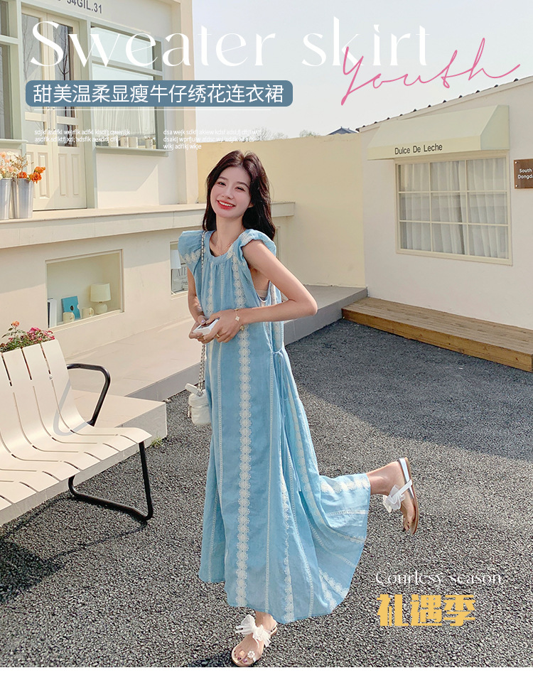 블루 원피스 여자 2025 년 여름 새로운 한국식 Ins 스타일 달콤한 나이 감소 느슨한 캐주얼 자수 긴 치마스토어 가기