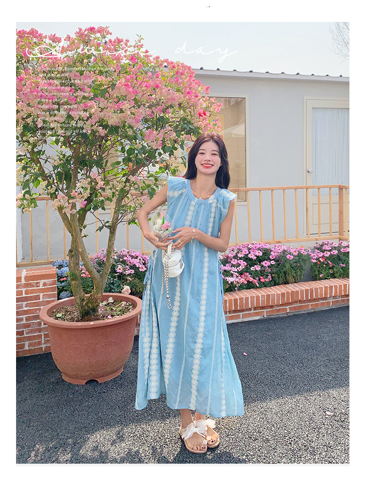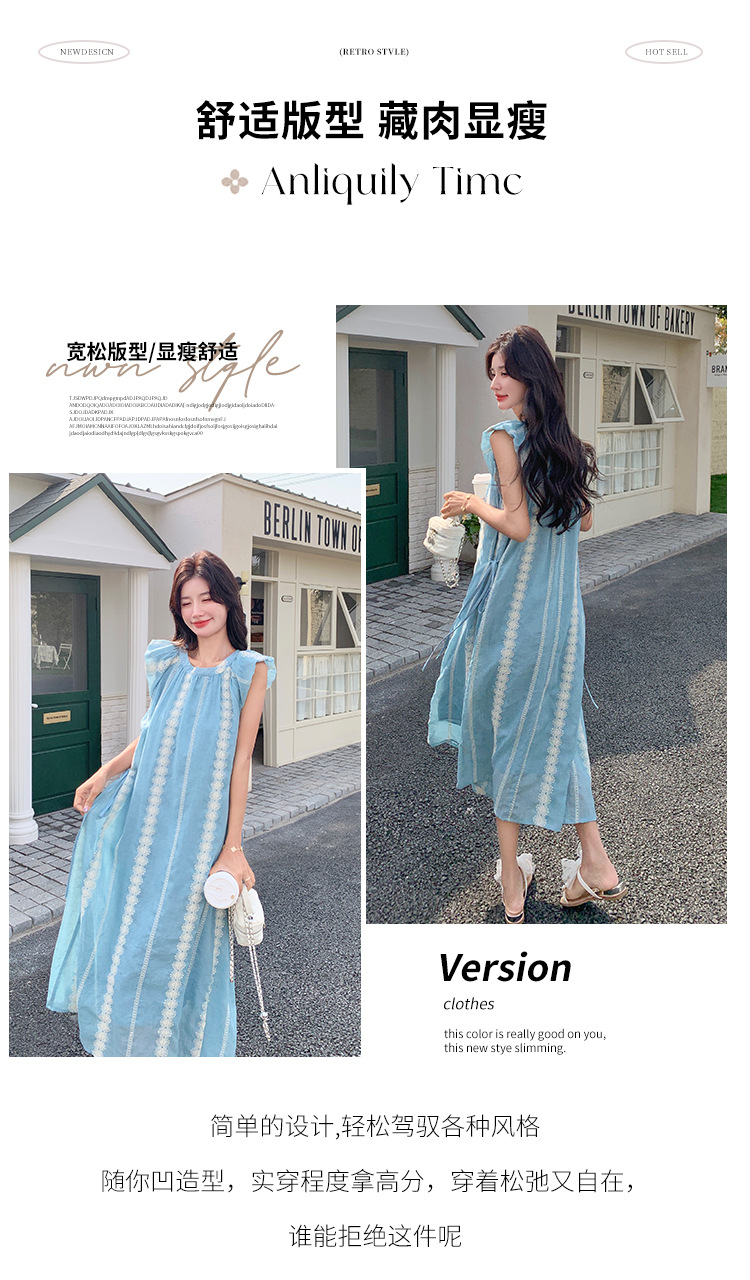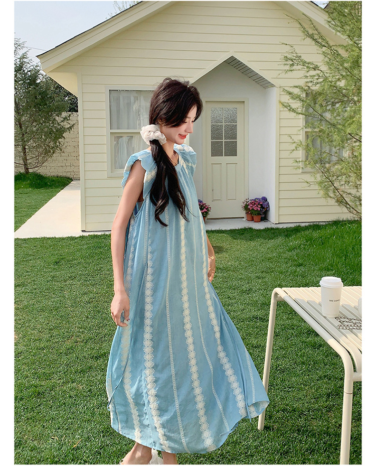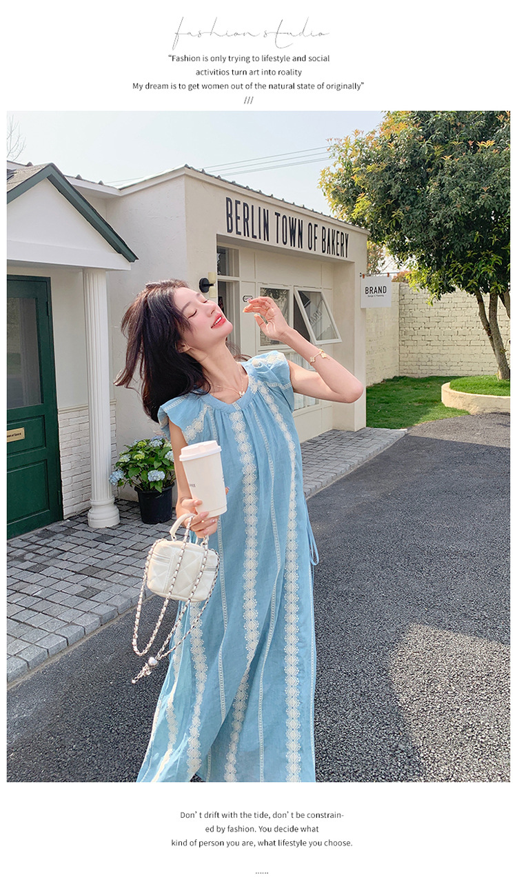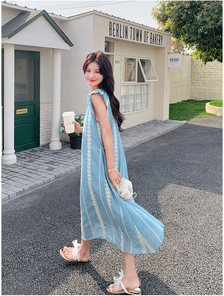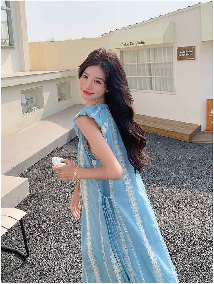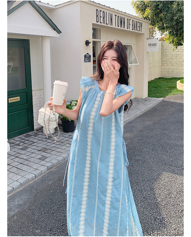 블루 원피스 여자 2025 년 여름 새로운 한국식 Ins 스타일 달콤한 나이 감소 느슨한 캐주얼 자수 긴 치마스토어 가기