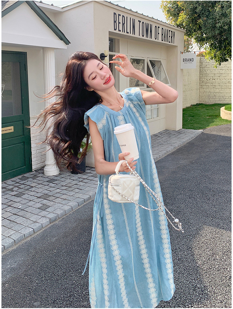 블루 원피스 여자 2025 년 여름 새로운 한국식 Ins 스타일 달콤한 나이 감소 느슨한 캐주얼 자수 긴 치마