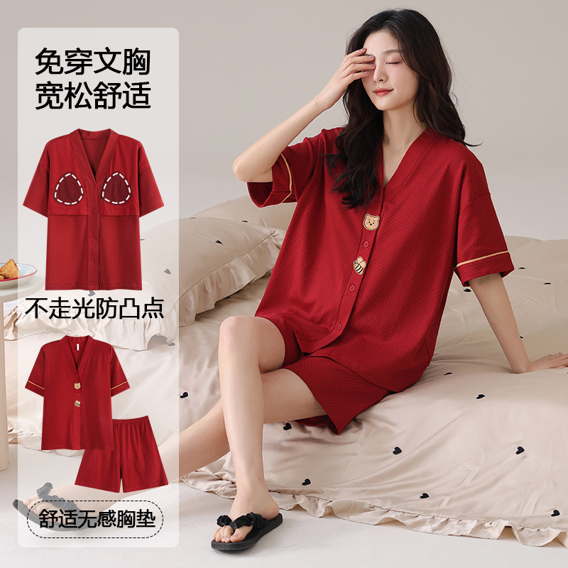 [순면] 커플 잠옷 여성 여름 반팔 양복 결혼식 남성의 동물의 해 여름 빨간색 가정복스토어 가기