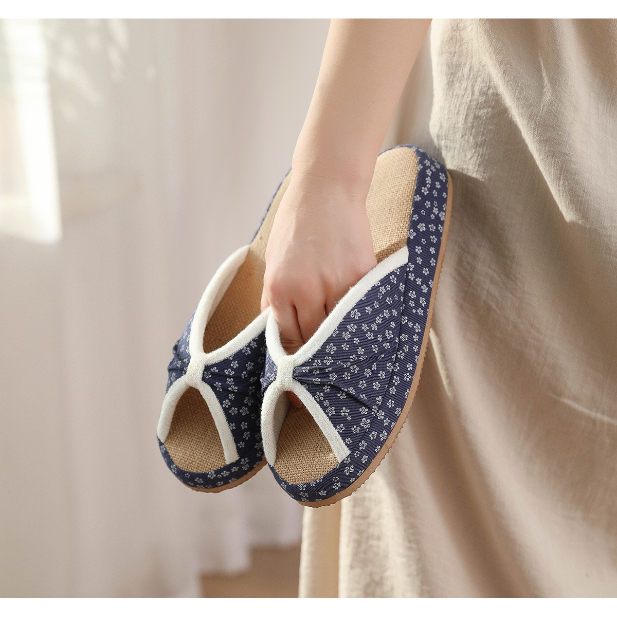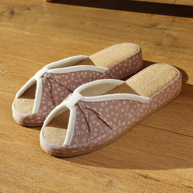 여성을위한 일본식 작은 꽃무늬 린넨 슬리퍼 여름 실내 귀여운 부드러운 바닥 가정용 봄, 가을 사무실 면화 및 린넨 슬리퍼