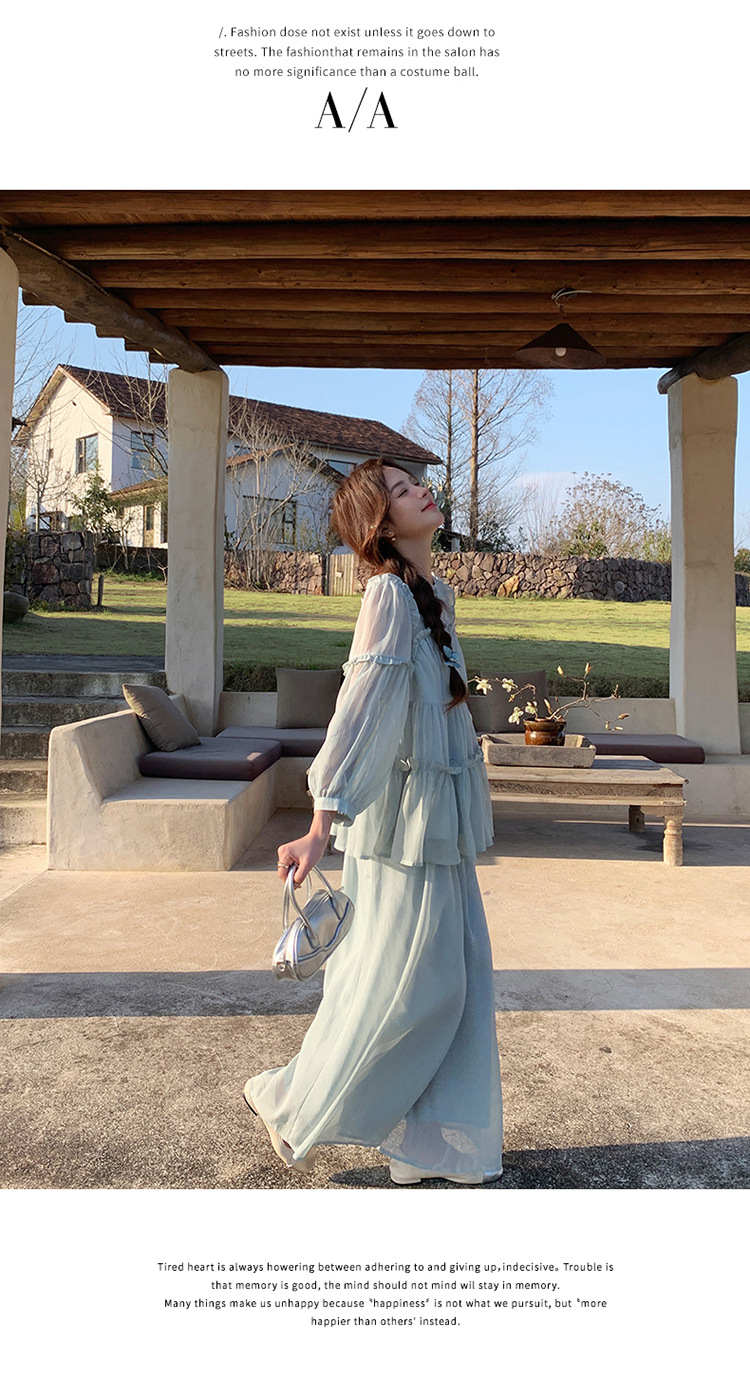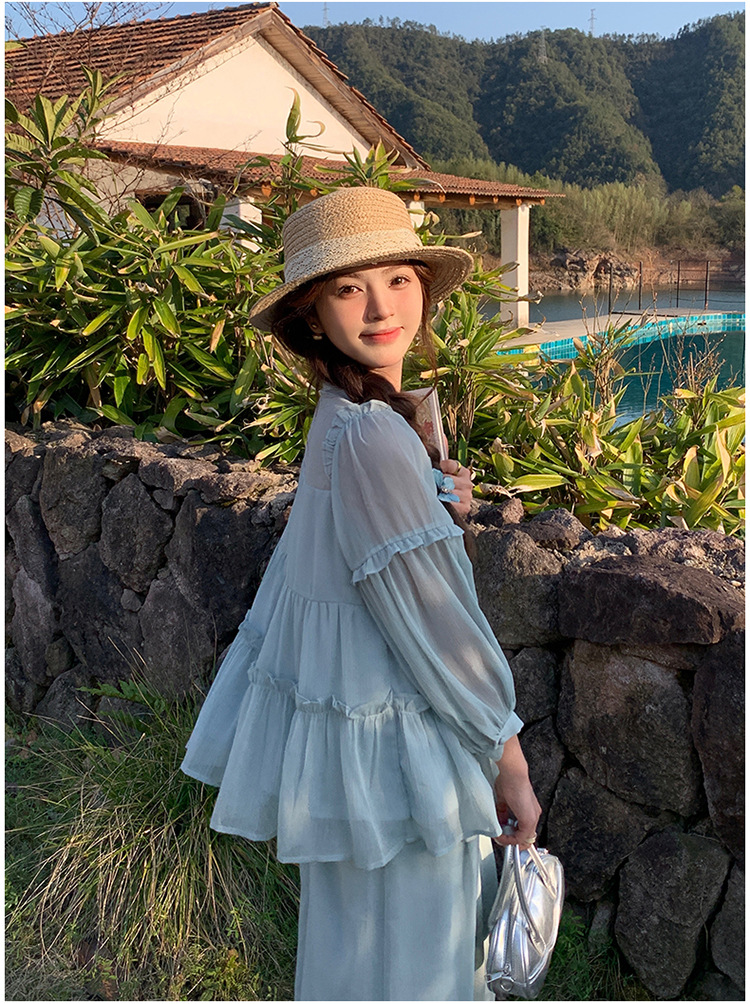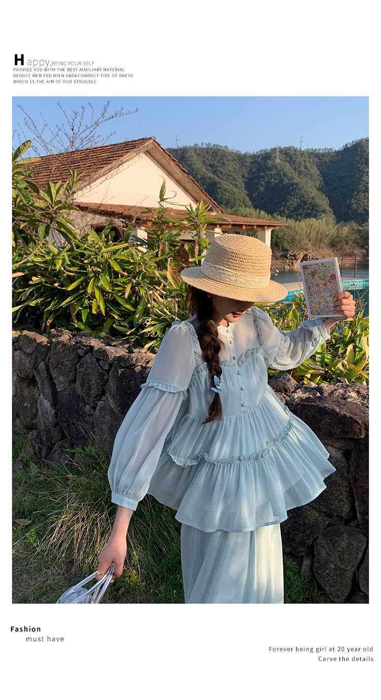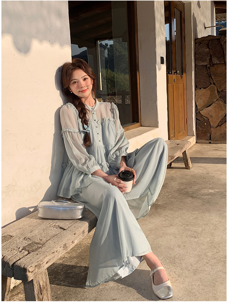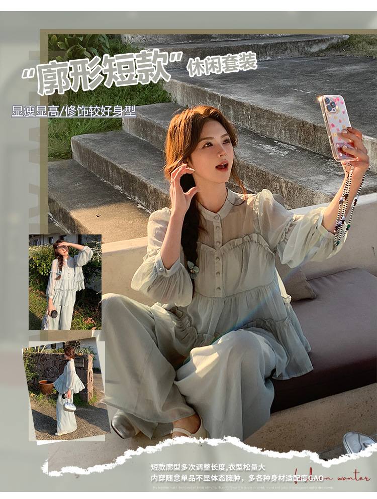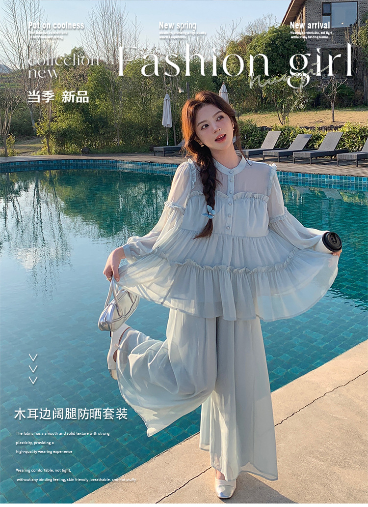 블루 홀리데이 스타일 슈퍼 잘 생긴 나이 감소 세트 여성의 2025 여름 새로운 나무 귀 탑 와이드 다리 바지 투피스 세트스토어 가기