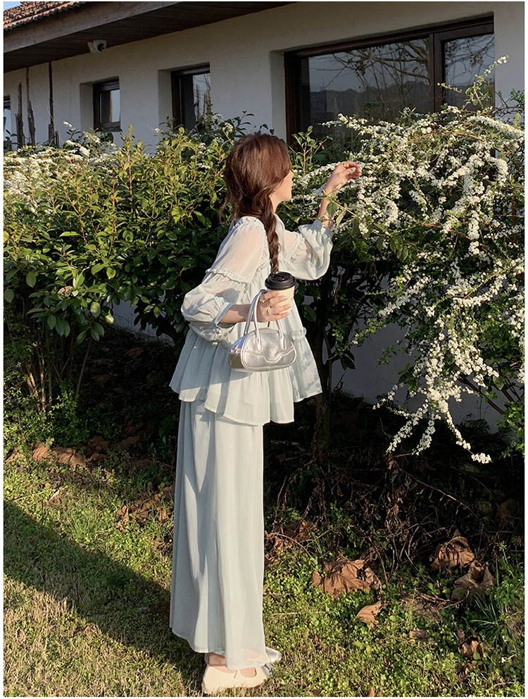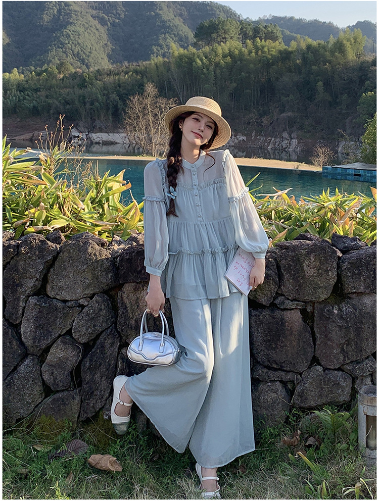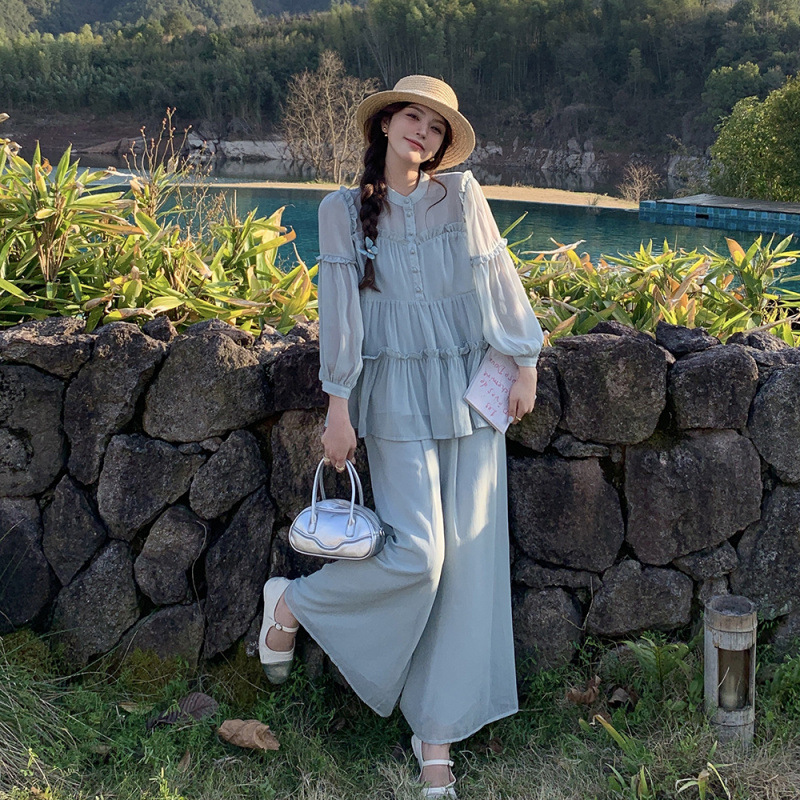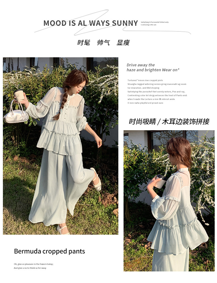 블루 홀리데이 스타일 슈퍼 잘 생긴 나이 감소 세트 여성의 2025 여름 새로운 나무 귀 탑 와이드 다리 바지 투피스 세트