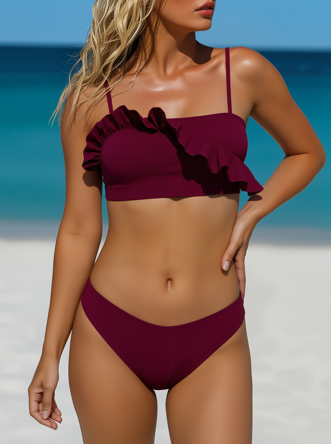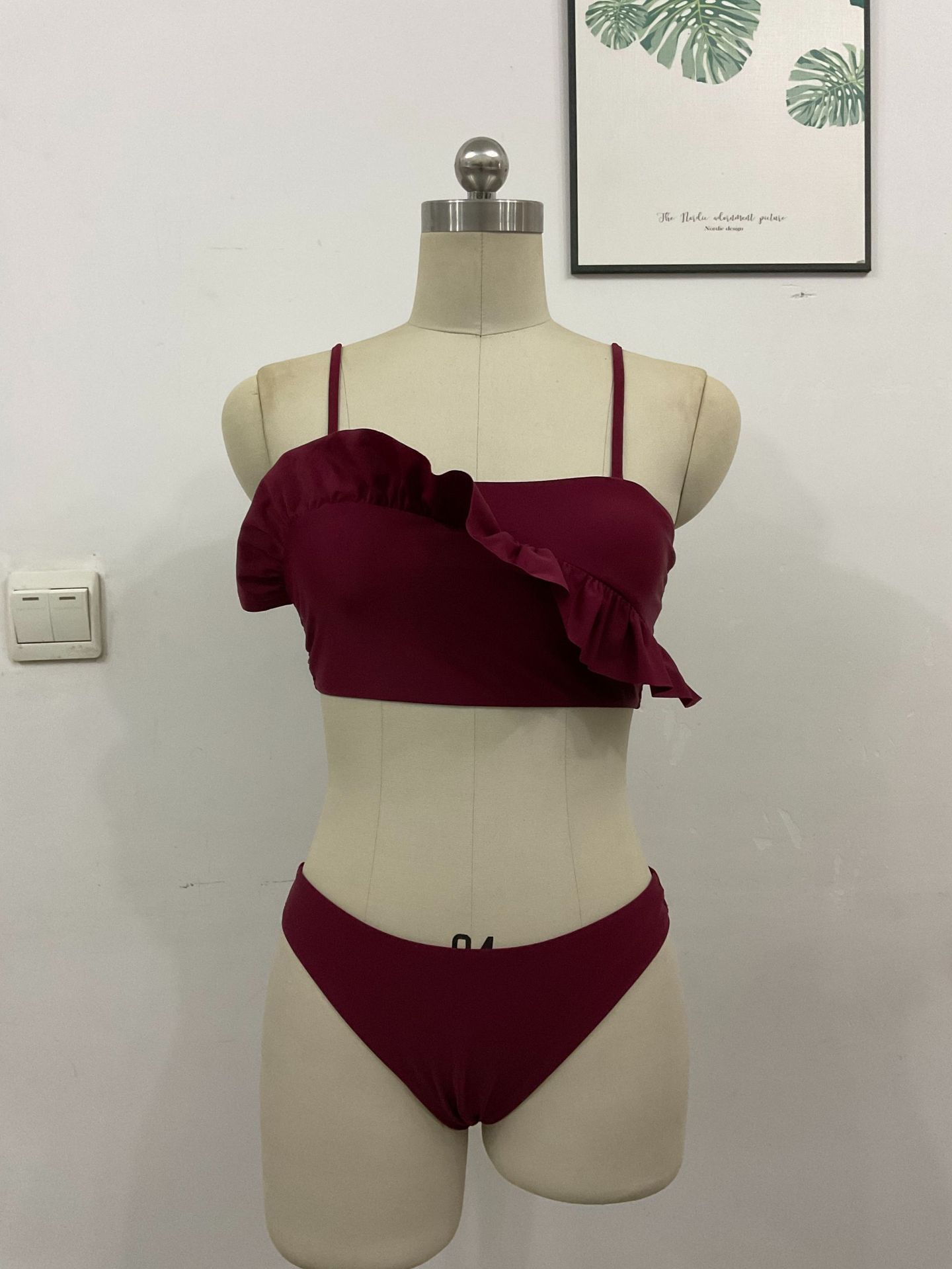 2025 신상 비키니, 유럽과 미국에서 인기 있는 섹시한 분리형 버건디 비키니, 불규칙한 러플 여성 수영복