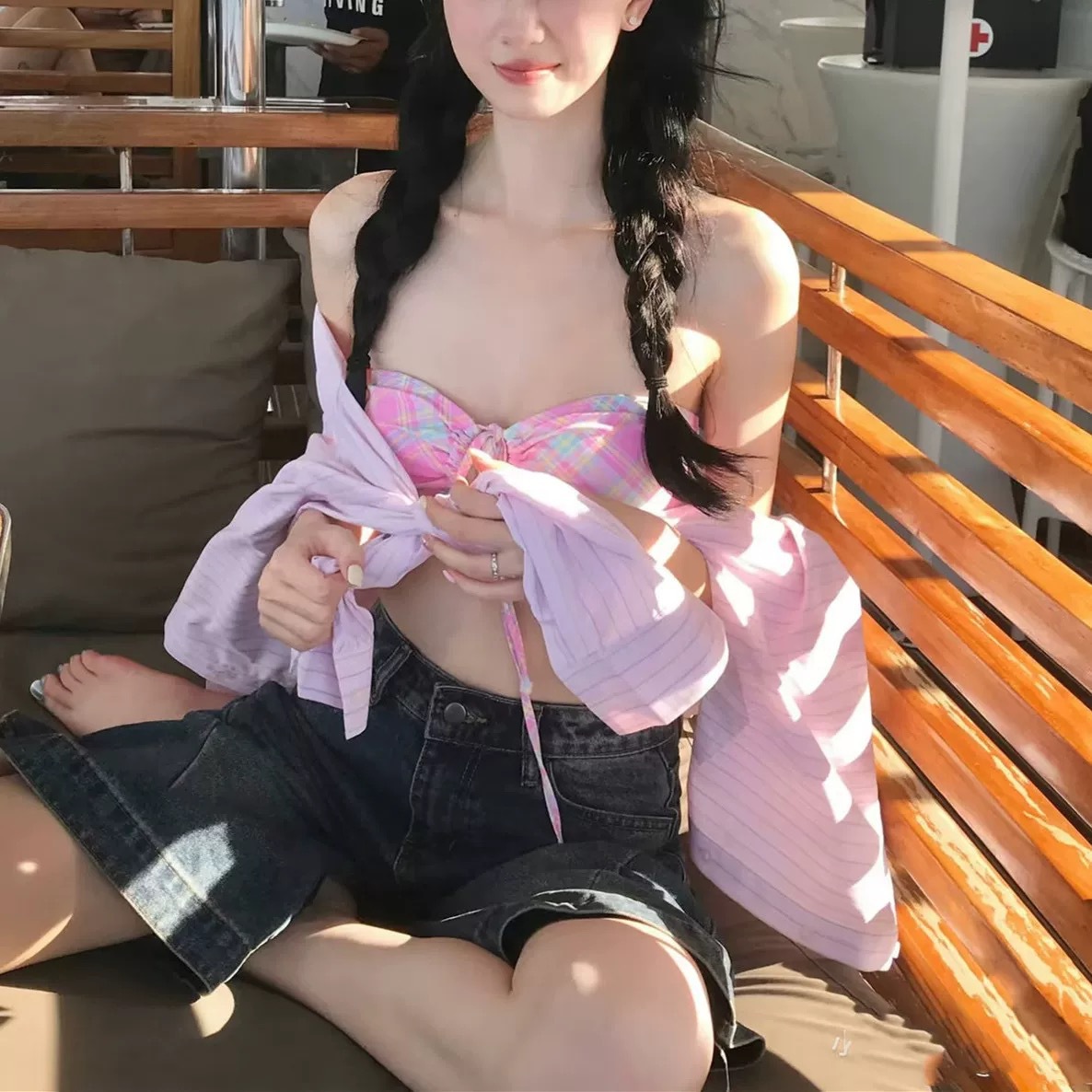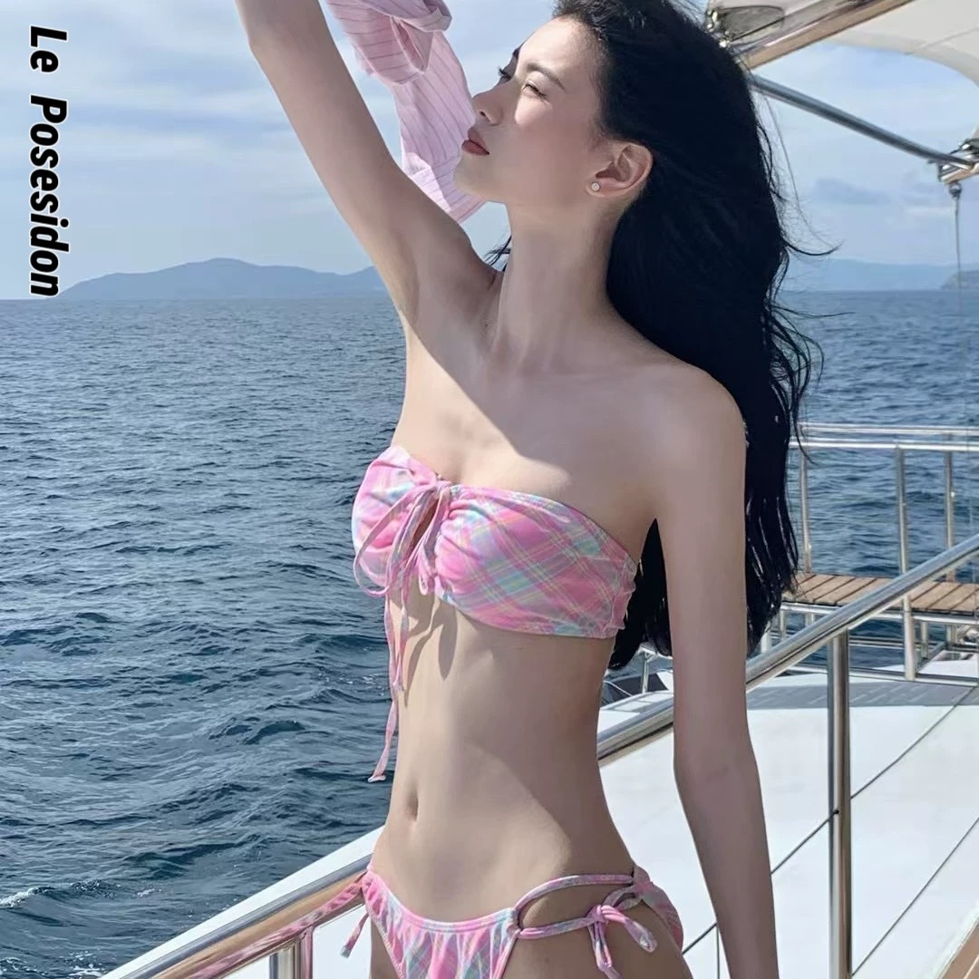 수영복 여성의 새로운 순수 스타일 섹시한 끈이없는 스트랩 파우더 비키니 작은 가슴 스플릿 비치 홀리데이 스파스토어 가기