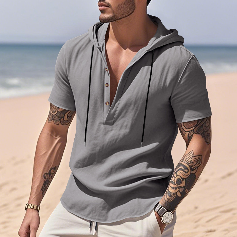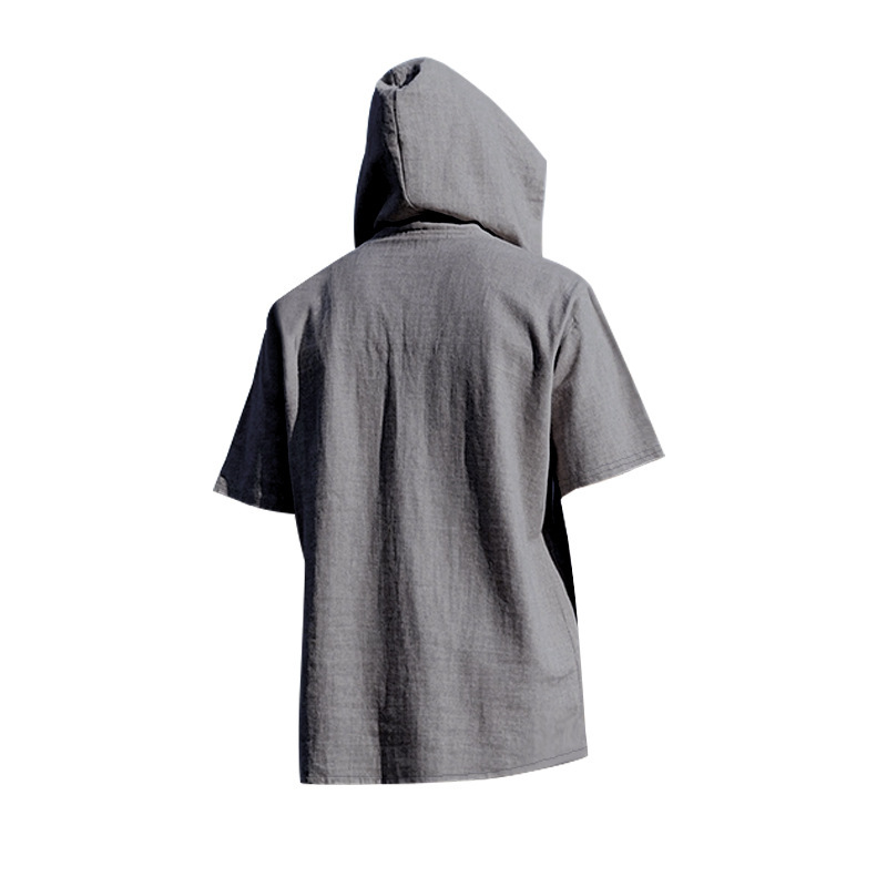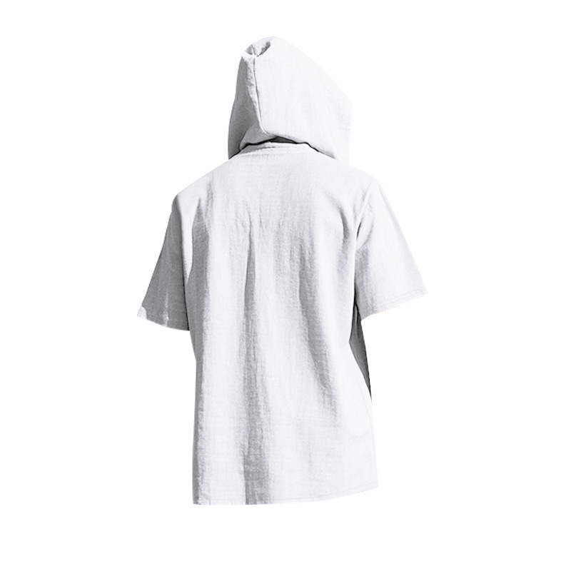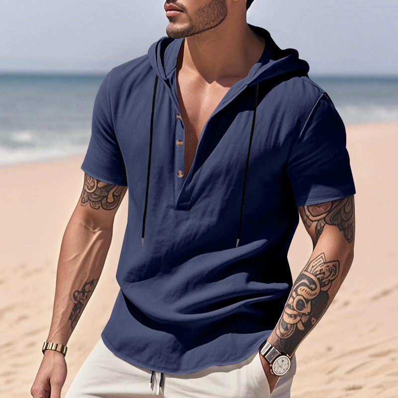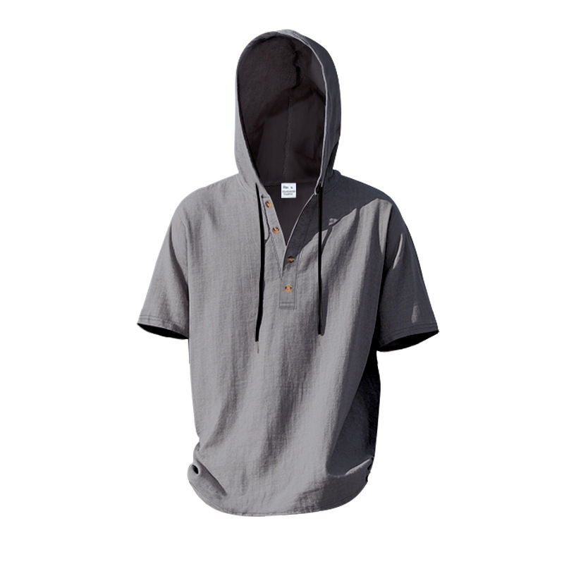 产品风格,美式夏季男士亚麻宽松休闲连帽亨利衫短袖