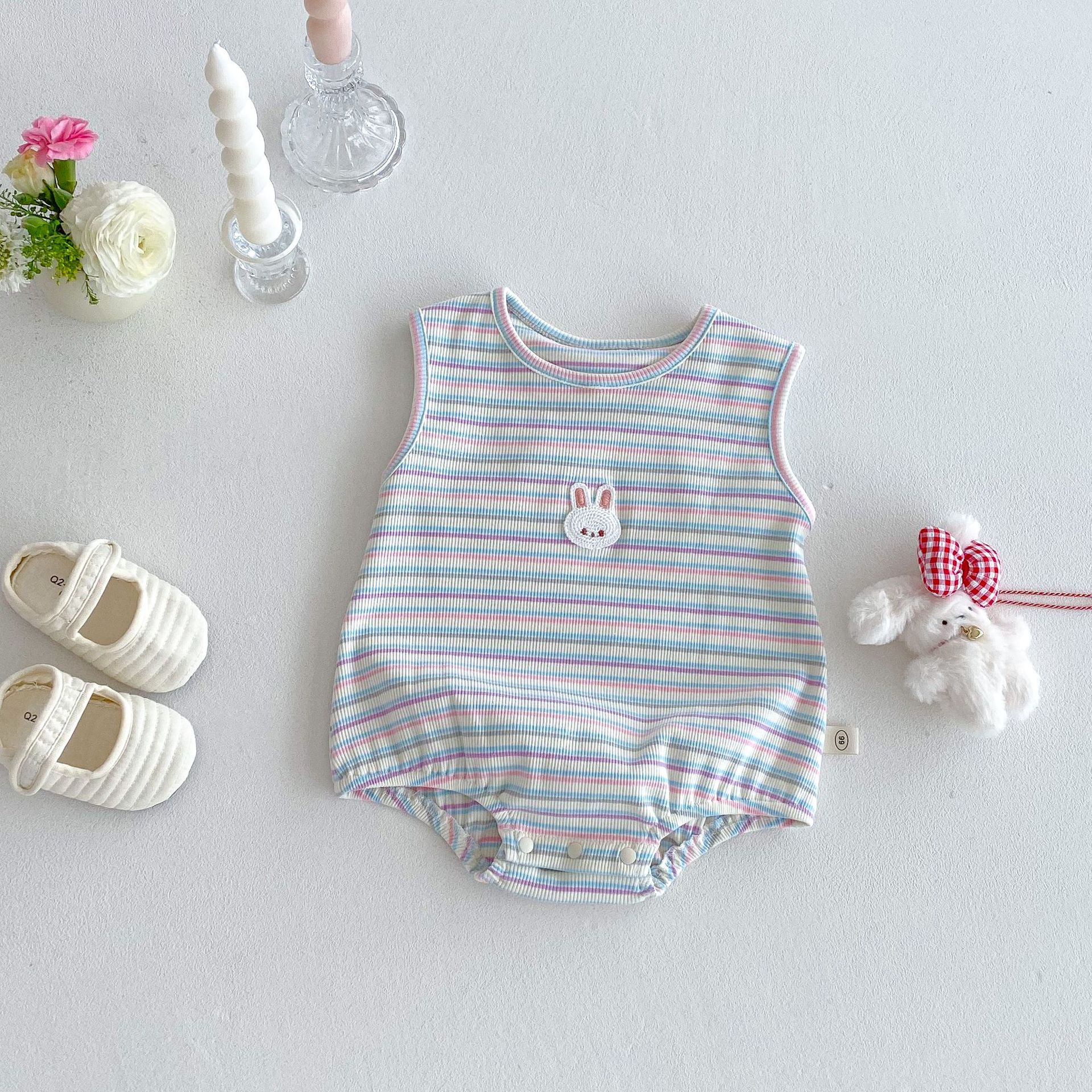 아기 줄무늬 가방 방귀 옷 2025 새로운 여름 신생아 외출 옷 유행 여성 아기 한국 스타일 토끼 등반 옷