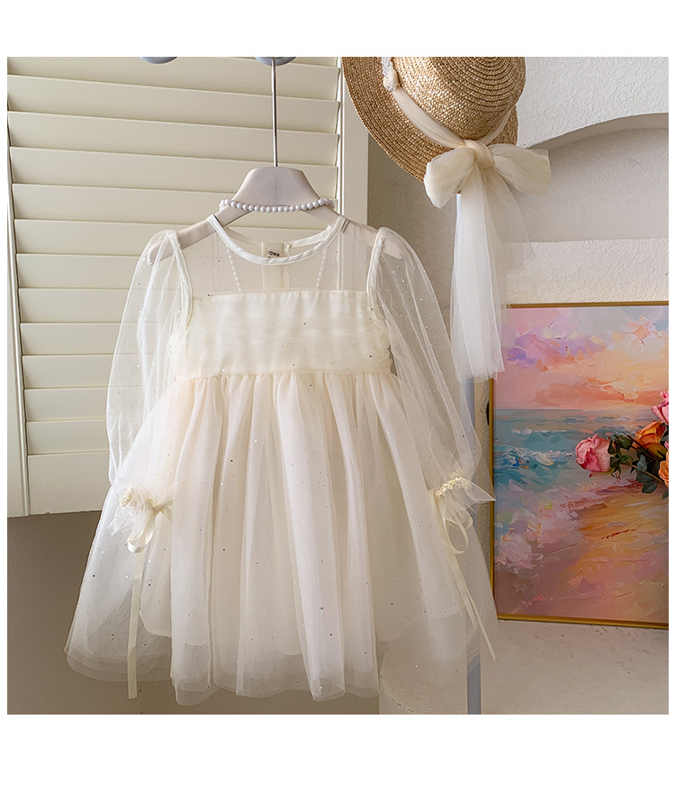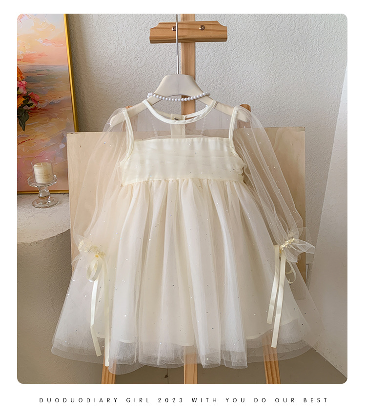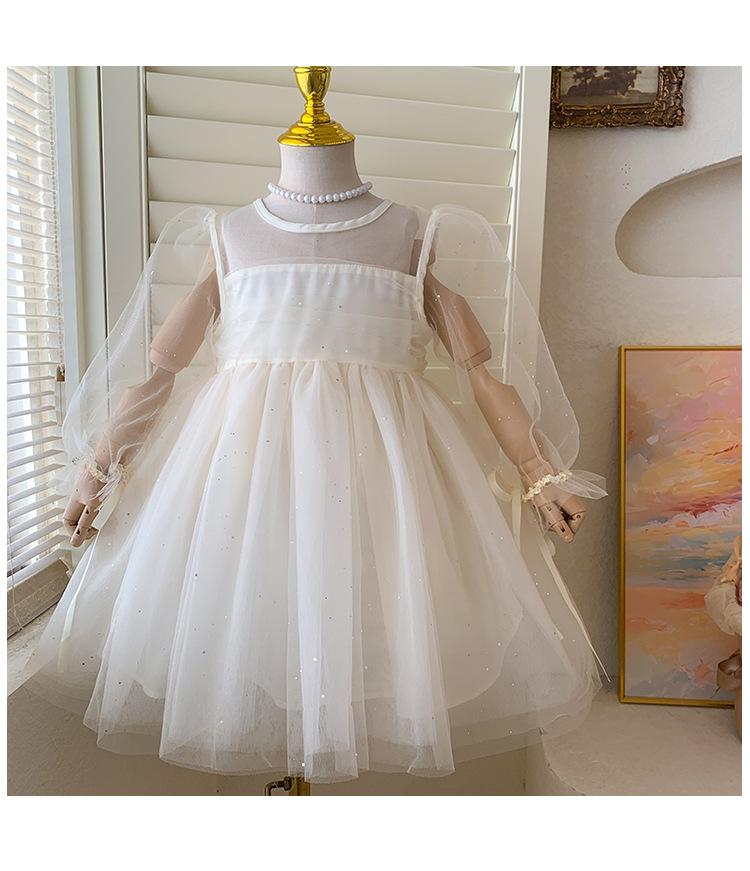 소녀 2025 봄과 여름 긴 소매 퍼프 소매 원피스 반짝이는 베일 원피스 아기 소녀 공주 원피스 생일 원피스
