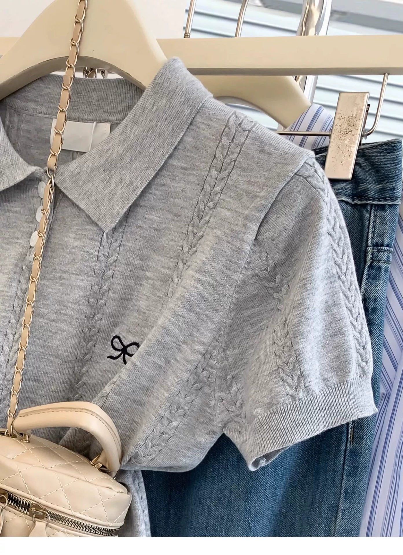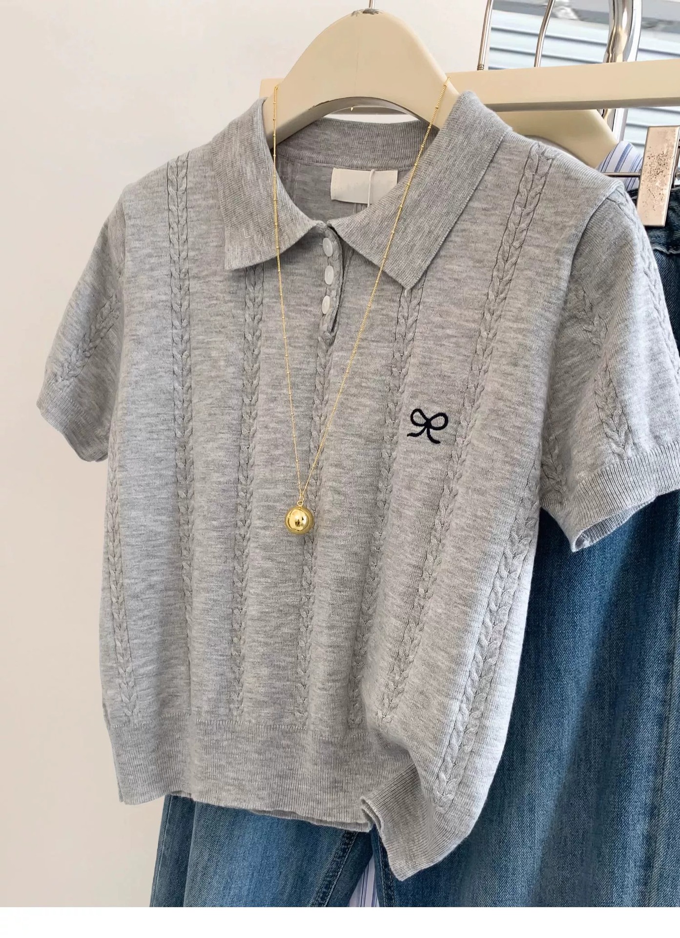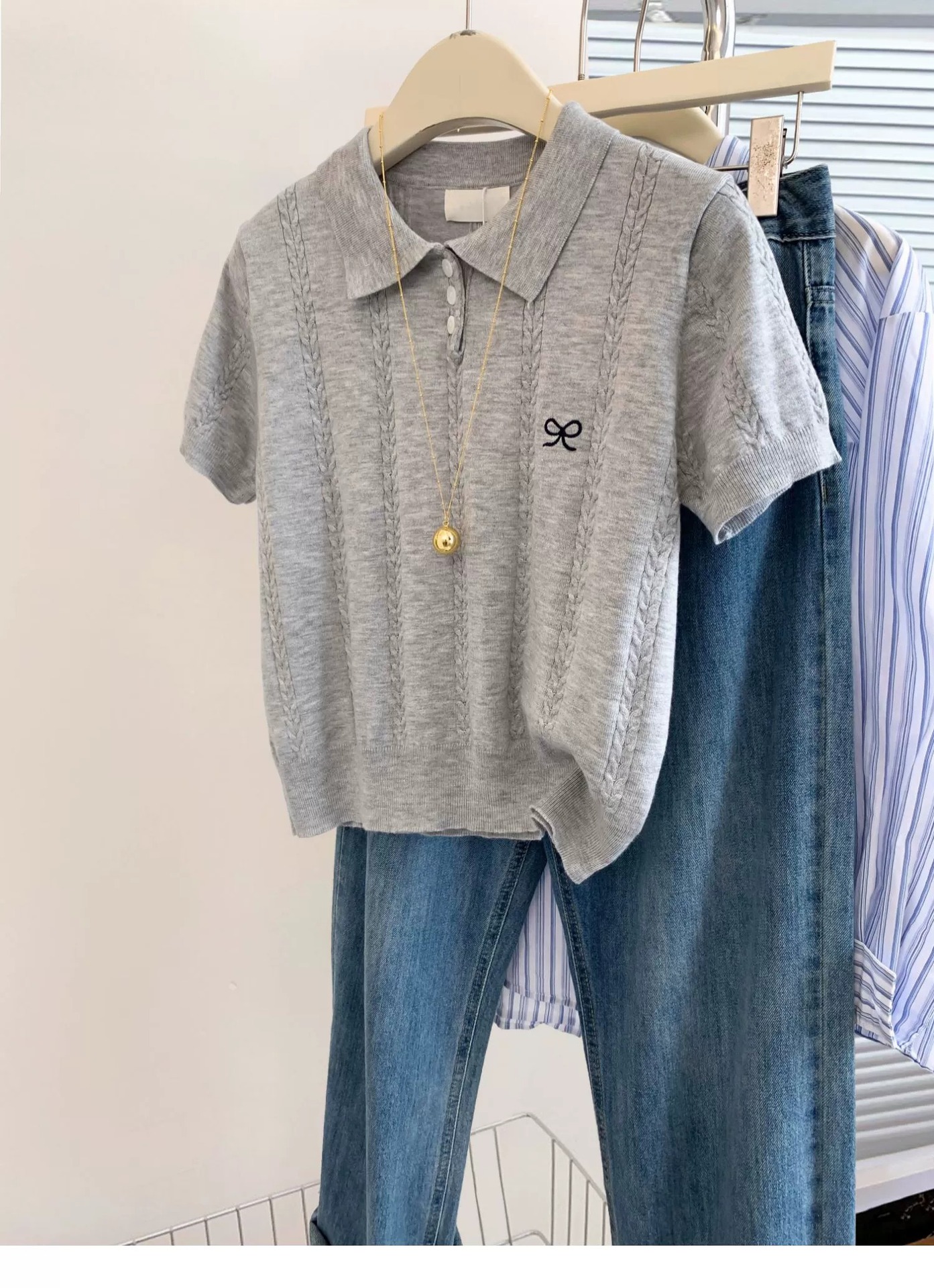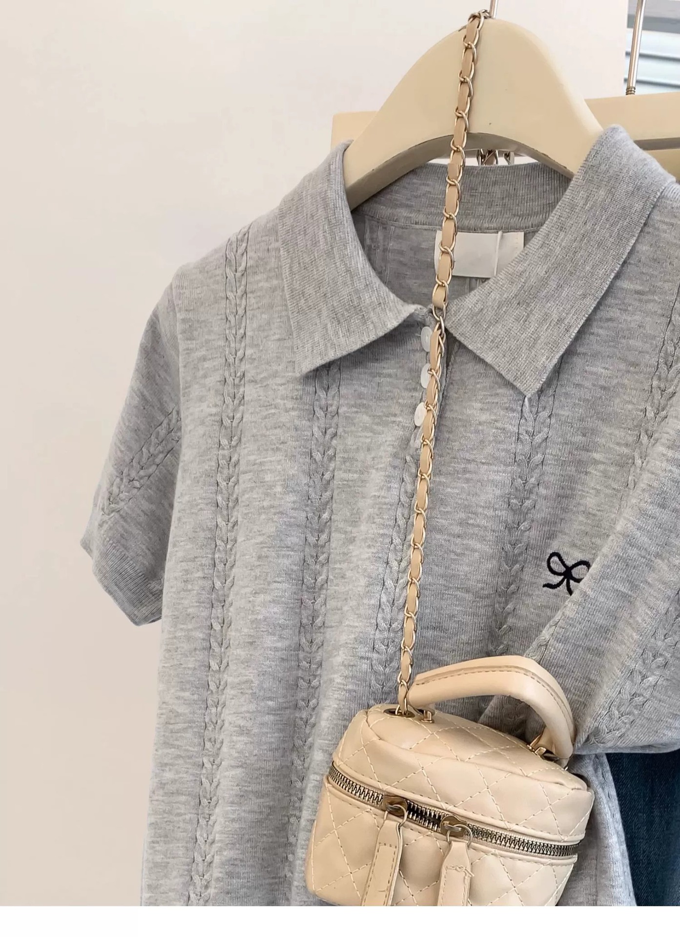 회색 어깨 폴로 목 활 니트 반팔 티셔츠 여성용 2025 여름 슬림 룩 우아한 엘 아이스 실크 탑스토어 가기