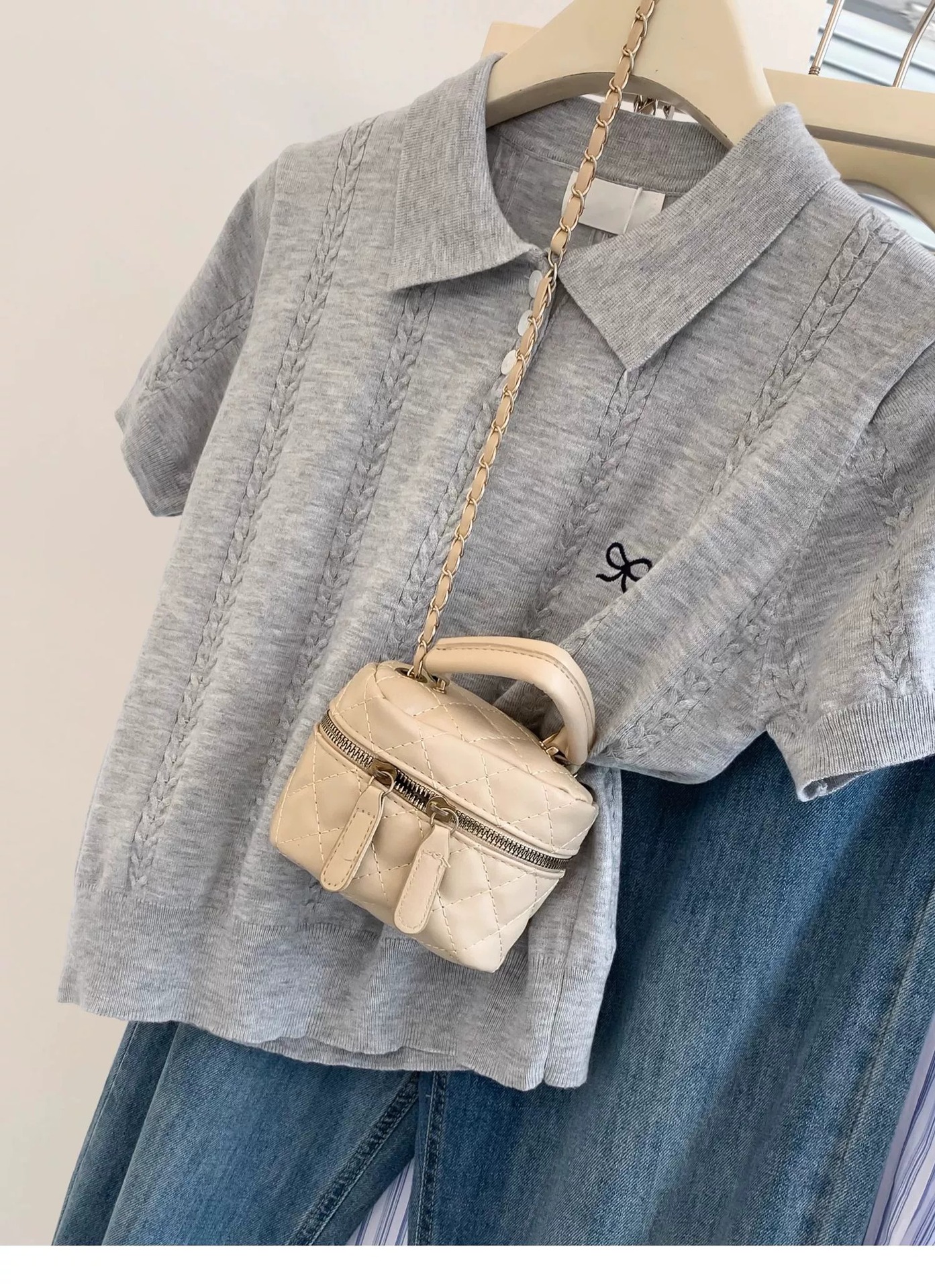 회색 어깨 폴로 목 활 니트 반팔 티셔츠 여성용 2025 여름 슬림 룩 우아한 엘 아이스 실크 탑