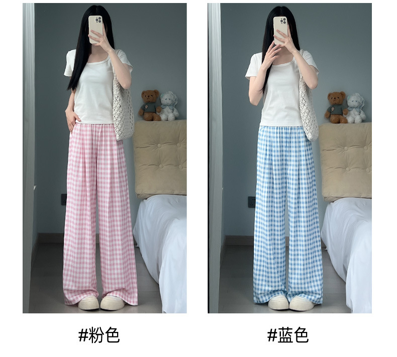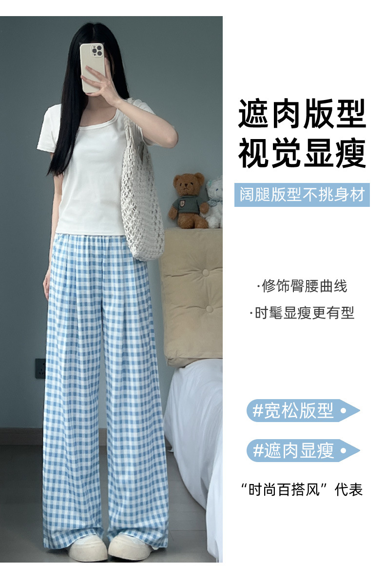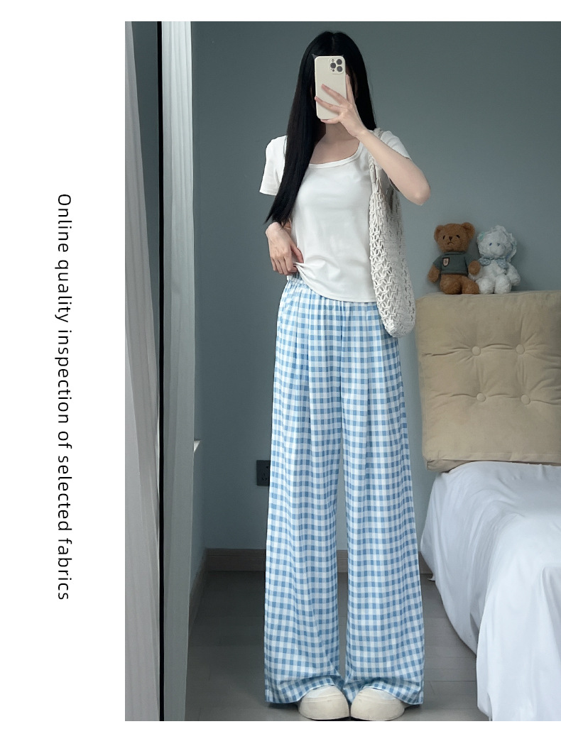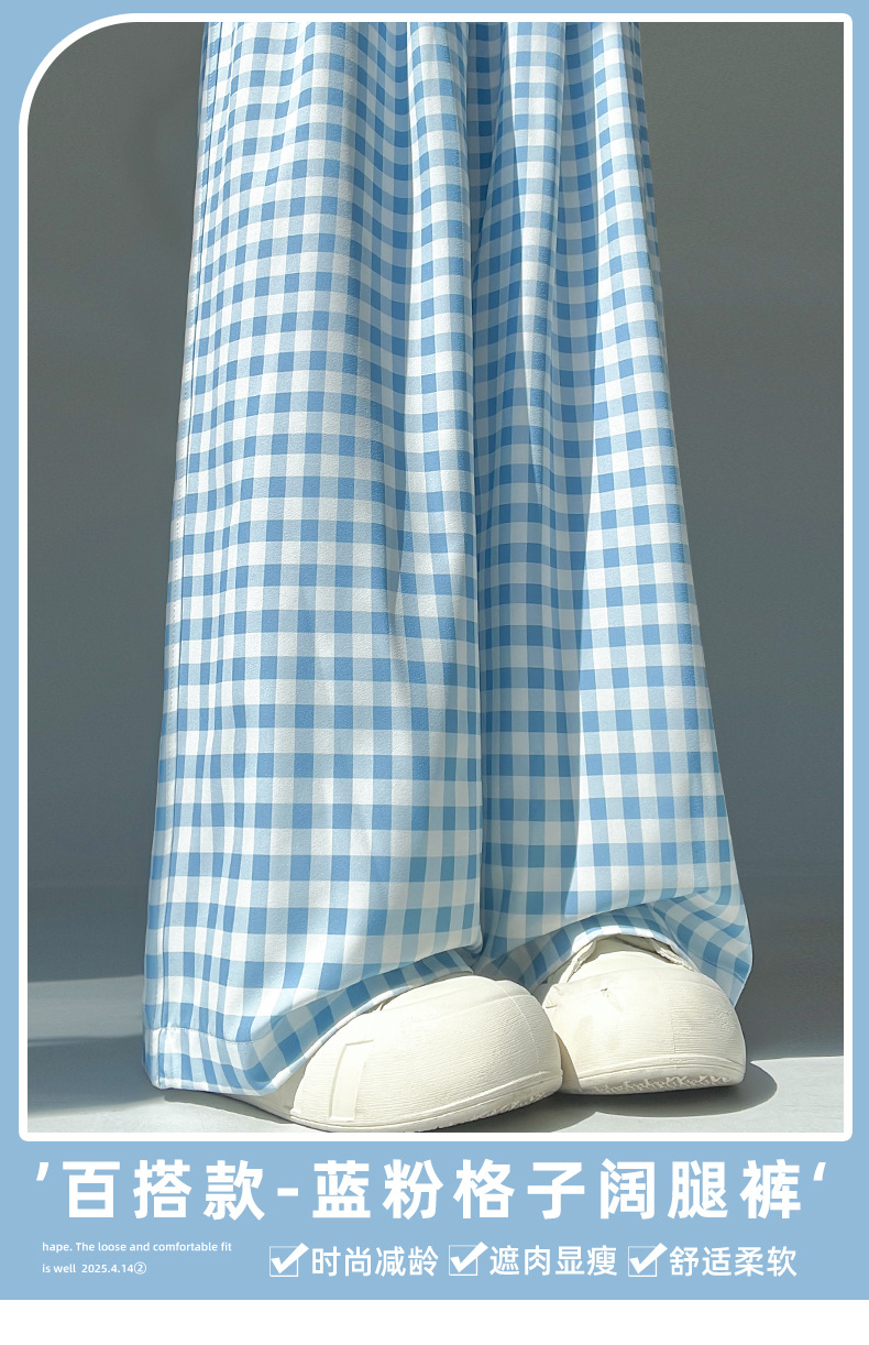 파란 격자 무늬 바지 여자 여름 2025 새로운 높은 허리 느슨한 슬리밍 스트레이트 다리 바지 한국 캐주얼 게으른 넓은 다리 바지