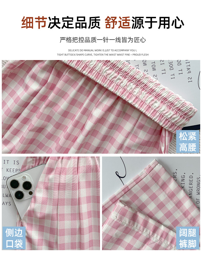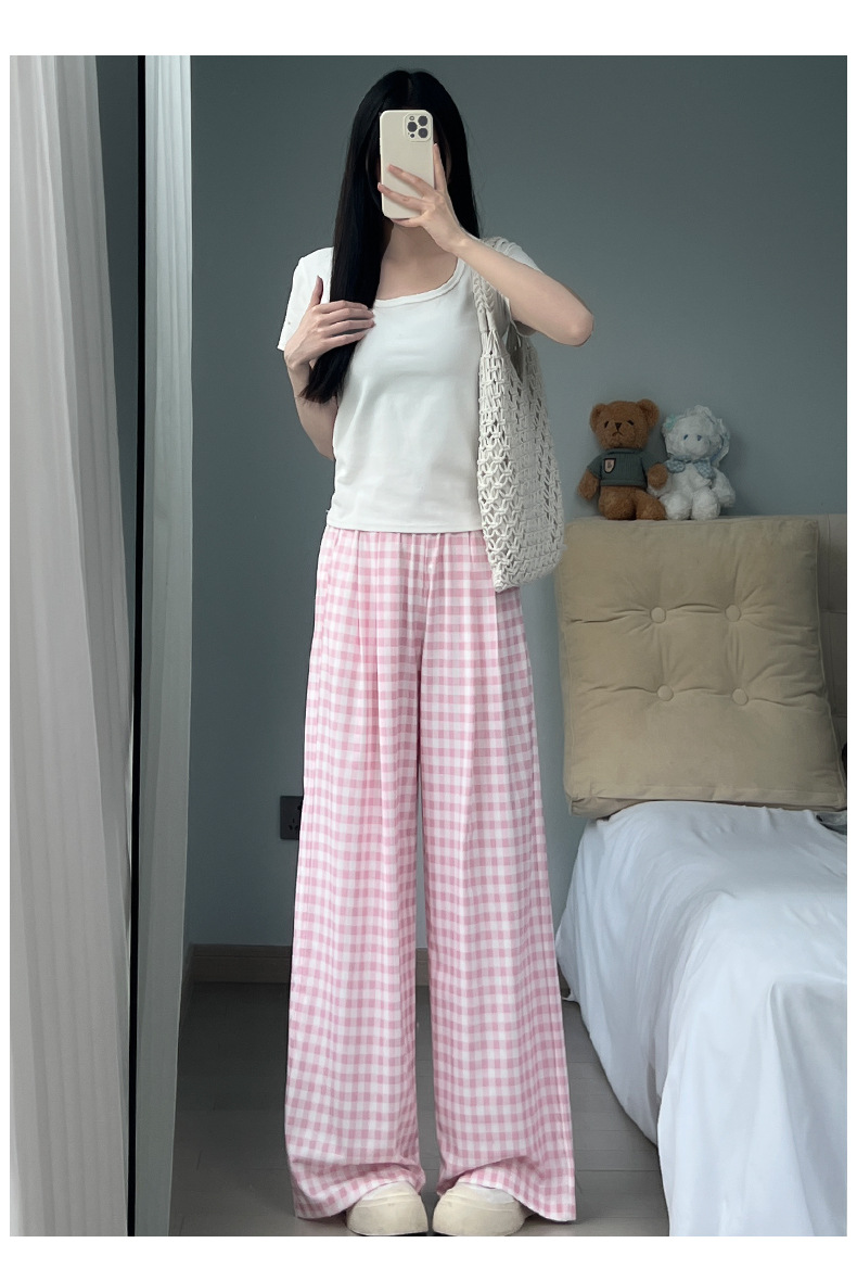 파란 격자 무늬 바지 여자 여름 2025 새로운 높은 허리 느슨한 슬리밍 스트레이트 다리 바지 한국 캐주얼 게으른 넓은 다리 바지스토어 가기