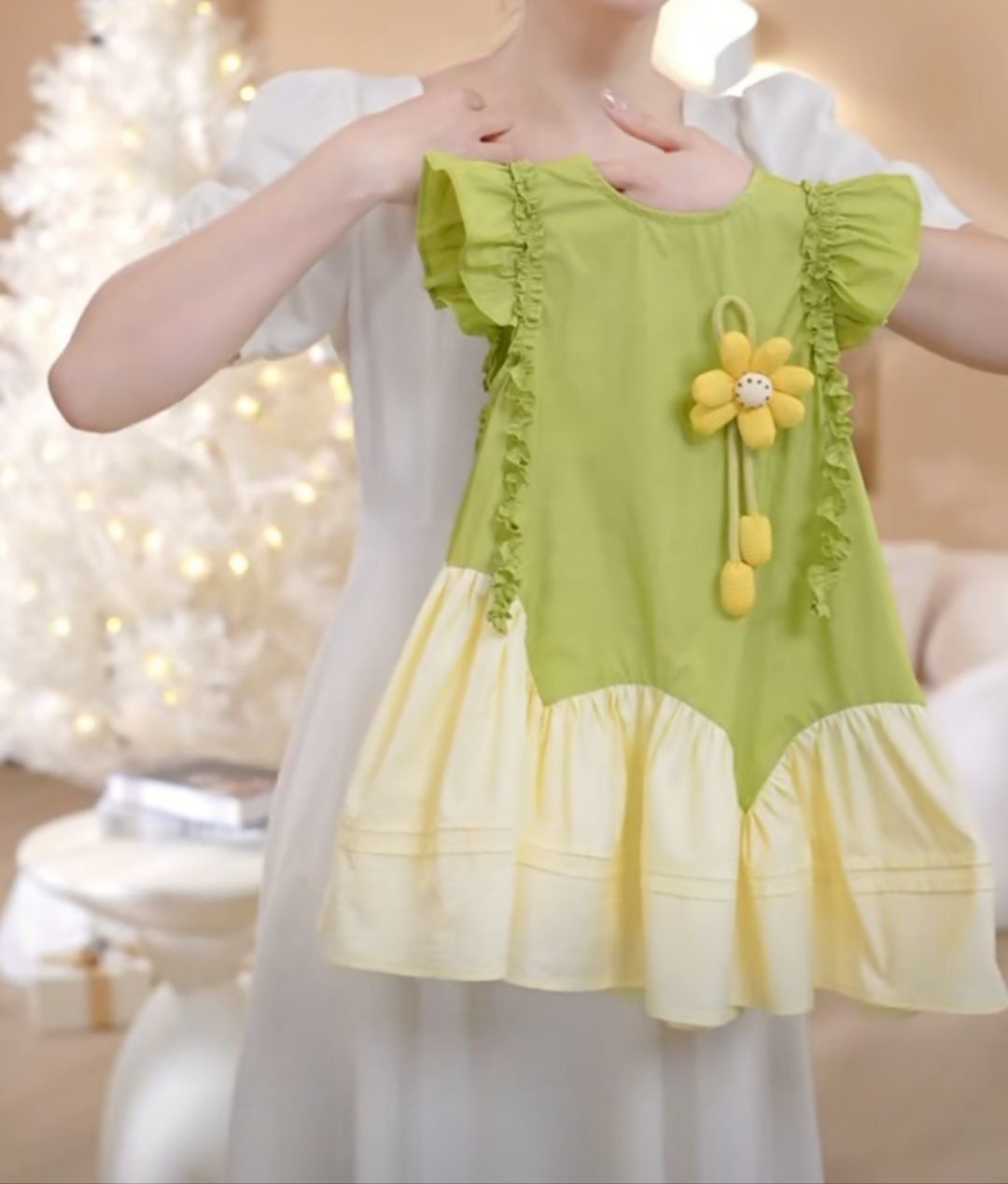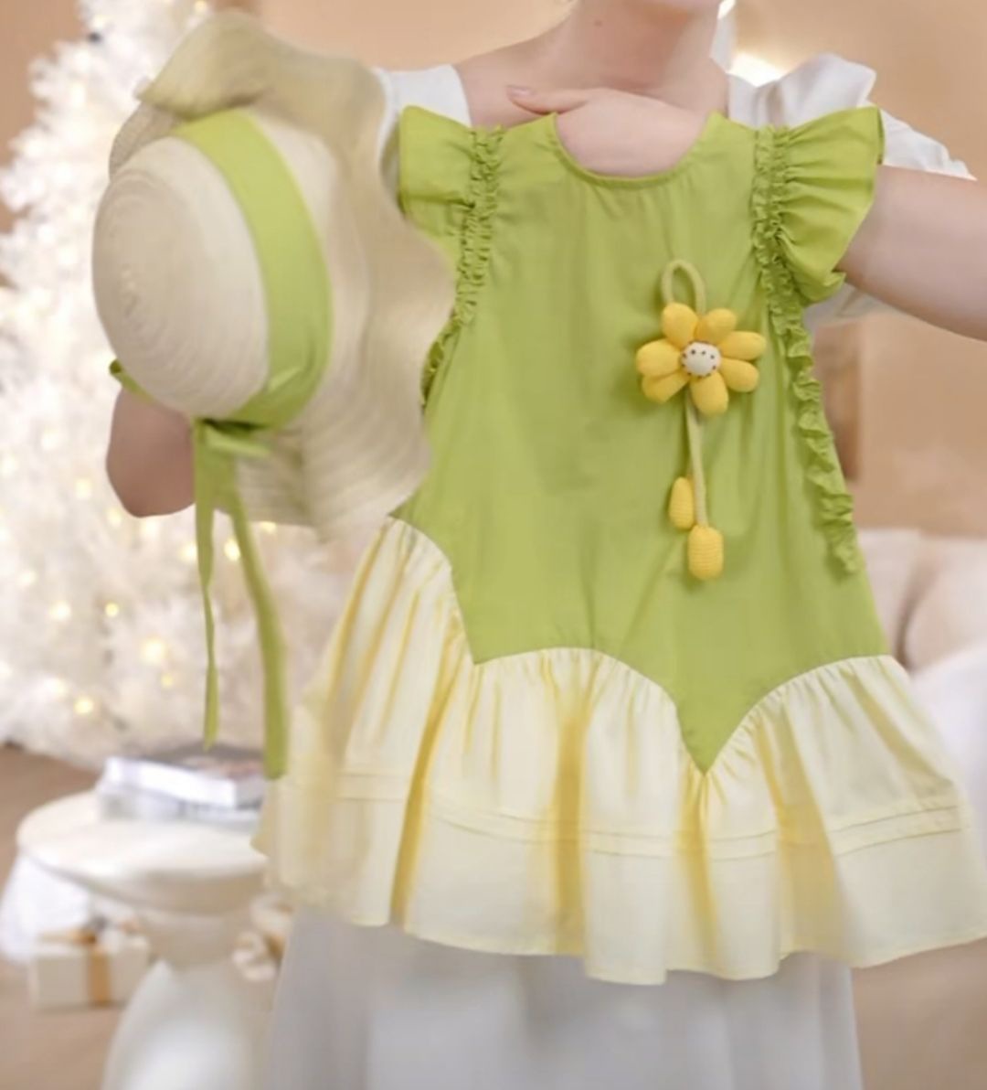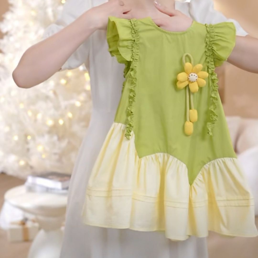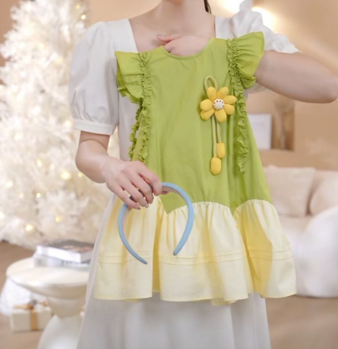 • 옐로우 그린 플라잉 슬리브 플라워 드레스