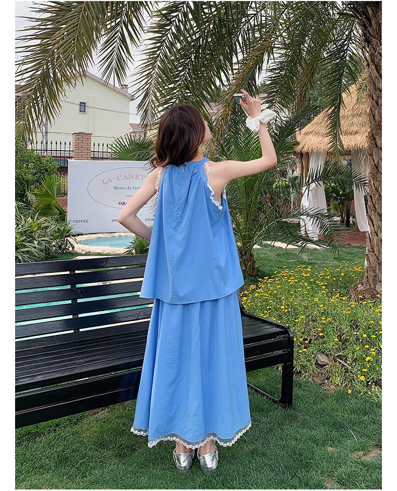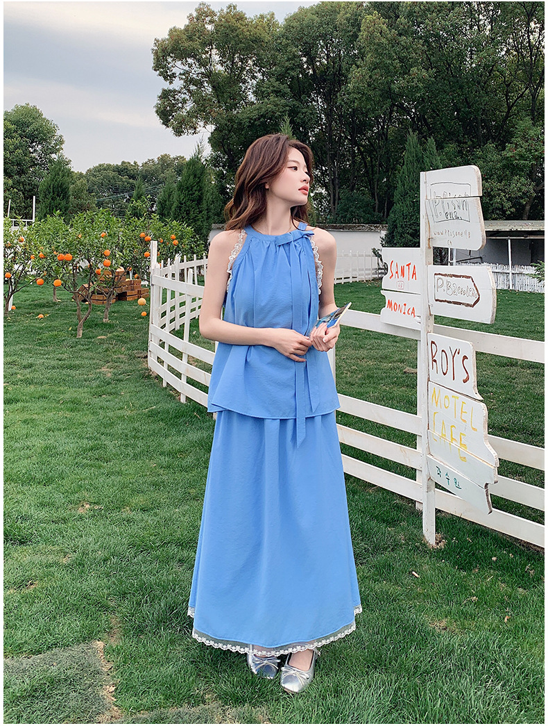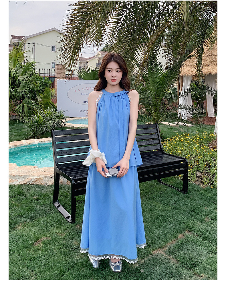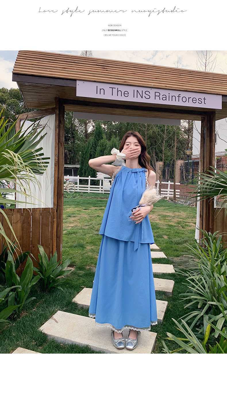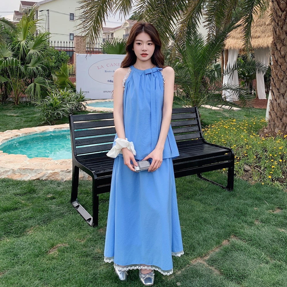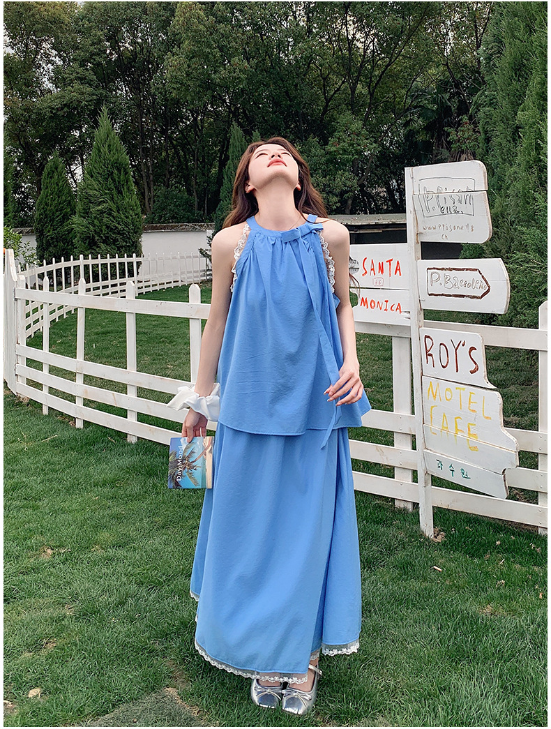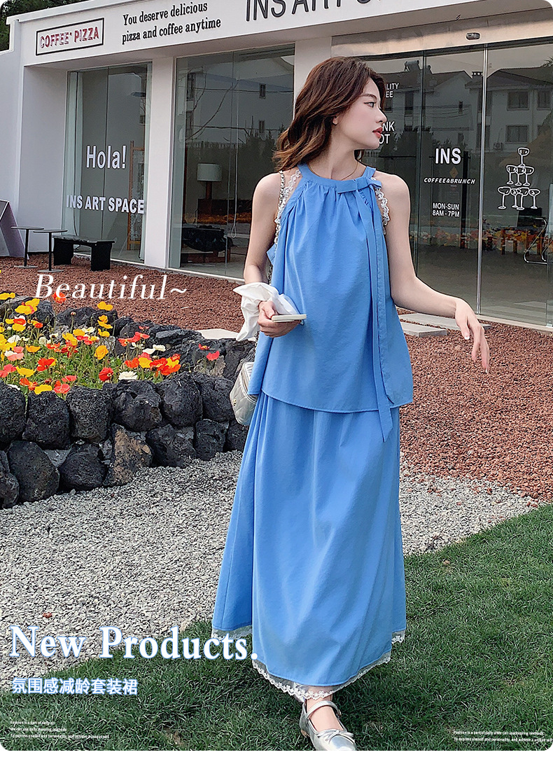 블루 레이스 스티칭 원피스 여자 2025 여름 새로운 도착 활 목 탑 치마 투피스 세트