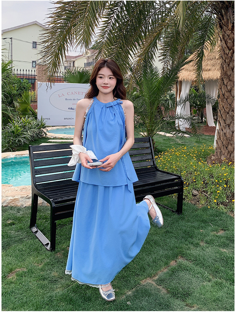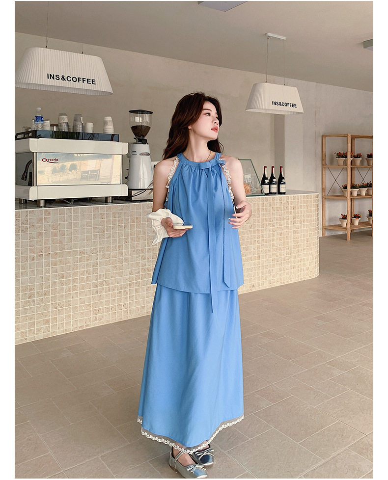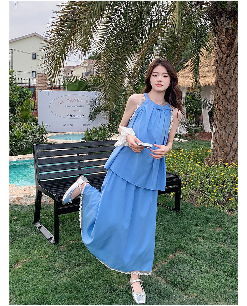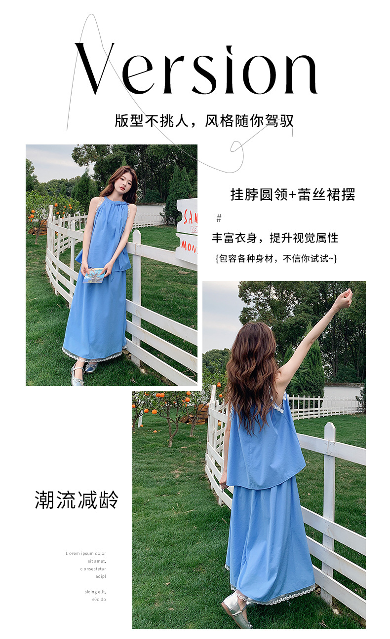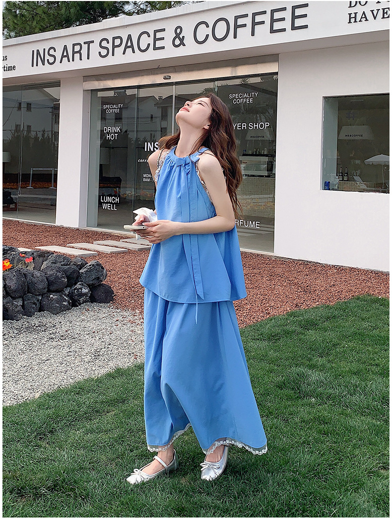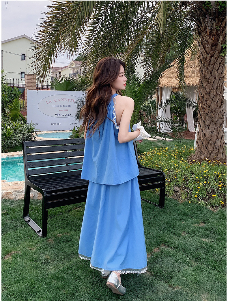 블루 레이스 스티칭 원피스 여자 2025 여름 새로운 도착 활 목 탑 치마 투피스 세트