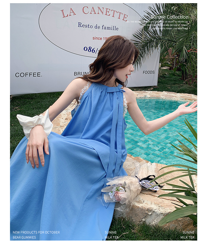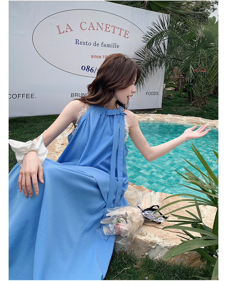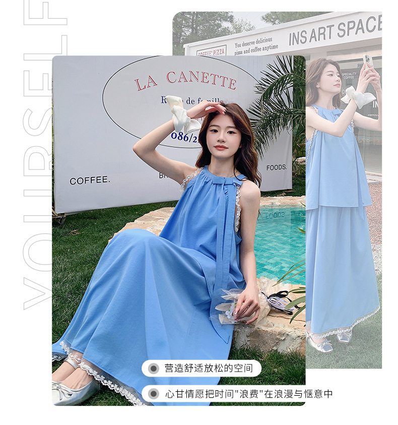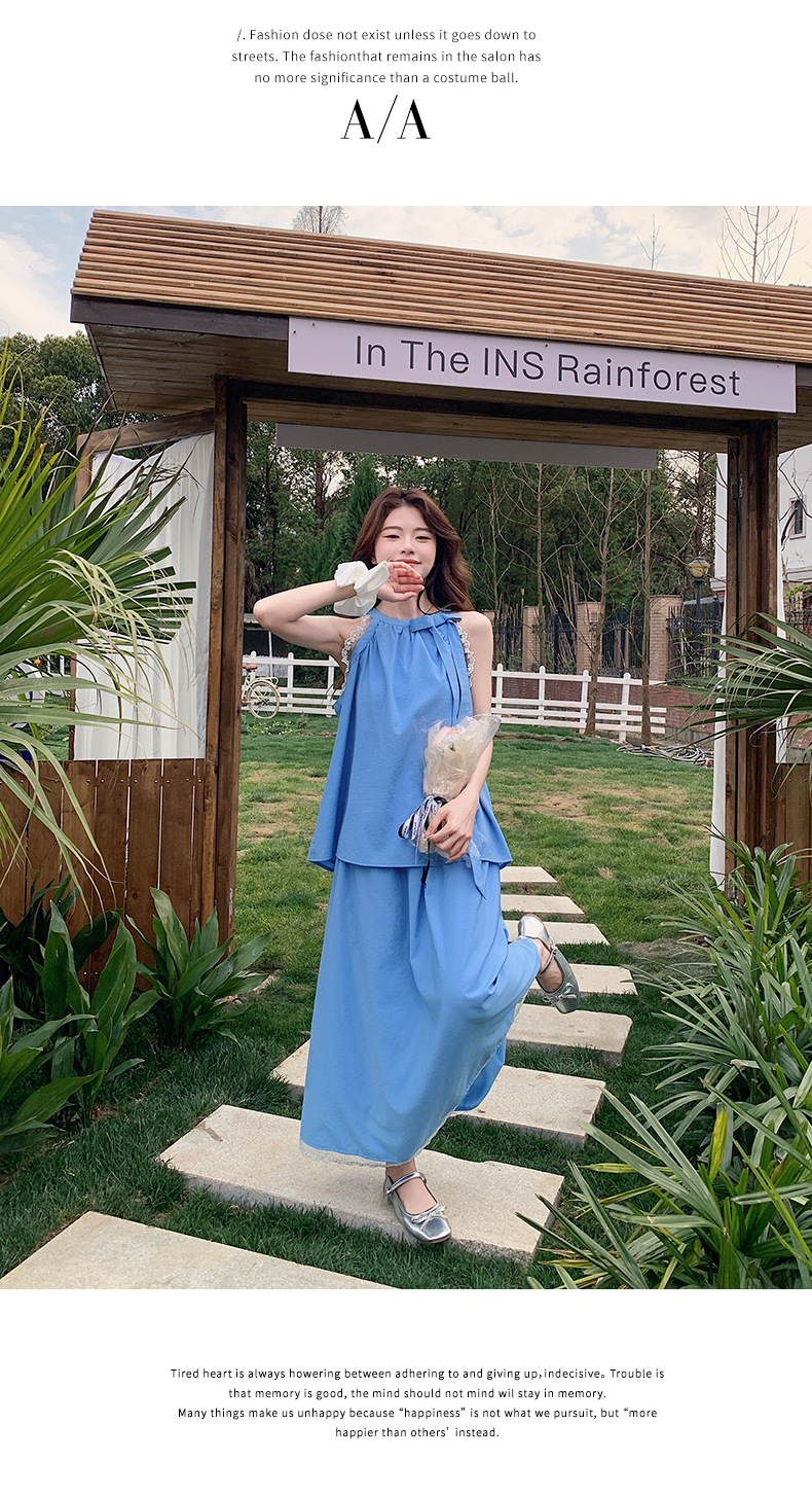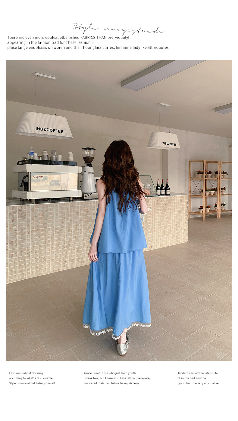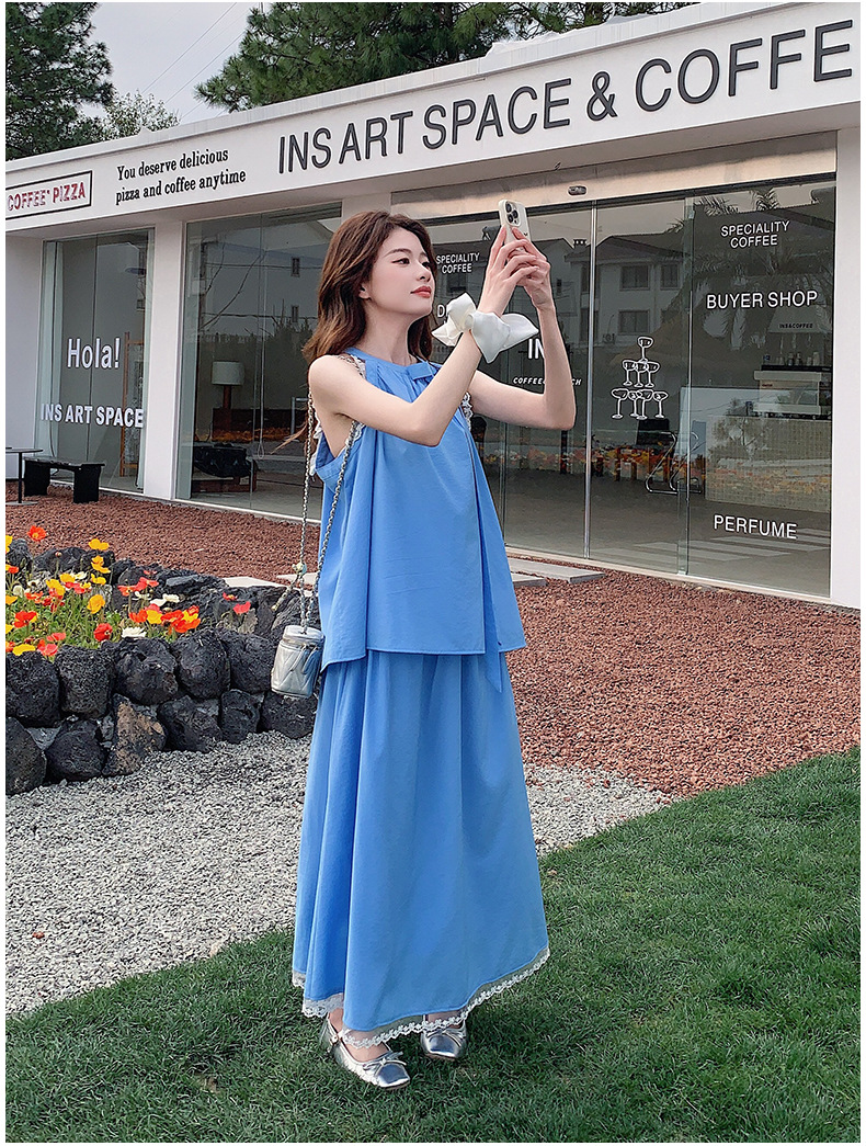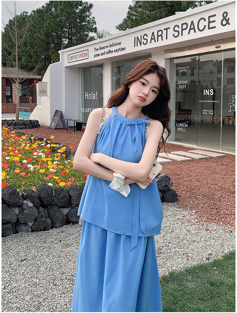 블루 레이스 스티칭 원피스 여자 2025 여름 새로운 도착 활 목 탑 치마 투피스 세트