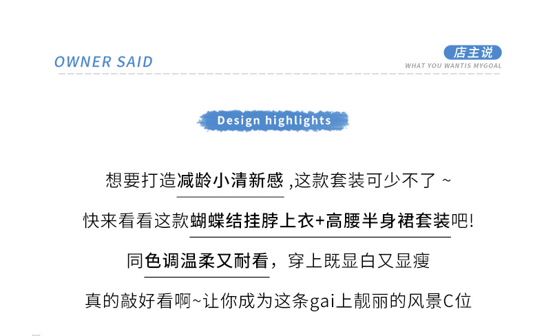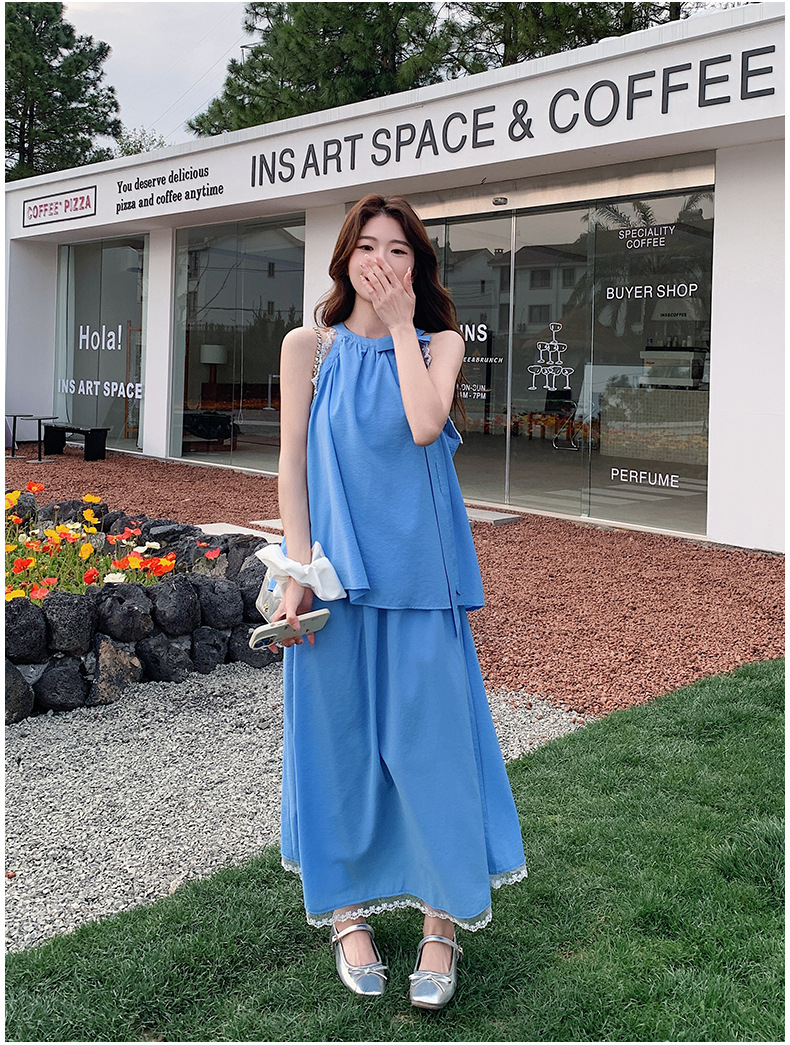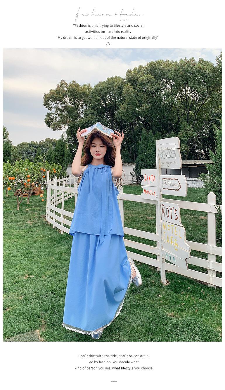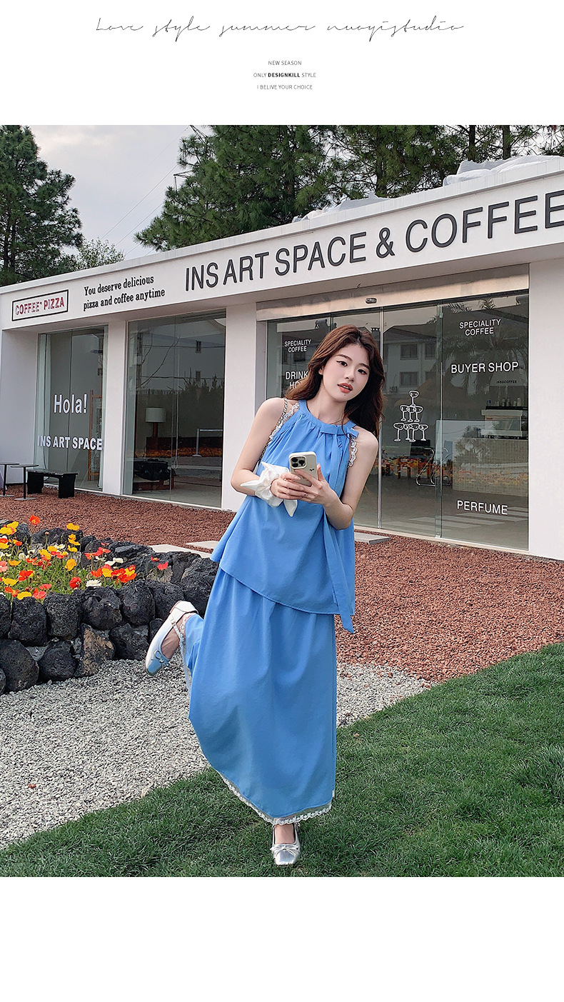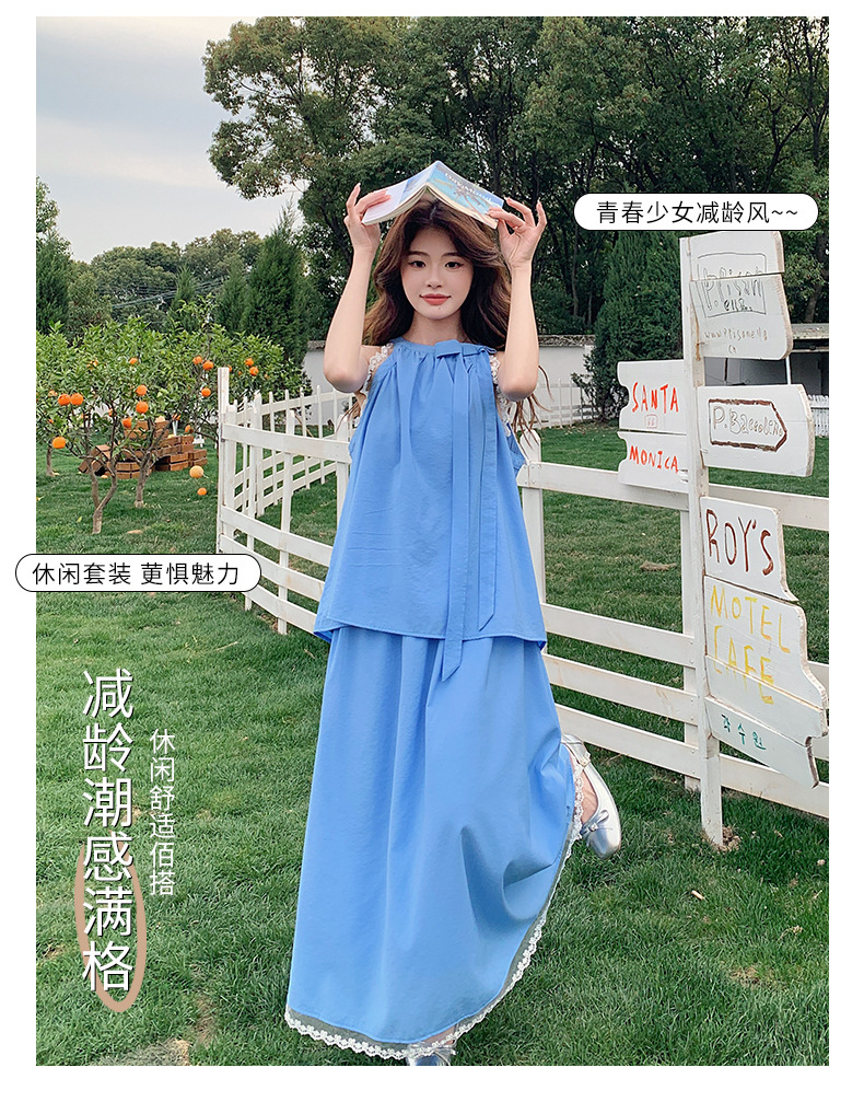 블루 레이스 스티칭 원피스 여자 2025 여름 새로운 도착 활 목 탑 치마 투피스 세트스토어 가기