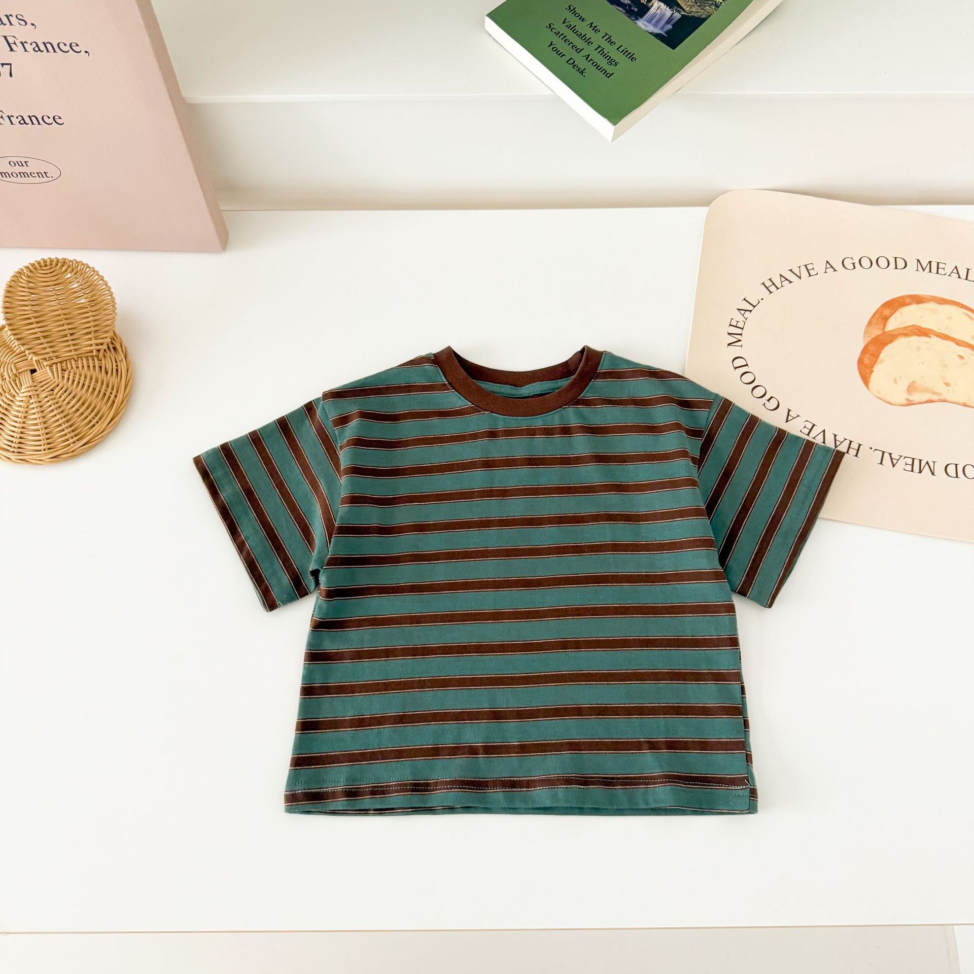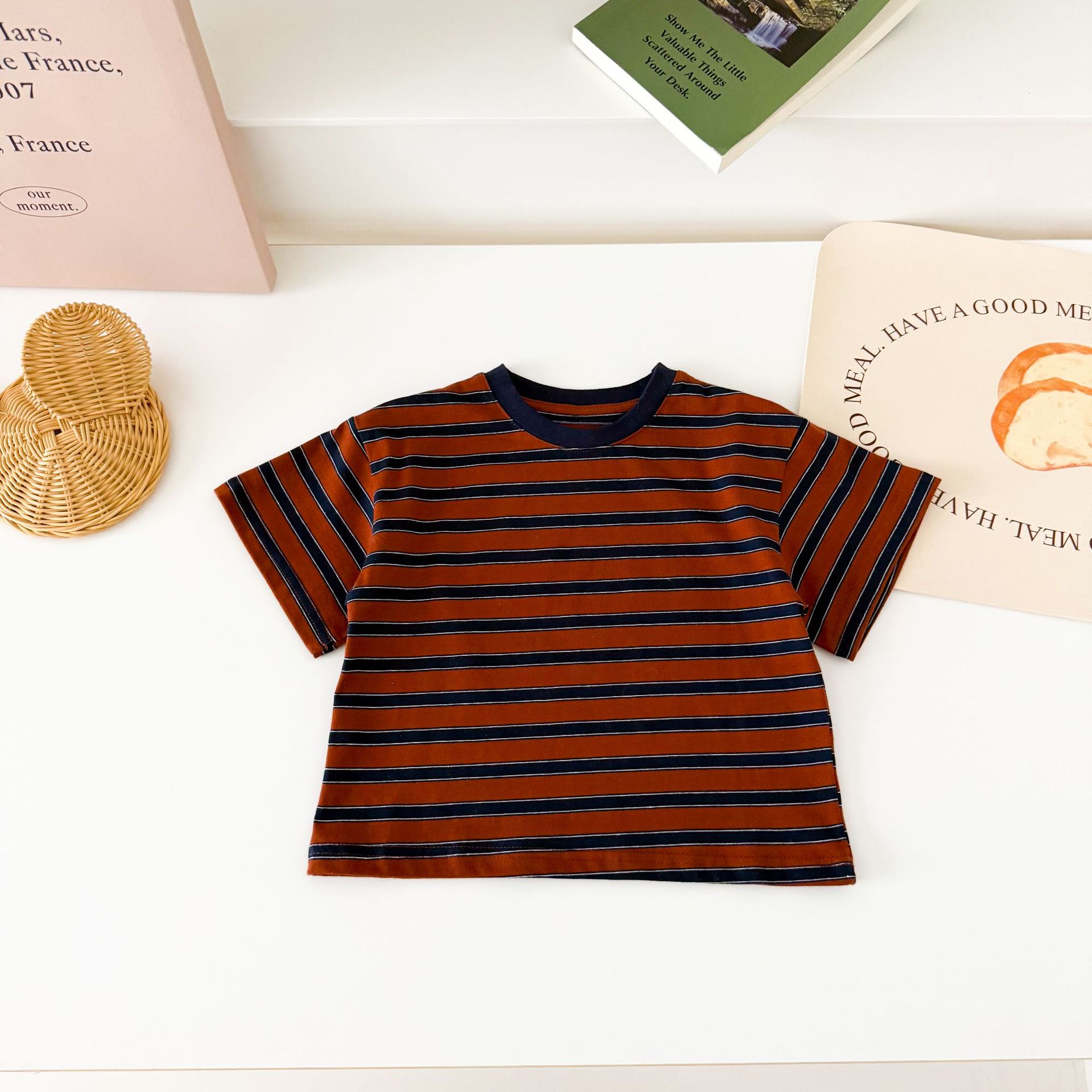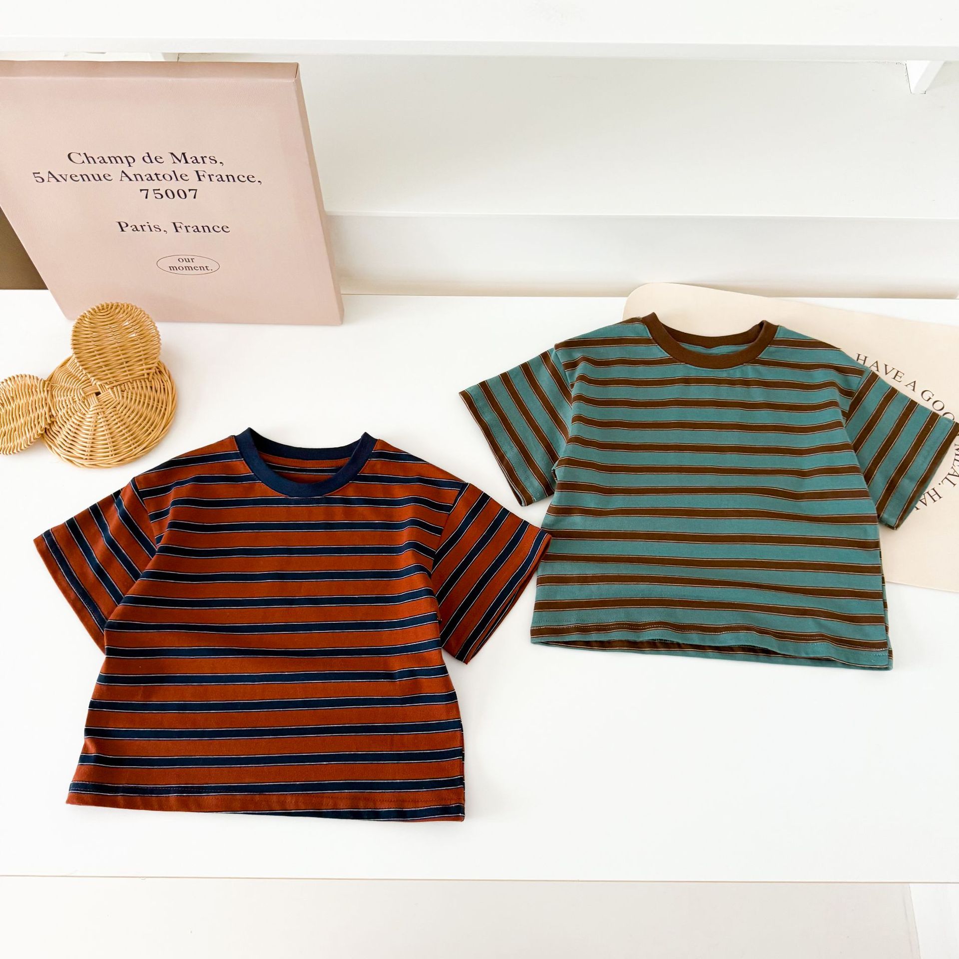 Ins 한국어 버전 여름 줄무늬 반팔 티셔츠 소년과 소녀를위한 베이비 퓨어 코튼 다목적 탑 레트로 라운드 넥 대비 컬러 티셔츠