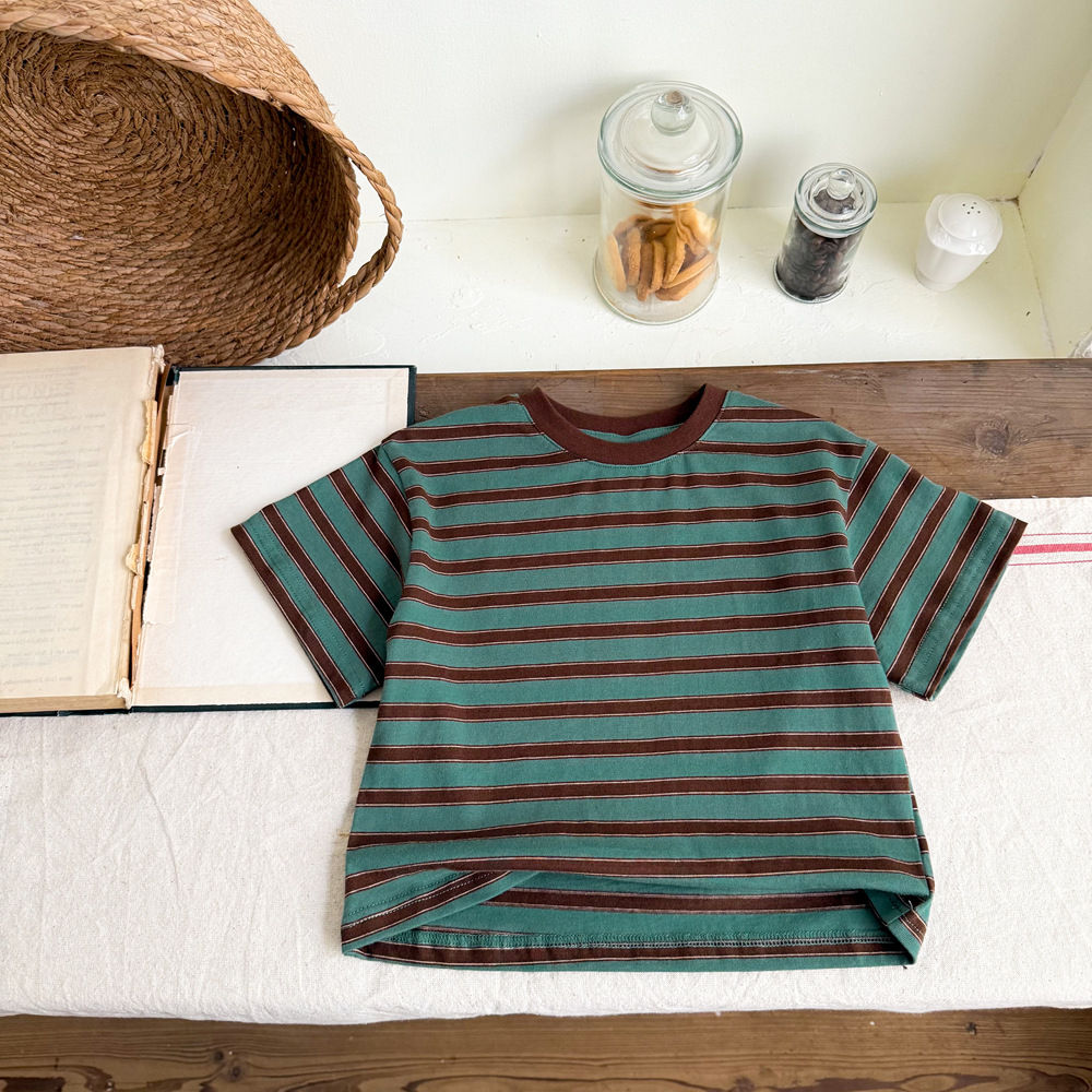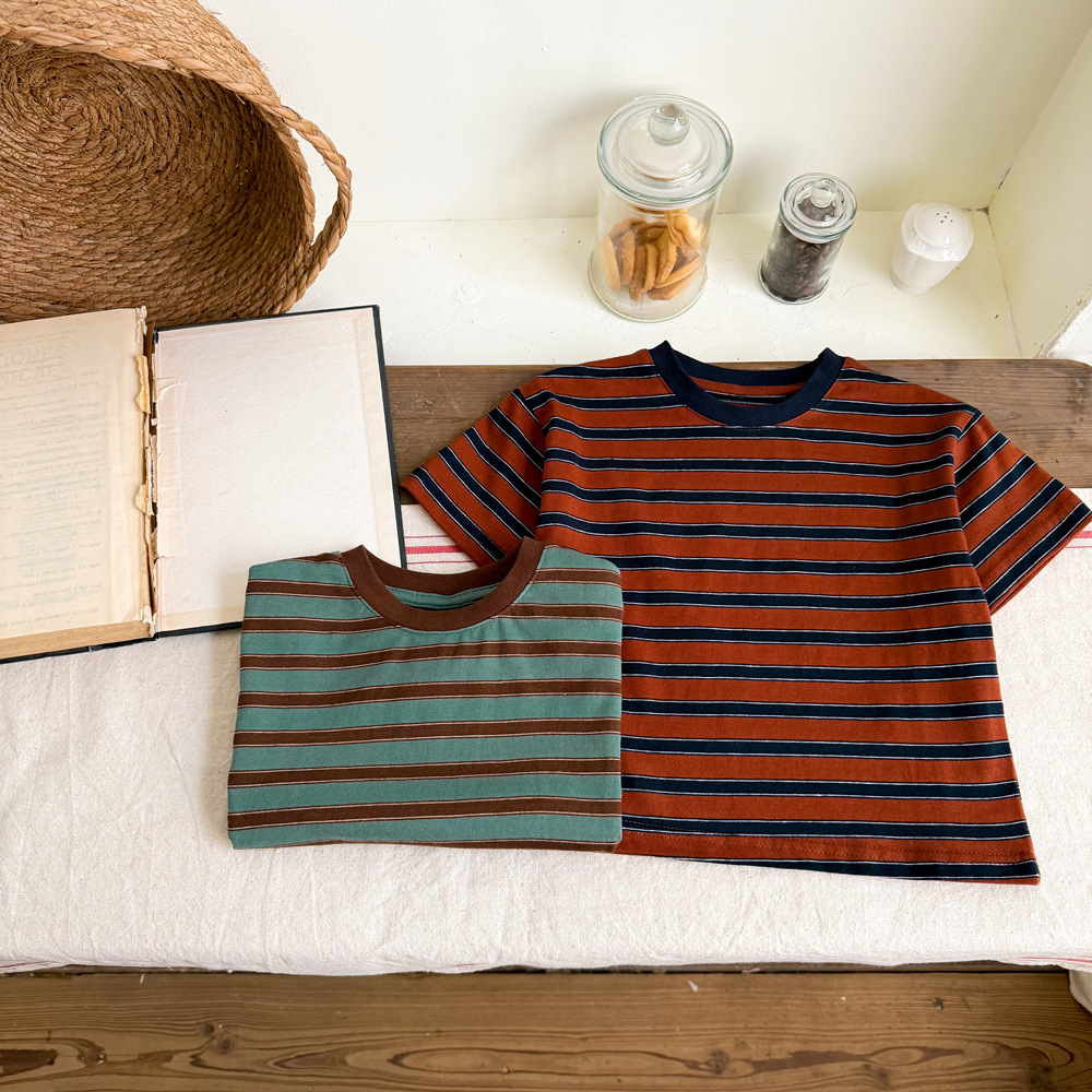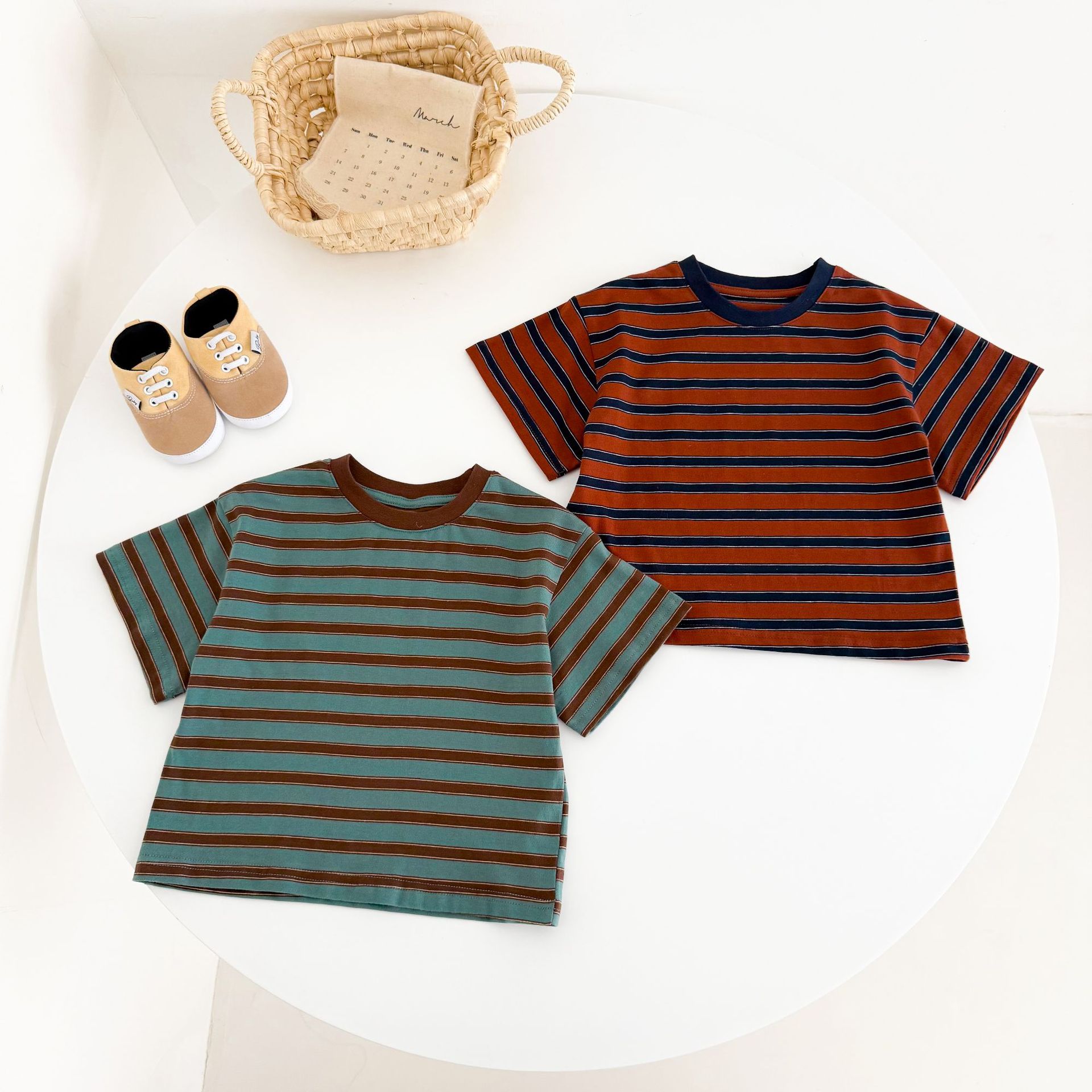 Ins 한국어 버전 여름 줄무늬 반팔 티셔츠 소년과 소녀를위한 베이비 퓨어 코튼 다목적 탑 레트로 라운드 넥 대비 컬러 티셔츠