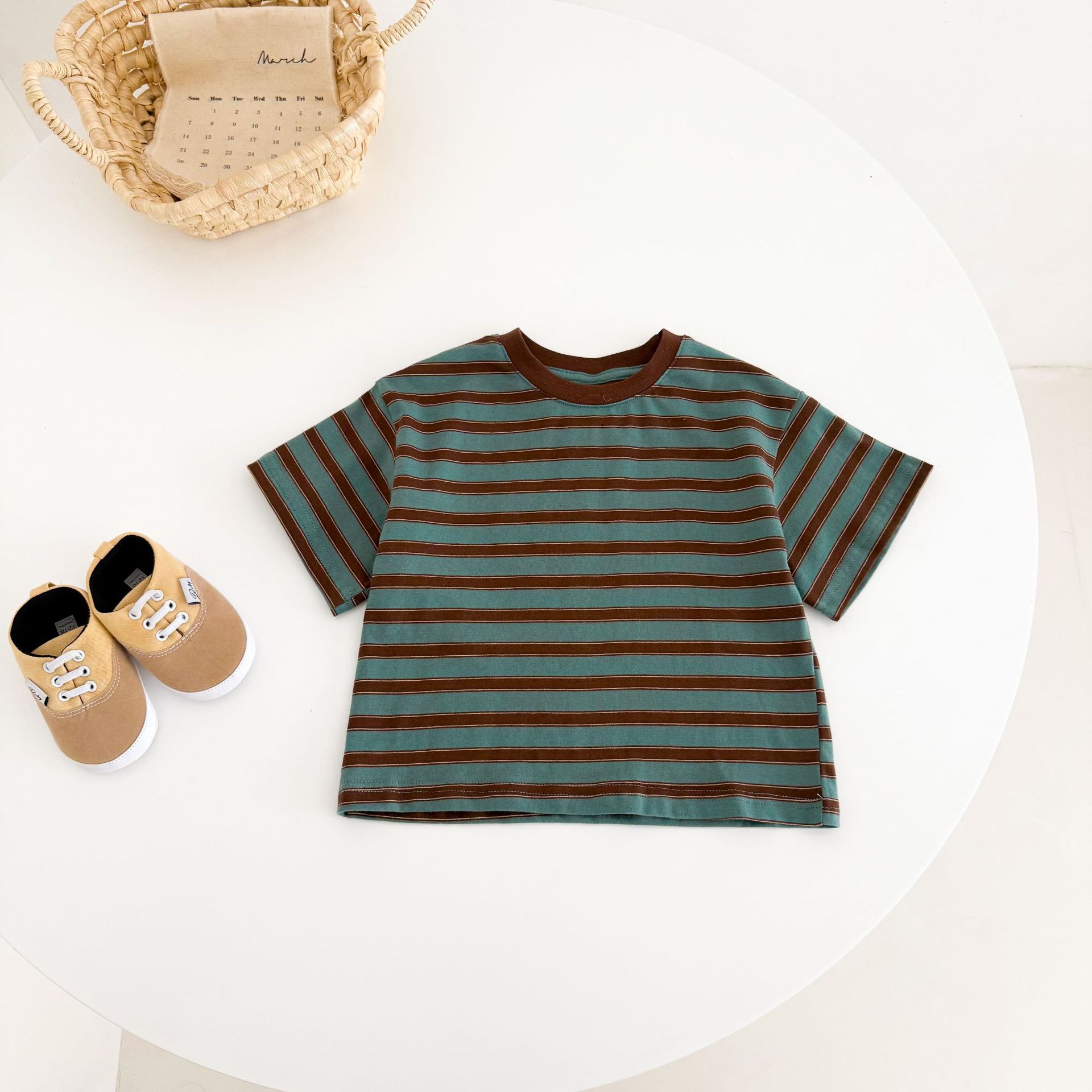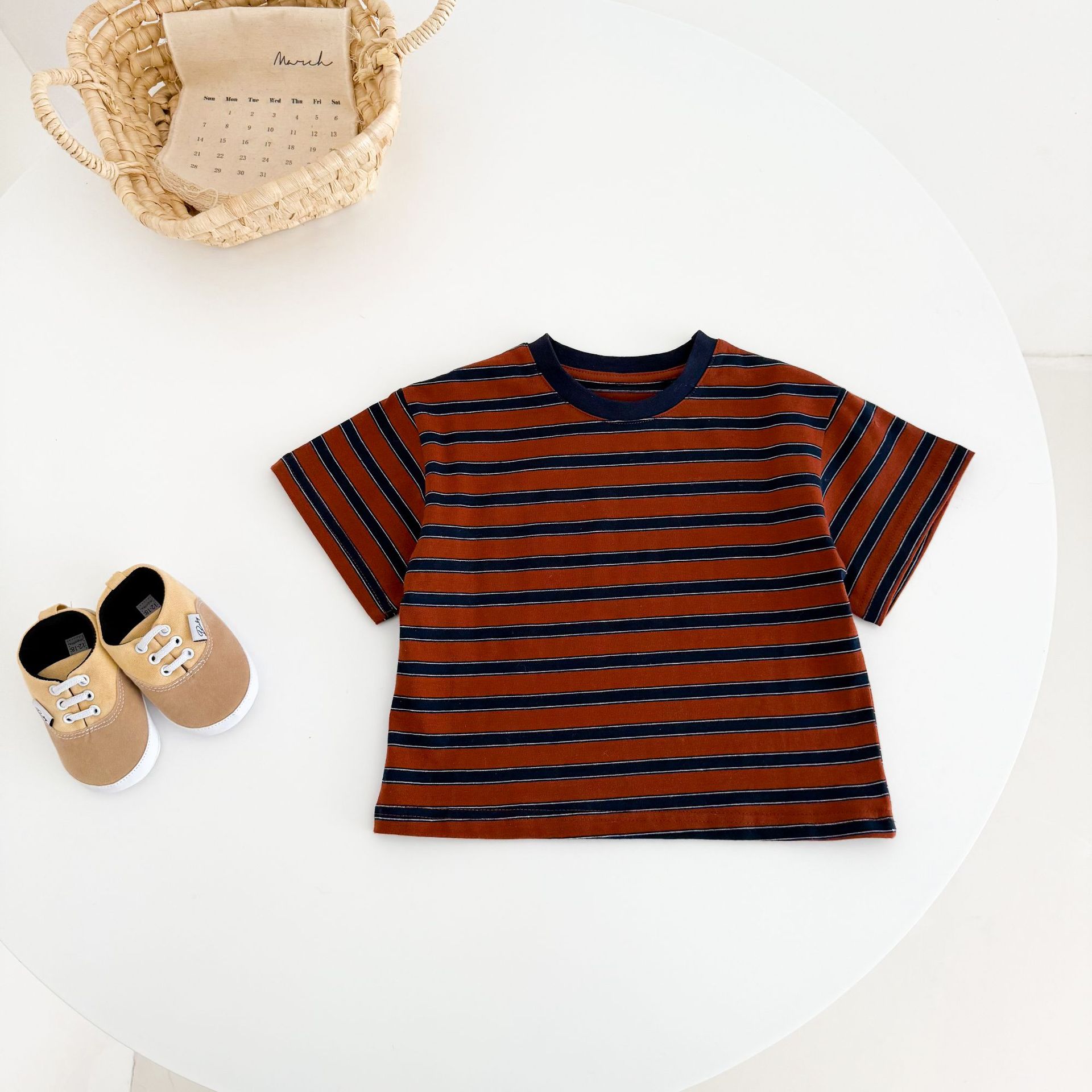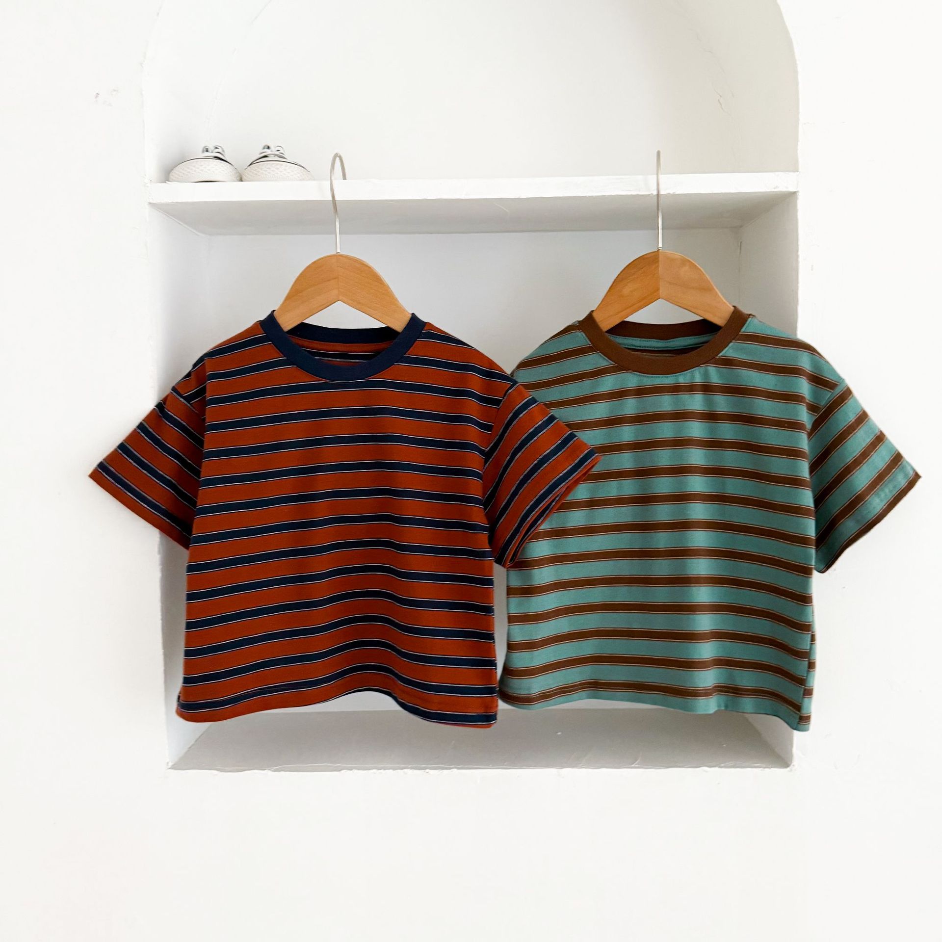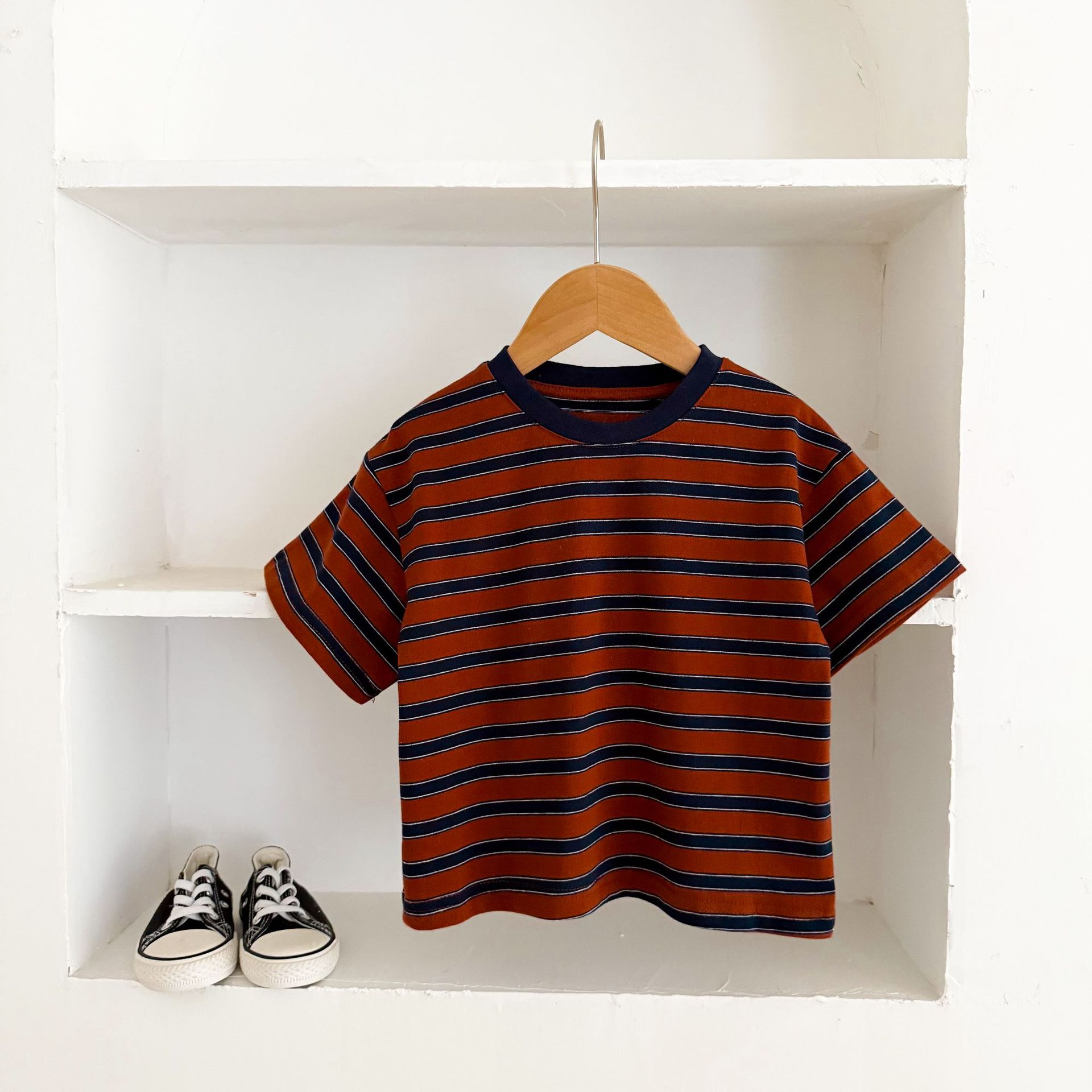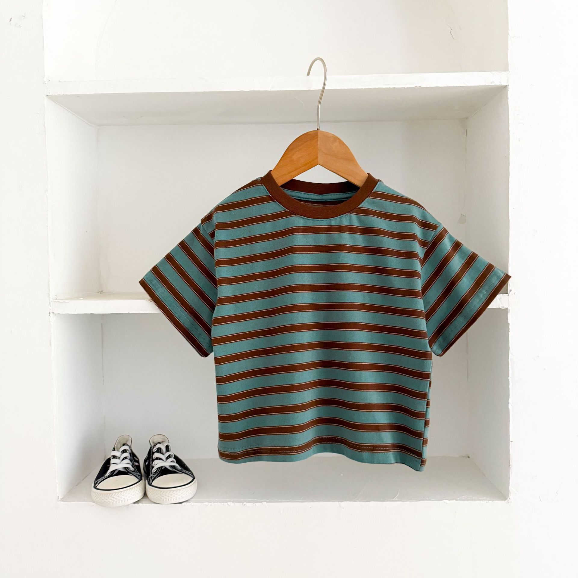 Ins 한국어 버전 여름 줄무늬 반팔 티셔츠 소년과 소녀를위한 베이비 퓨어 코튼 다목적 탑 레트로 라운드 넥 대비 컬러 티셔츠스토어 가기