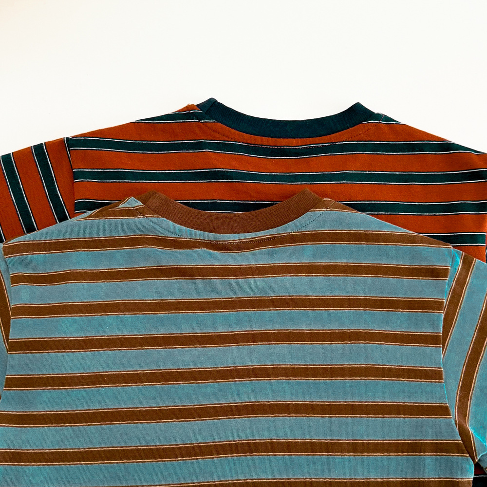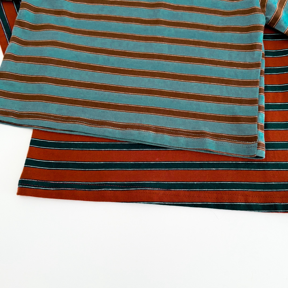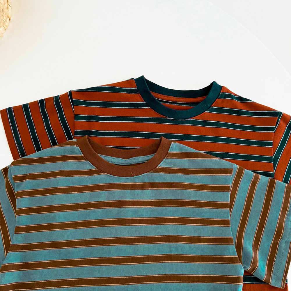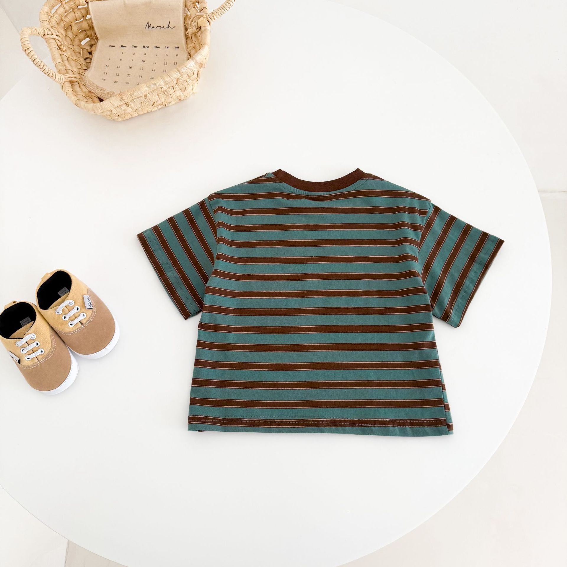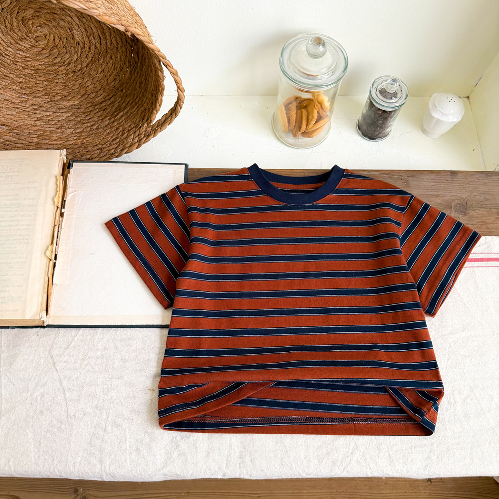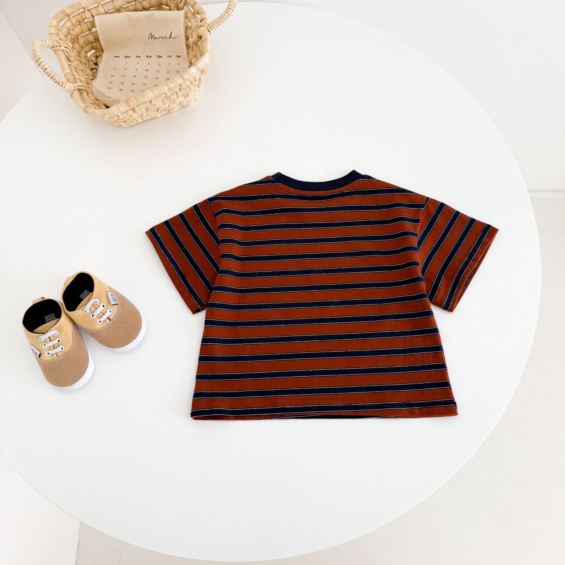Ins 한국어 버전 여름 줄무늬 반팔 티셔츠 소년과 소녀를위한 베이비 퓨어 코튼 다목적 탑 레트로 라운드 넥 대비 컬러 티셔츠스토어 가기