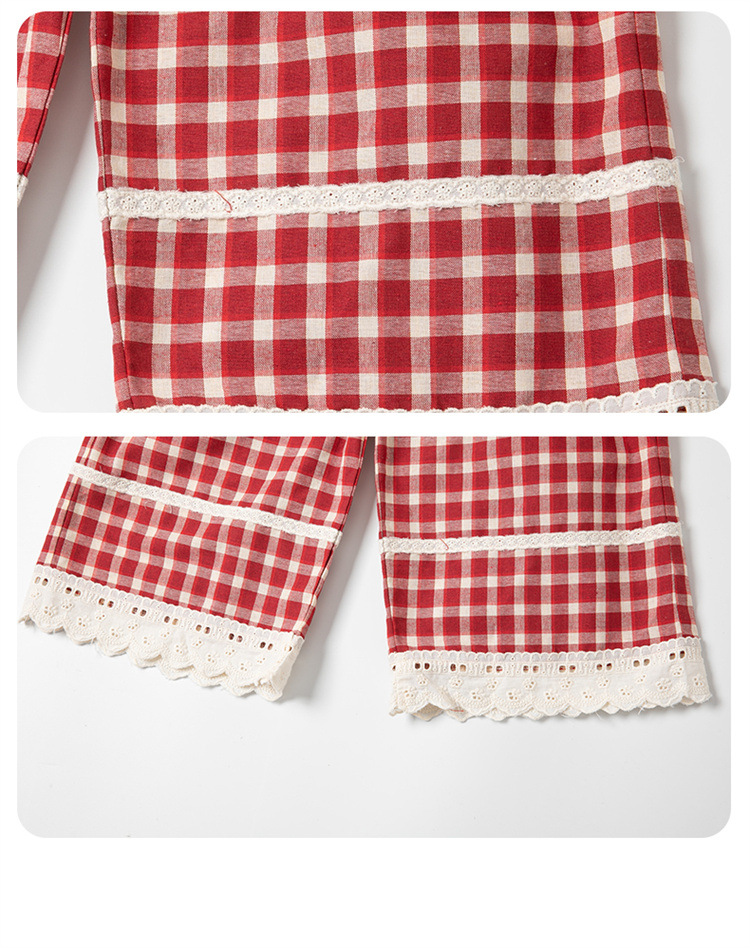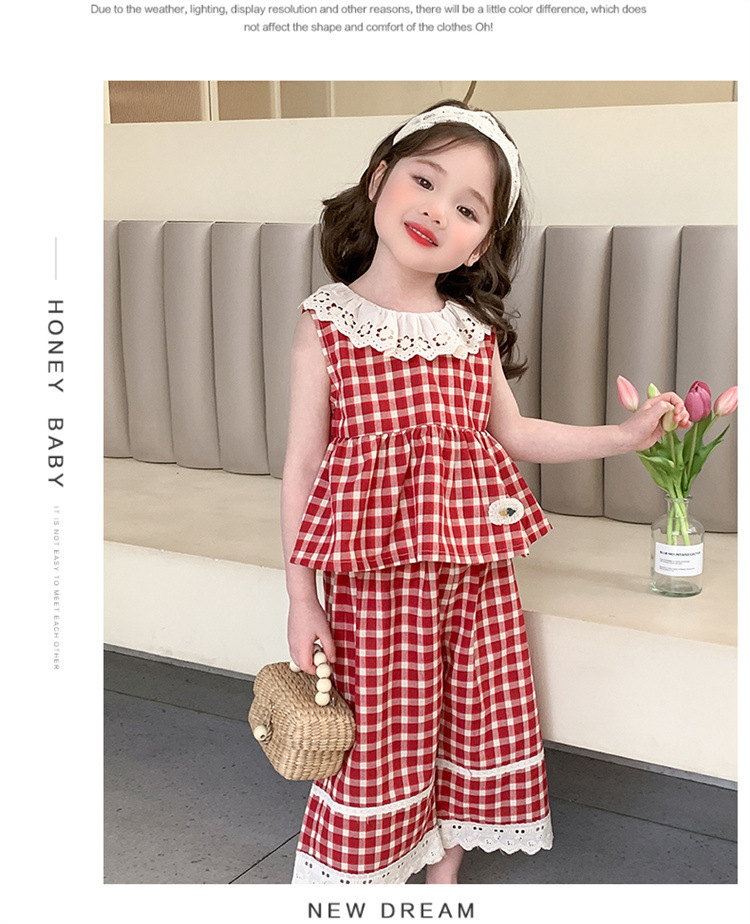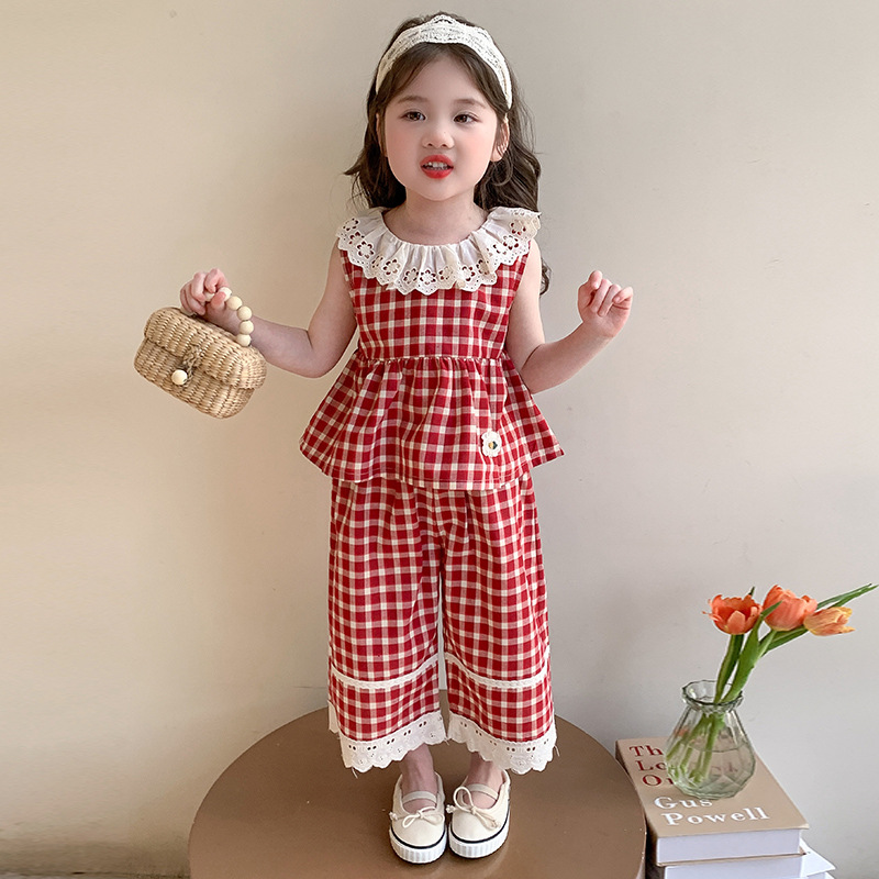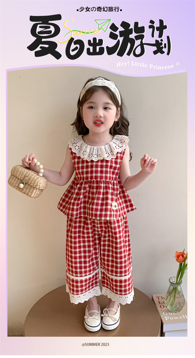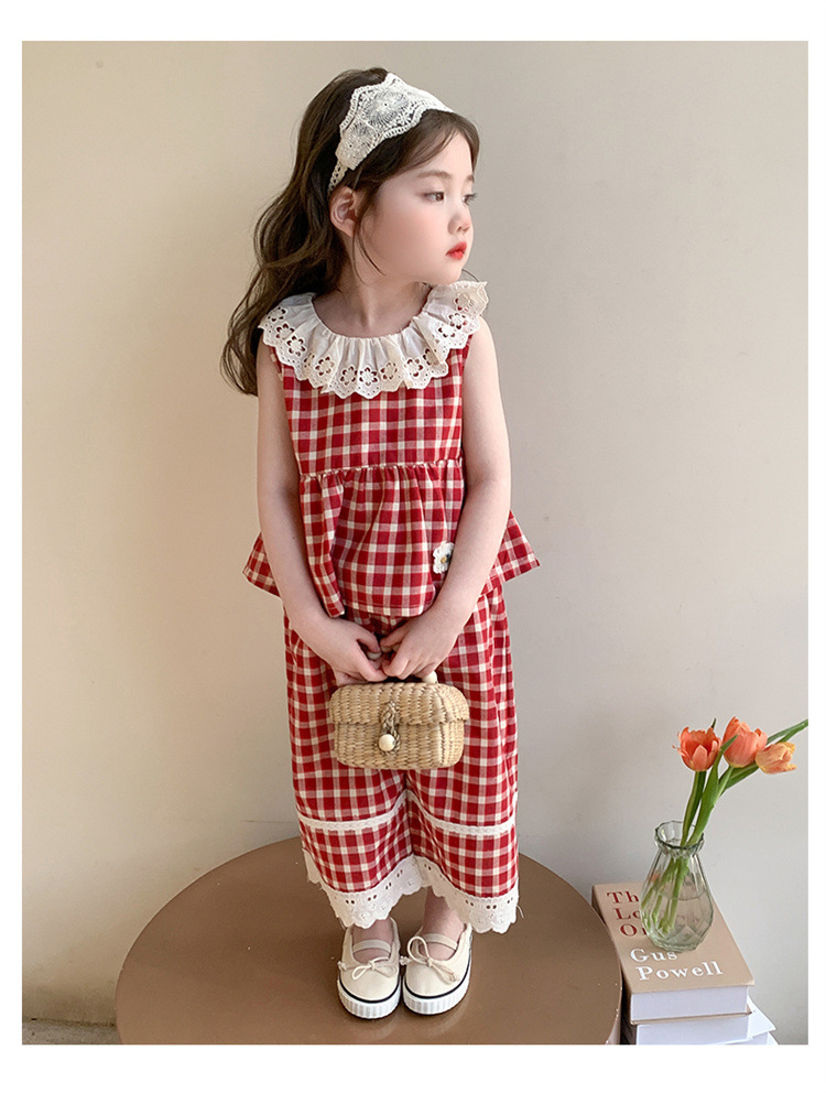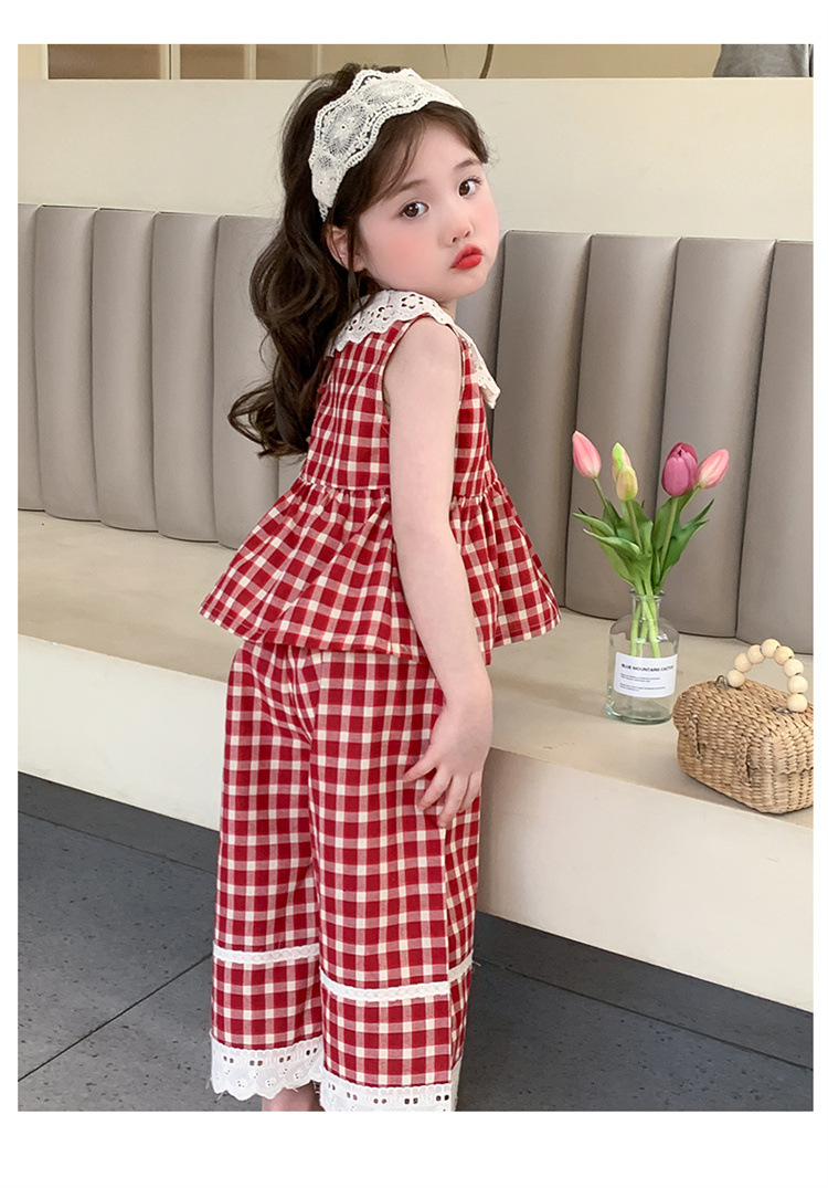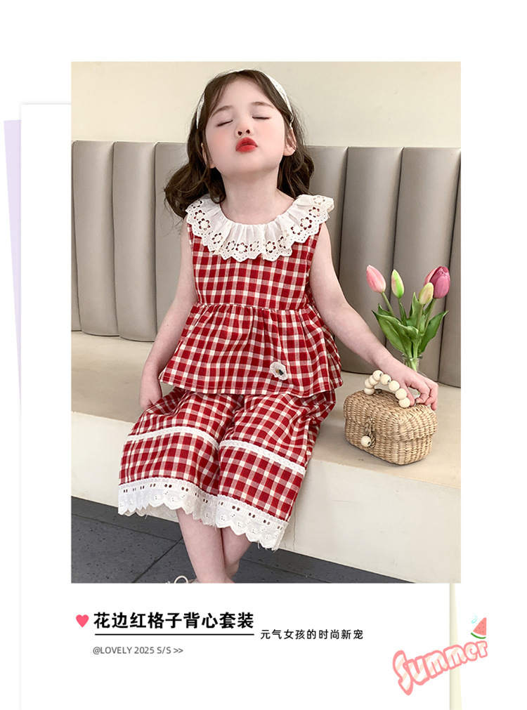 소녀의 레이스 빨간 격자 무늬 조끼 세트 2025 여름 새로운 유행 소녀의 세련된 2 피스 세트