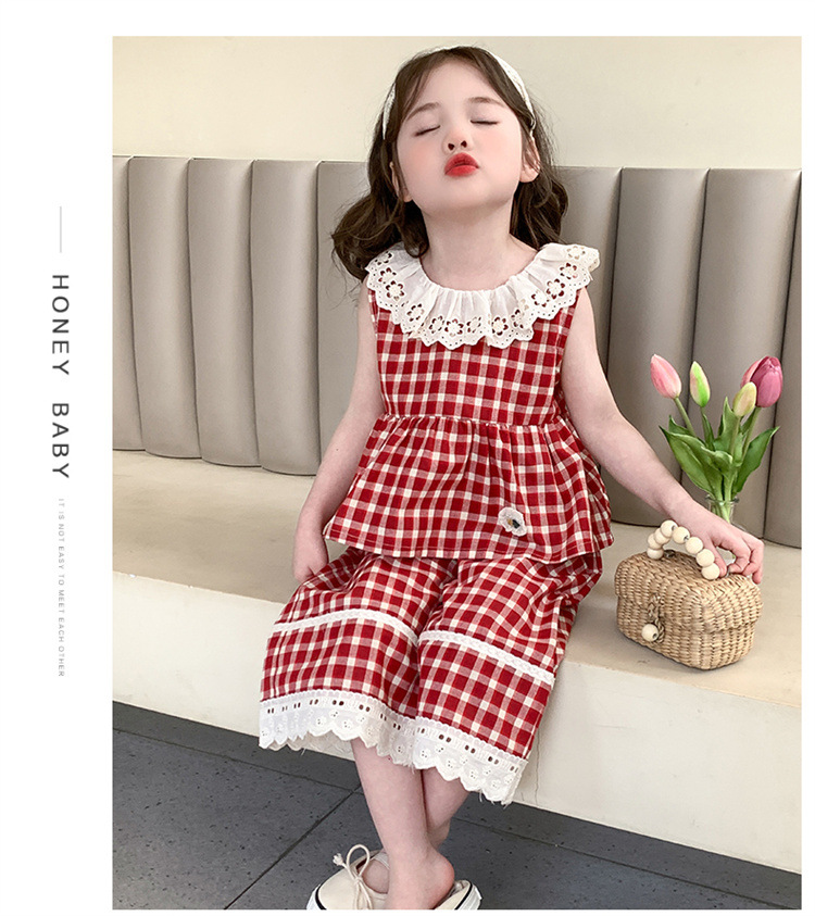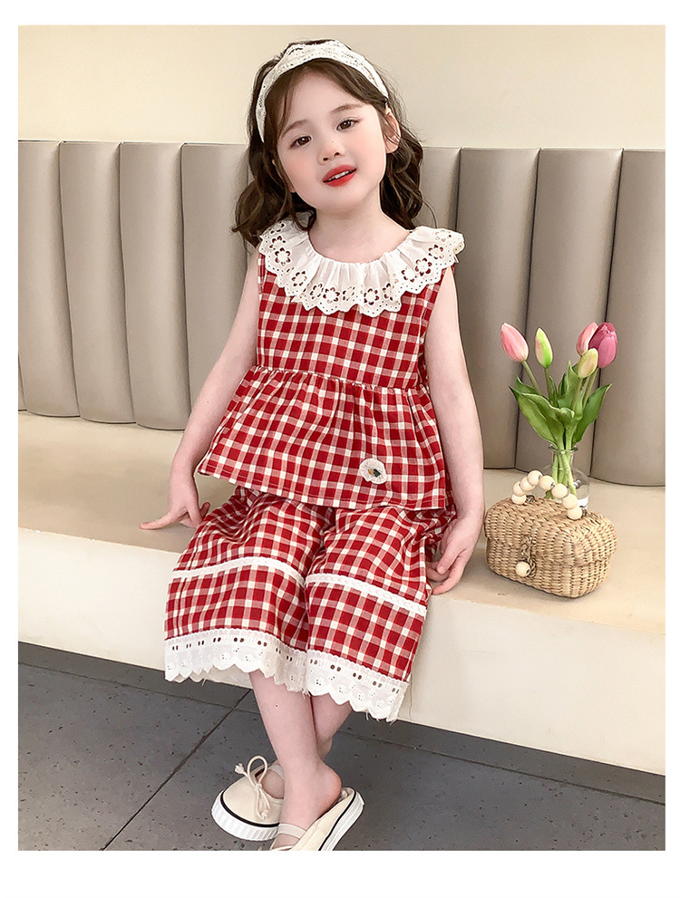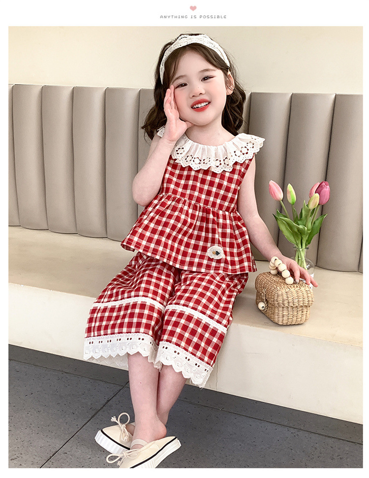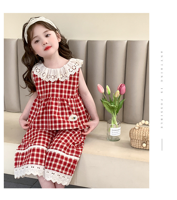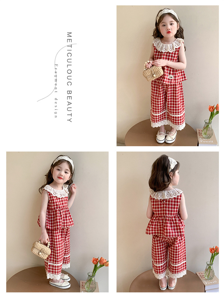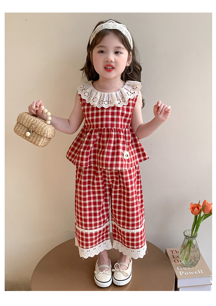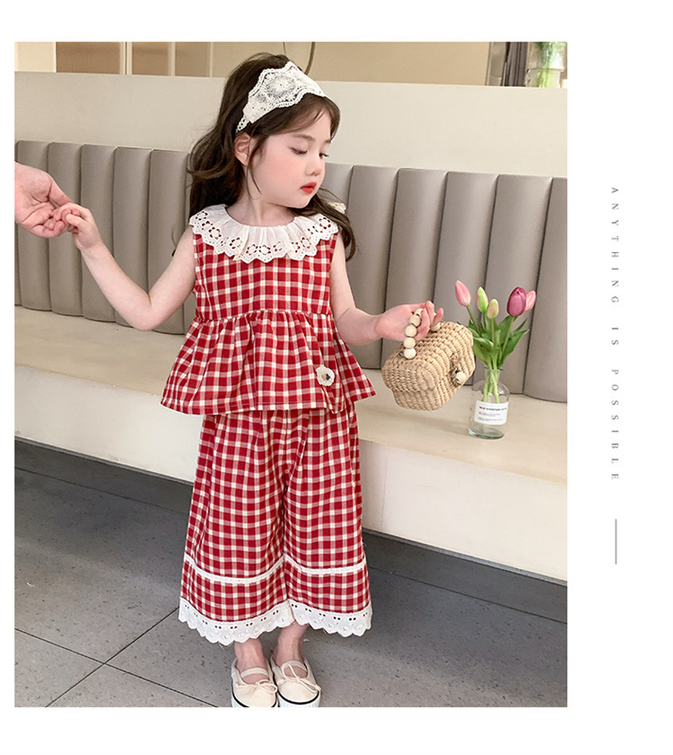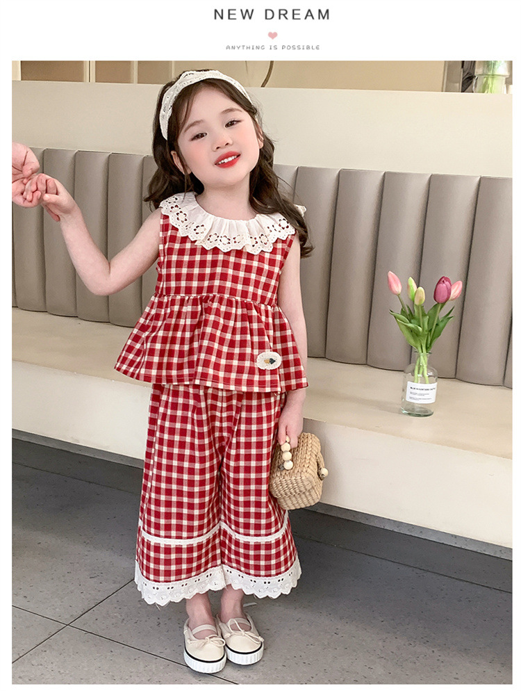 소녀의 레이스 빨간 격자 무늬 조끼 세트 2025 여름 새로운 유행 소녀의 세련된 2 피스 세트스토어 가기