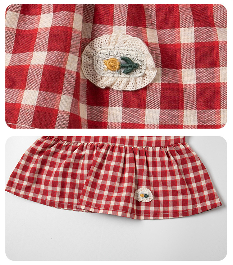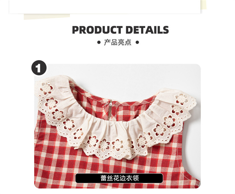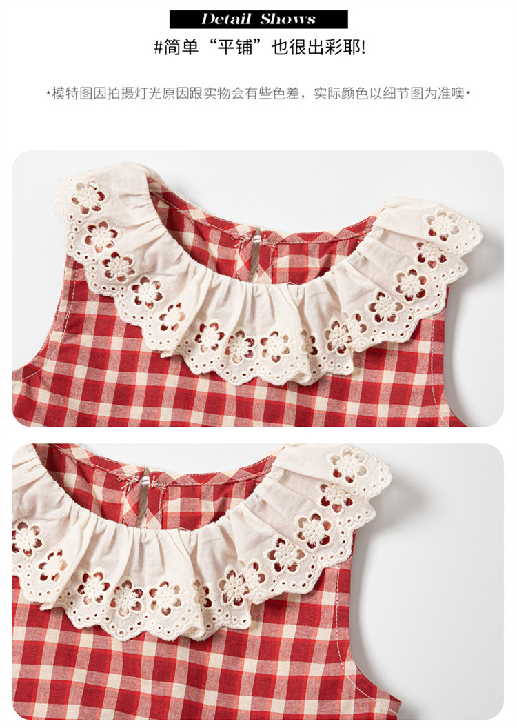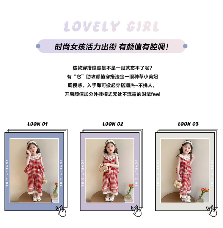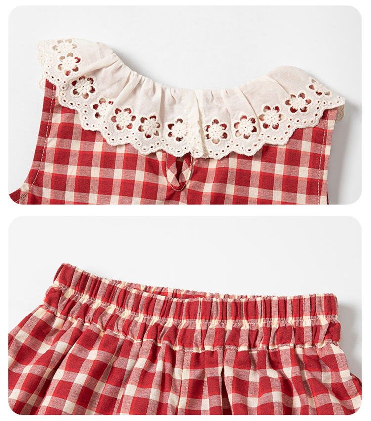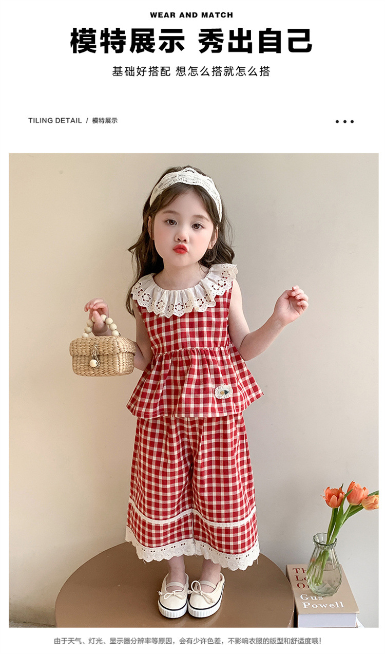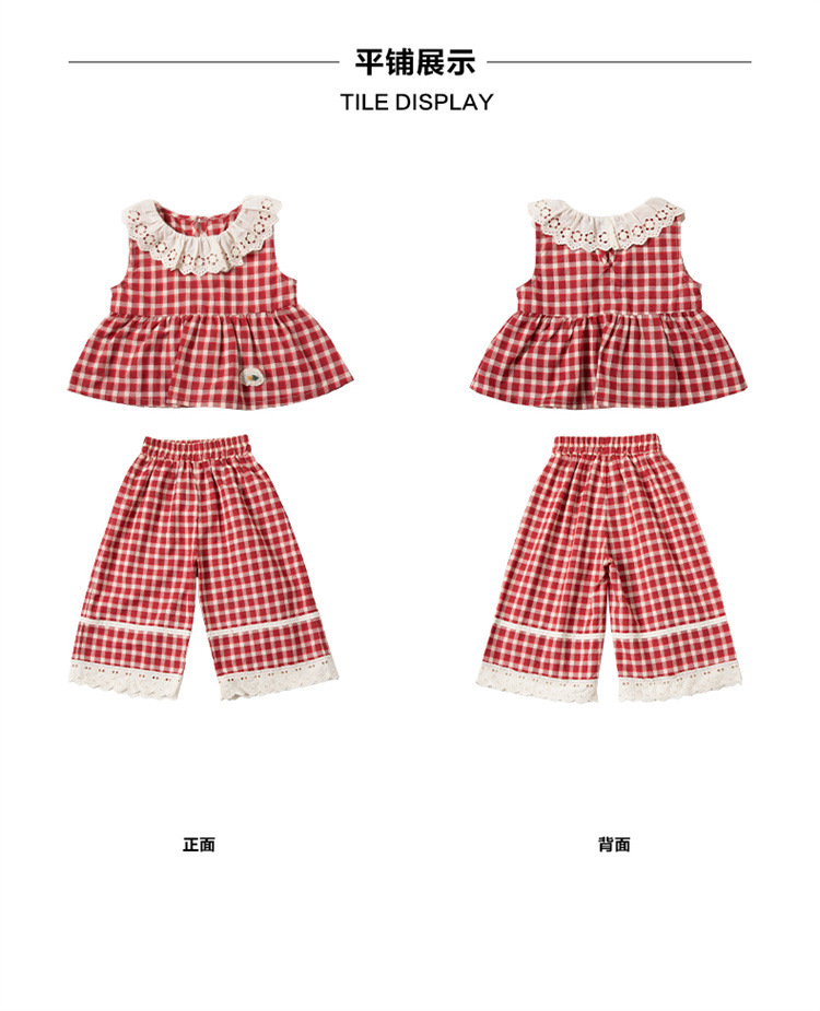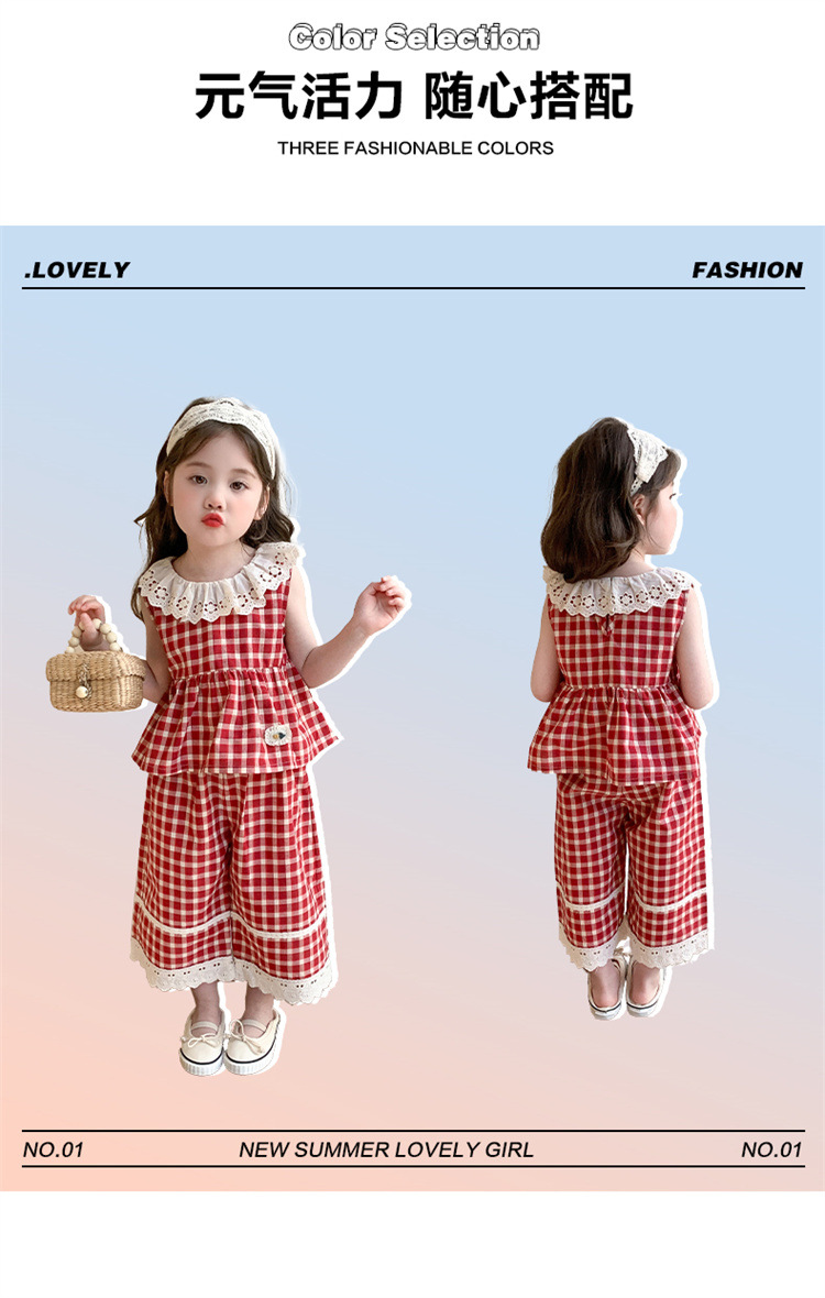 소녀의 레이스 빨간 격자 무늬 조끼 세트 2025 여름 새로운 유행 소녀의 세련된 2 피스 세트스토어 가기
