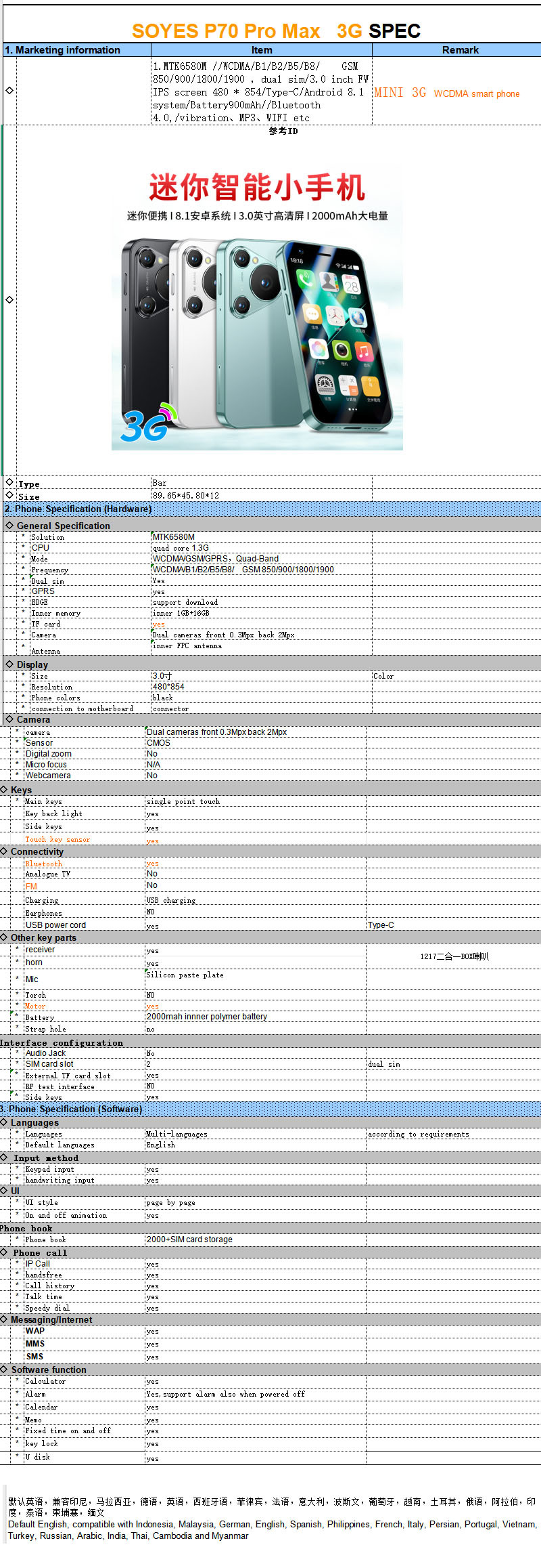 SOYES Sono P70promax 미니 스마트폰 3inch 쿼드 코어 프로세서 Google Android81 외국어 버전