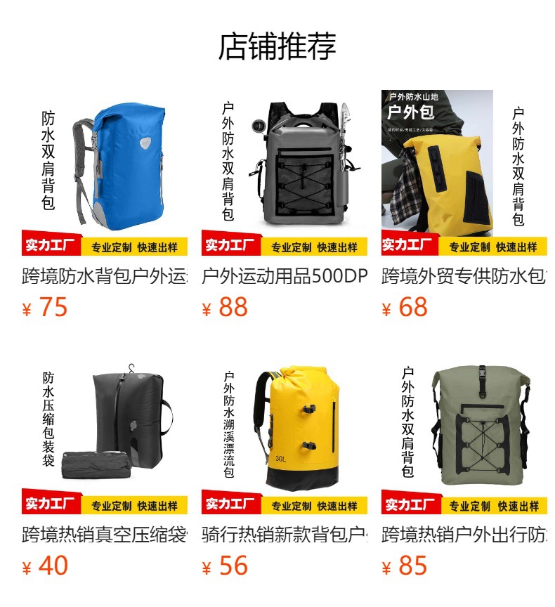 东莞睿旺包装制品有限公司是一家专注于生产户外防水桶包、防水背包、防水行李包、防水保温包、防水手机袋等户外防水装备产品的工厂,为客户解决在户外运动中,个人物品防水的难题。工厂投产多年来,已经为全球多个知名运动品牌代工过产品,产品质量得到了广大客户的高度认可。我司主要承接来图定制、来样定制、贴牌代工,同时常规防水桶包常年配备足够库存,满足您随时要货的需求。热情期待各位新老客户的来电咨询以及莅临工厂参观、指导、洽谈。