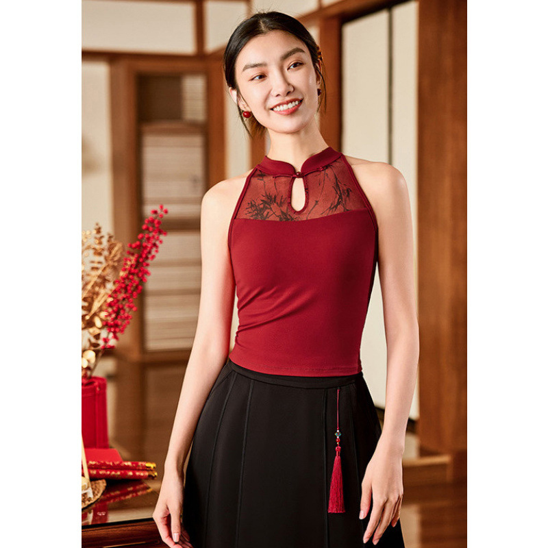 레트로 중국 스타일 패션 요가 옷 새로운 중국 스타일 필라테스 메쉬 치파오 칼라 민소매 슬리밍 조끼 탑