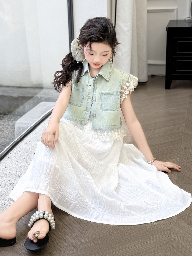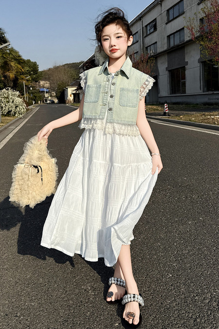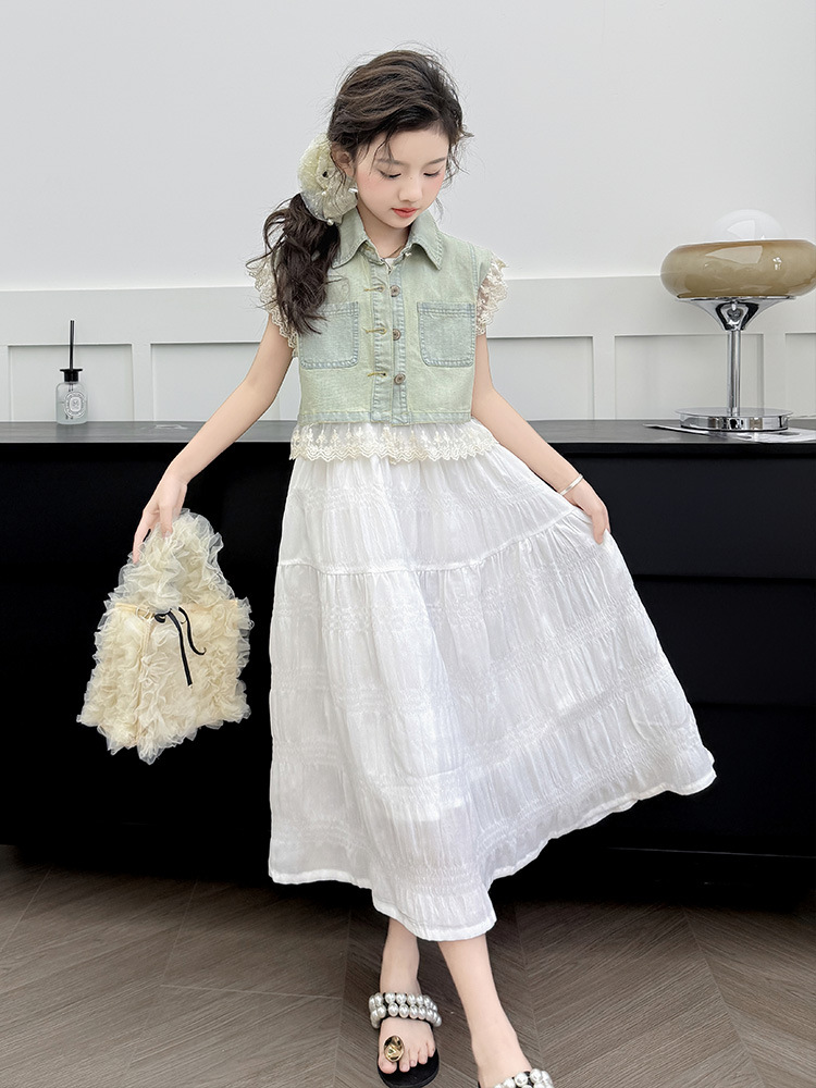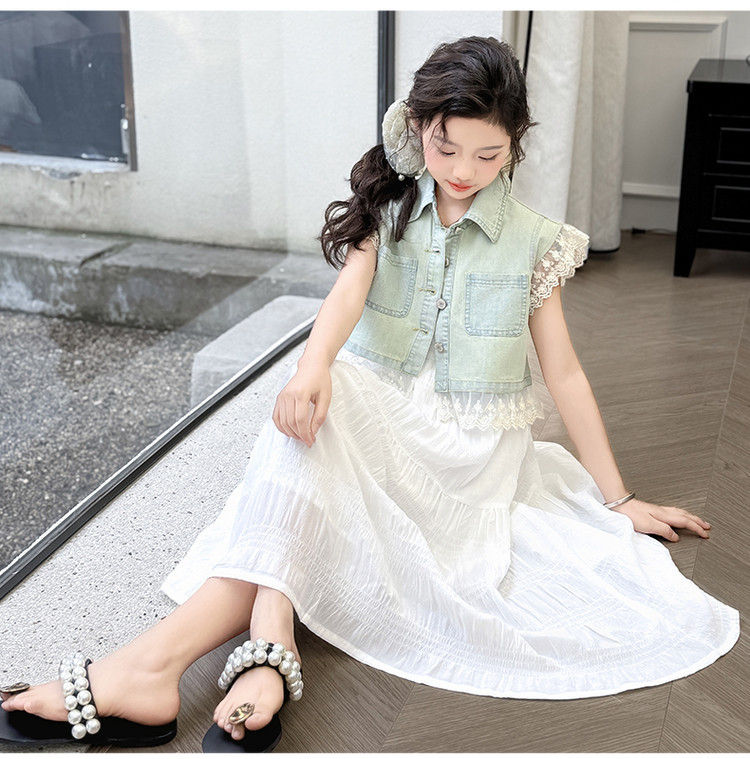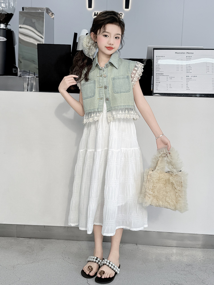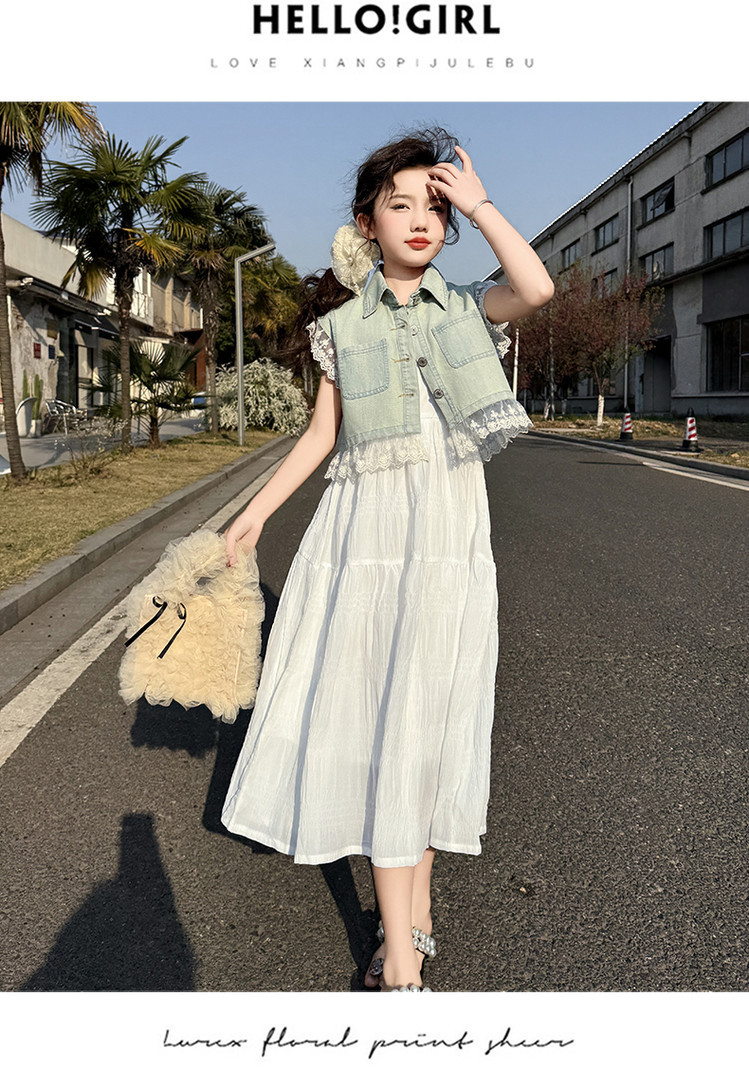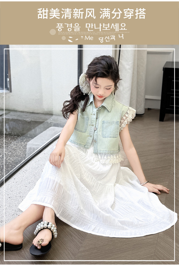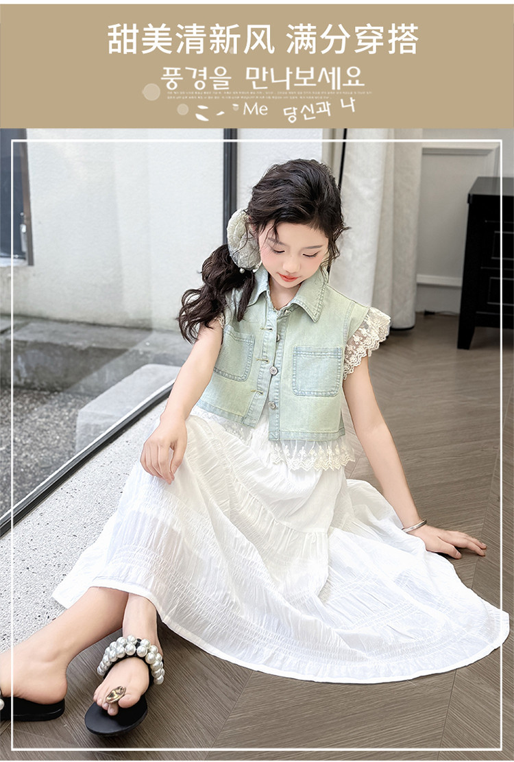 국경 간 소녀 여름 원피스 2025 새로운 어린이 여름 서양식 소녀 레이스 데님 조끼