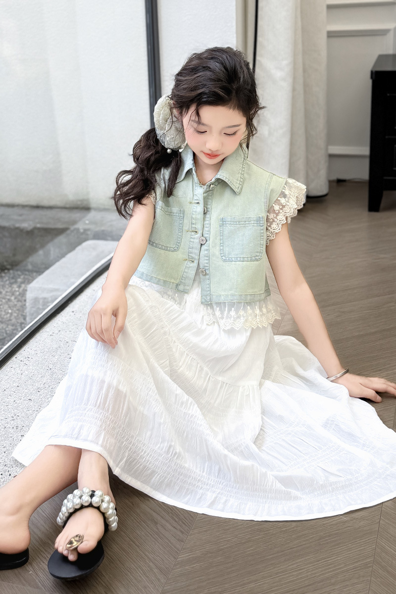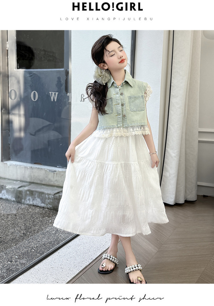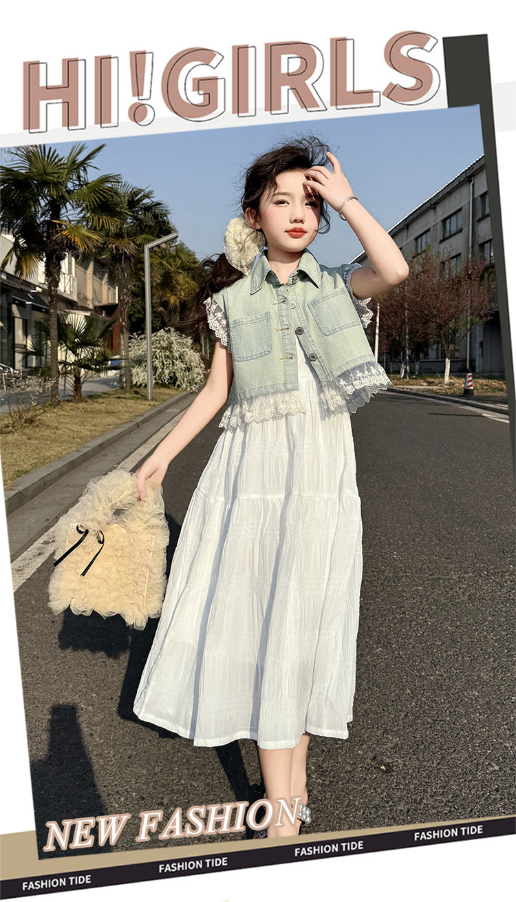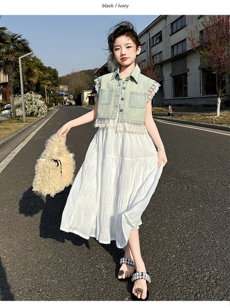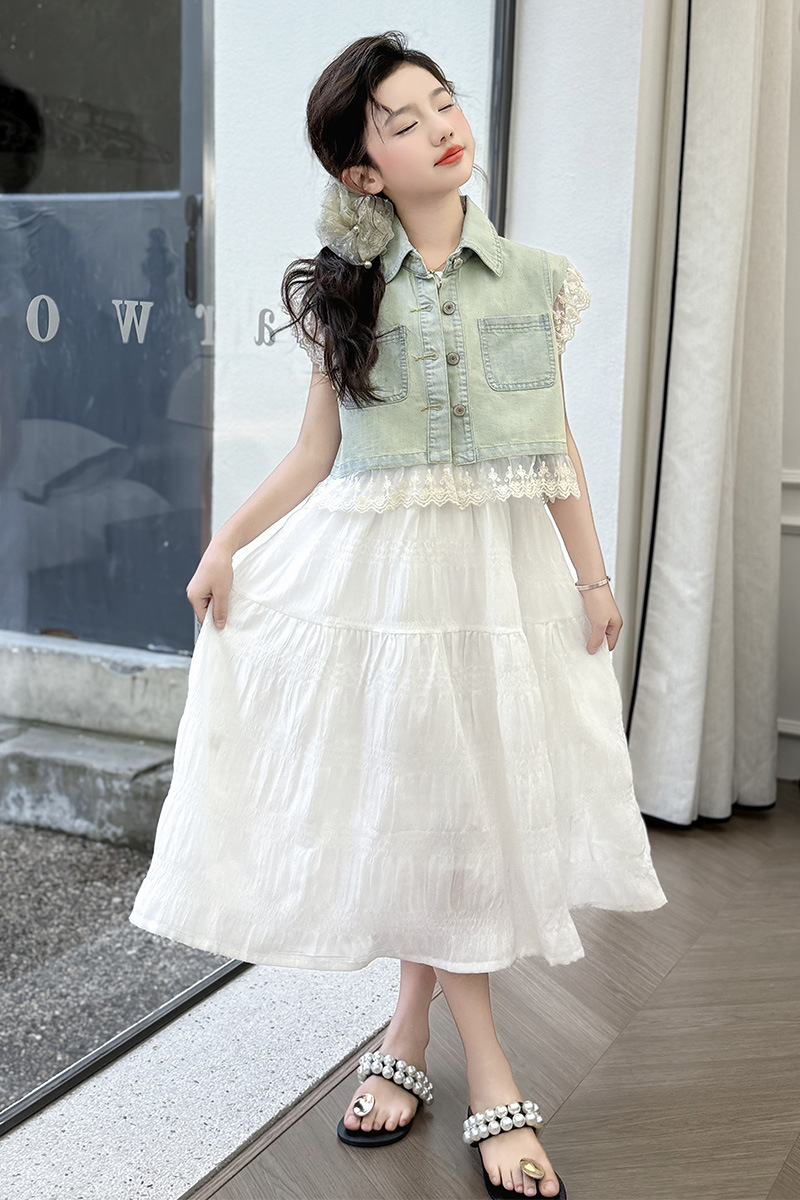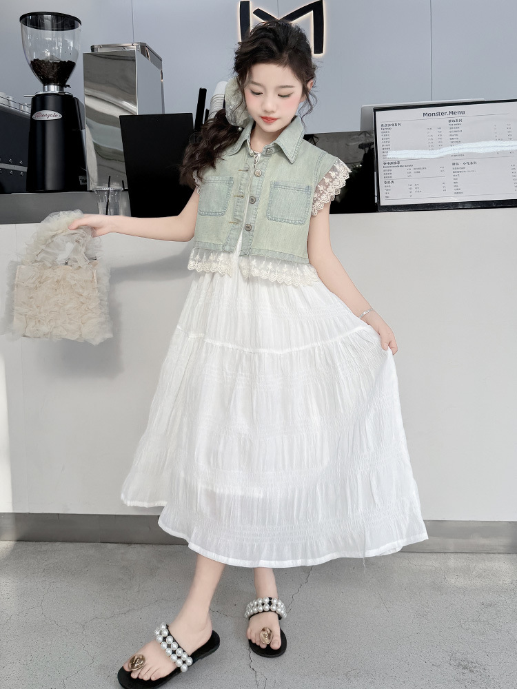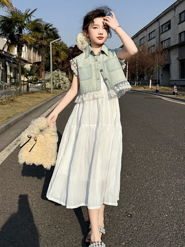 국경 간 소녀 여름 원피스 2025 새로운 어린이 여름 서양식 소녀 레이스 데님 조끼