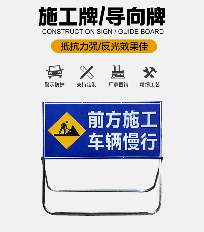 임시 이동식 반사 경고 표시, 앞에 건설 차량이 느리게 운행하고 왼쪽 및 오른쪽으로 가이드 표시, 접이식 표시