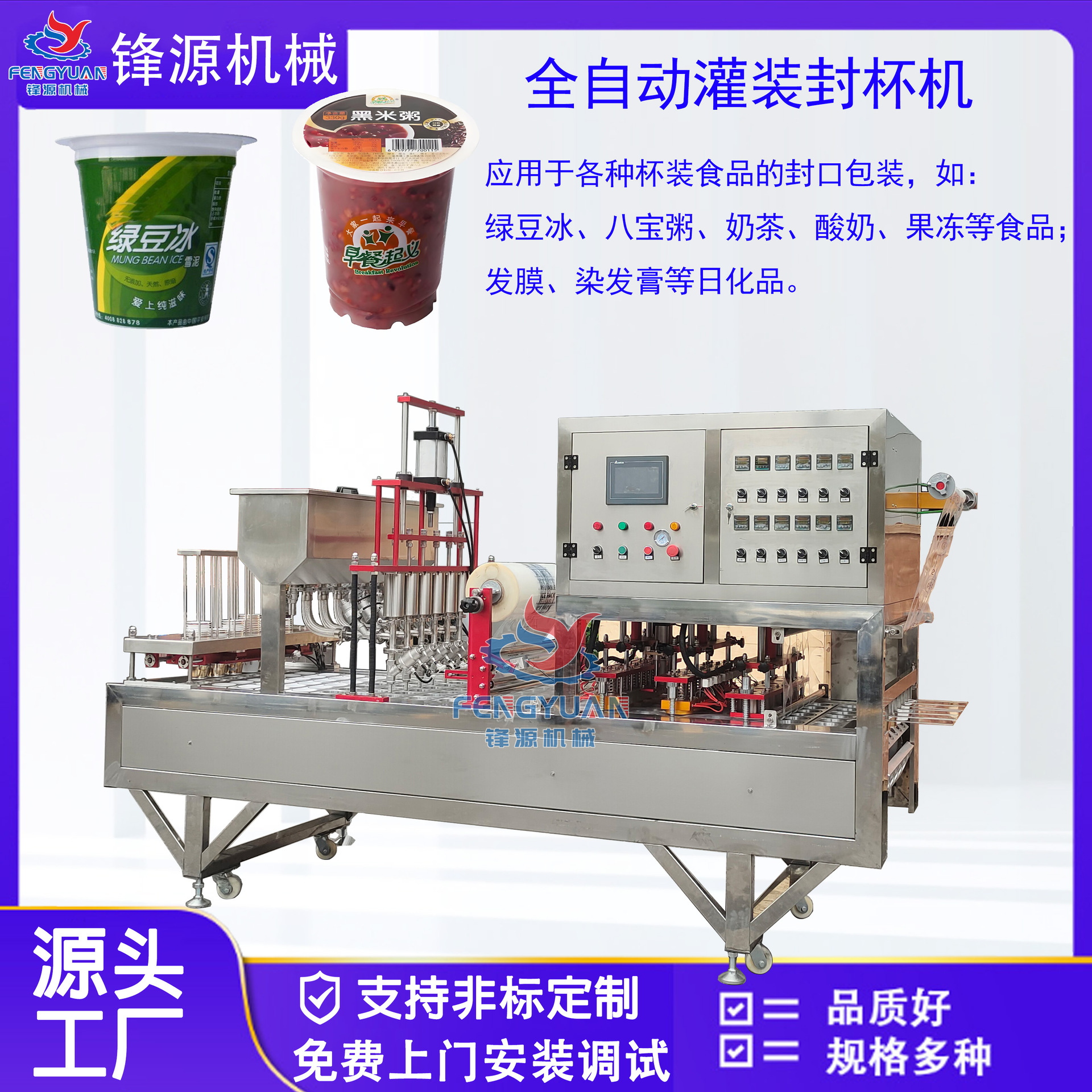 全自动封杯机系列,是一种用于灌装、封口和包装的机器设备,广泛应用于食品、饮料、化妆品、医药等行业,能够自动化完成灌装、封口、包装等工序,提高生产效率和质量,减少人工成本和劳动强度。多用于各种塑料杯的灌装封口包装,常见产品有绿豆沙冰、杯装八宝粥、杯装豆浆、奶茶、果汁、果冻等。