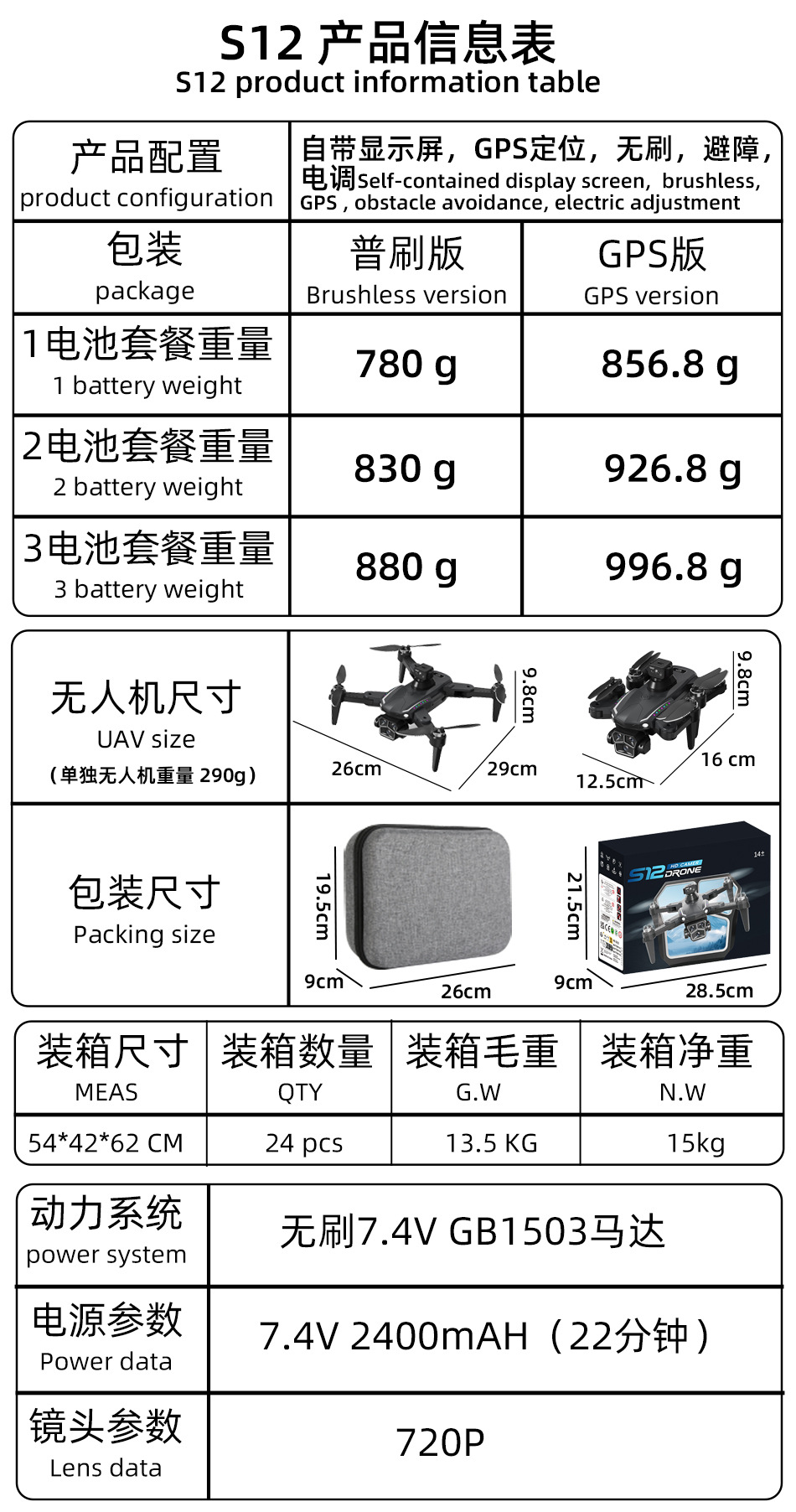 스크린 제어 항공 사진 장애물 회피 항공기 브러시리스 광학 흐름 GPS 포지셔닝 반환 원격 제어 항공기와 크로스보더 S12 드론스토어 가기