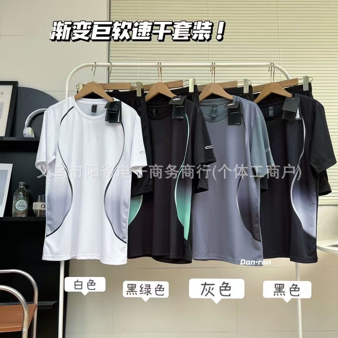 N 가족 그라디언트 거대한 부드러운 빠른 건조 옷 스포츠 세트 남성 반팔 반바지 여름 달리기 스포츠 훈련 피트니스