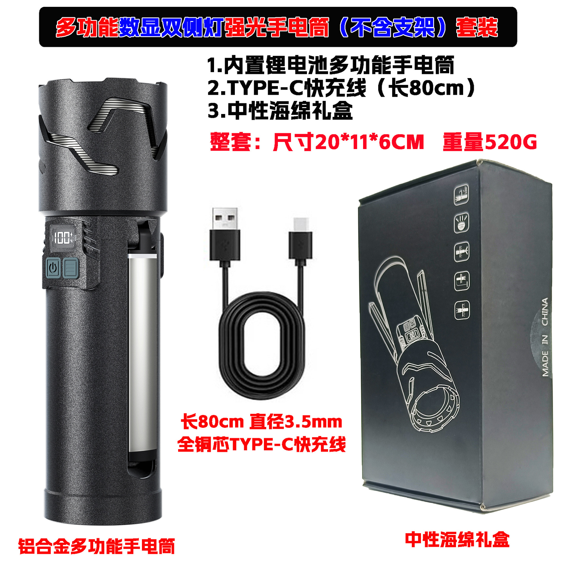 디지털 디스플레이 전원 흰색 레이저 밝은 손전등 충전식 슈퍼 밝은 야외 비상 조명 이중 광원 손전등