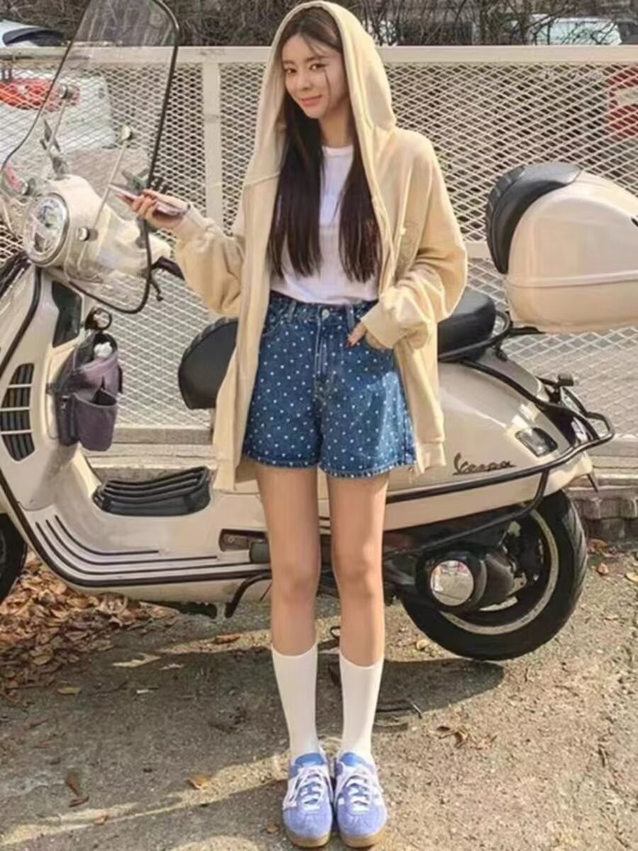 여름 여성을 위한 블루 도트 프린트 데님 반바지 새로운 스타일 루즈 슬리밍 패셔너블 하이 웨이스트 A 라인 와이드 레그 팬츠스토어 가기