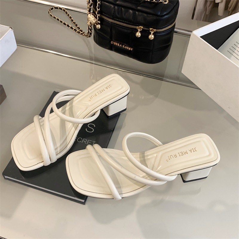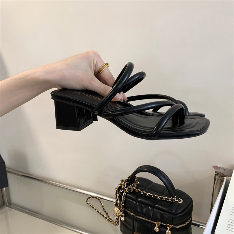 여성용 외부 착용을 위한 프렌치 두꺼운 굽과 얇은 스트랩 슬리퍼 2025 새로운 여름 편안한 중간 굽 휴가 샌들 실버 슬리퍼스토어 가기