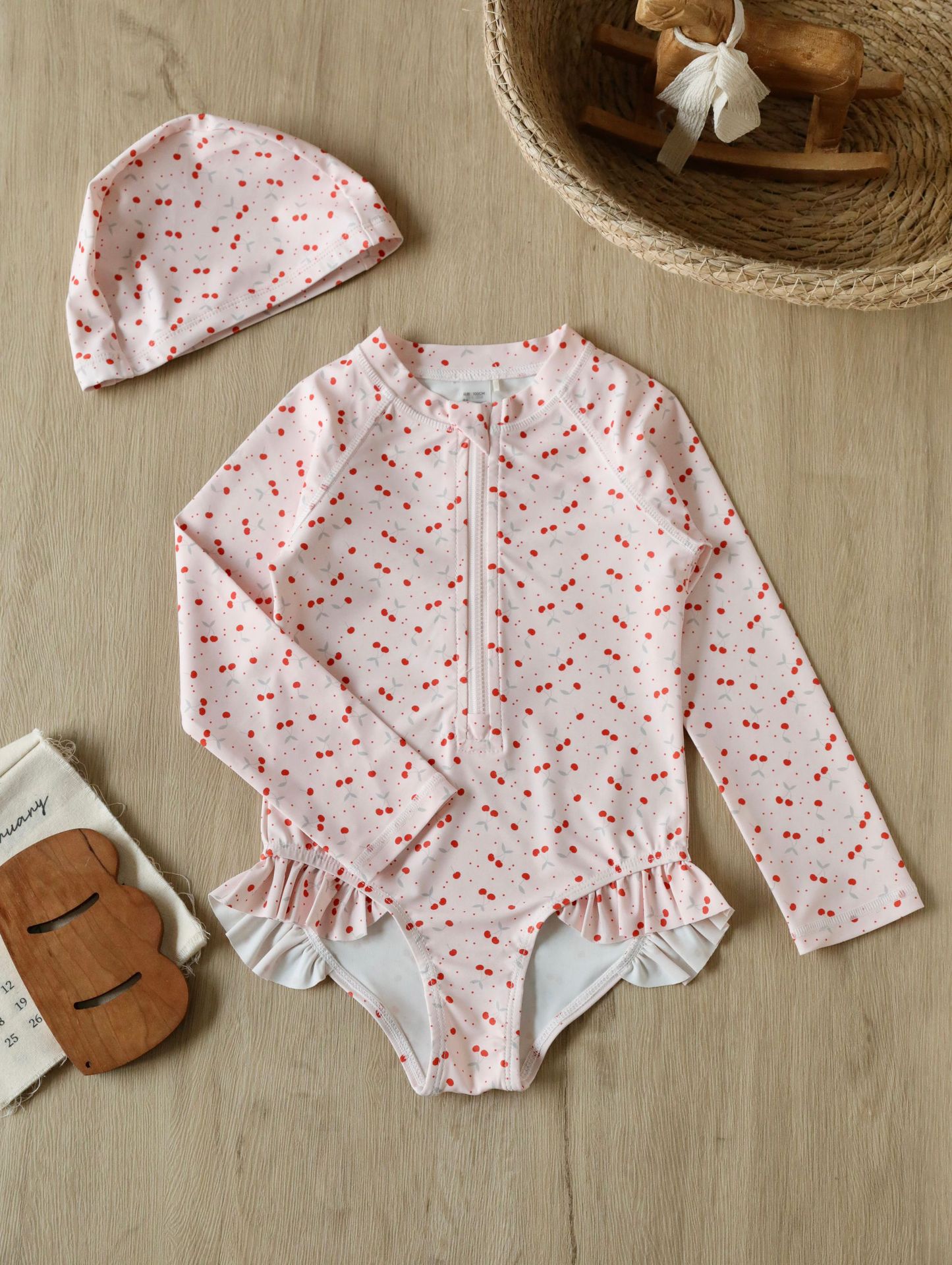 • 지퍼수영복 피치핑크 체리 [수영복+수영모]