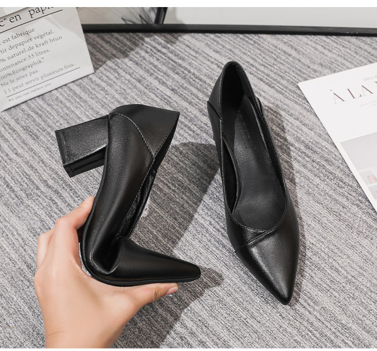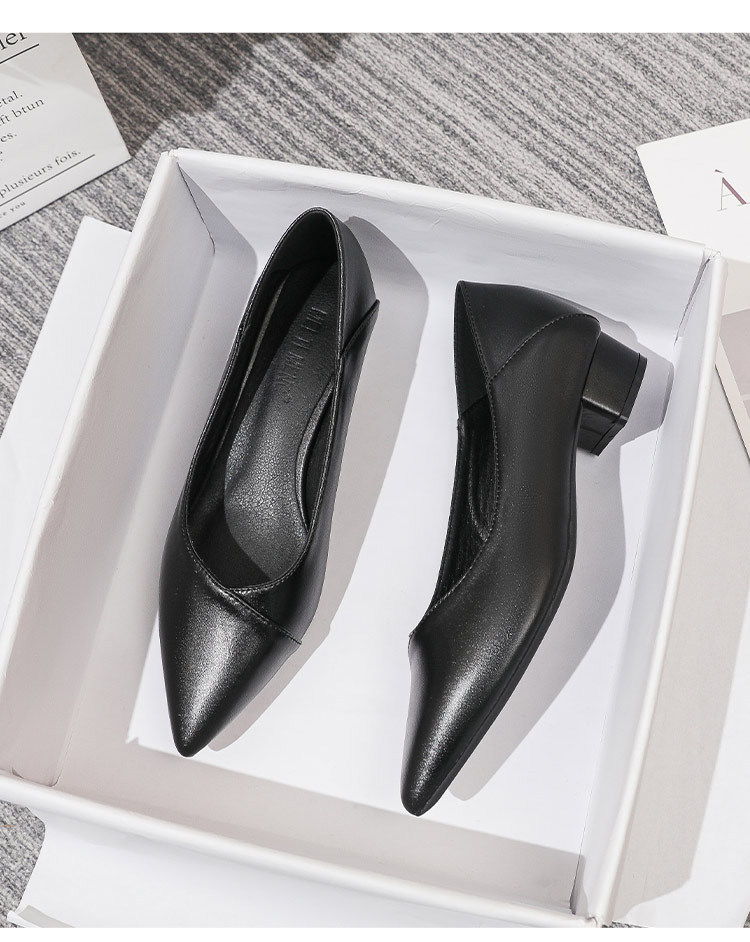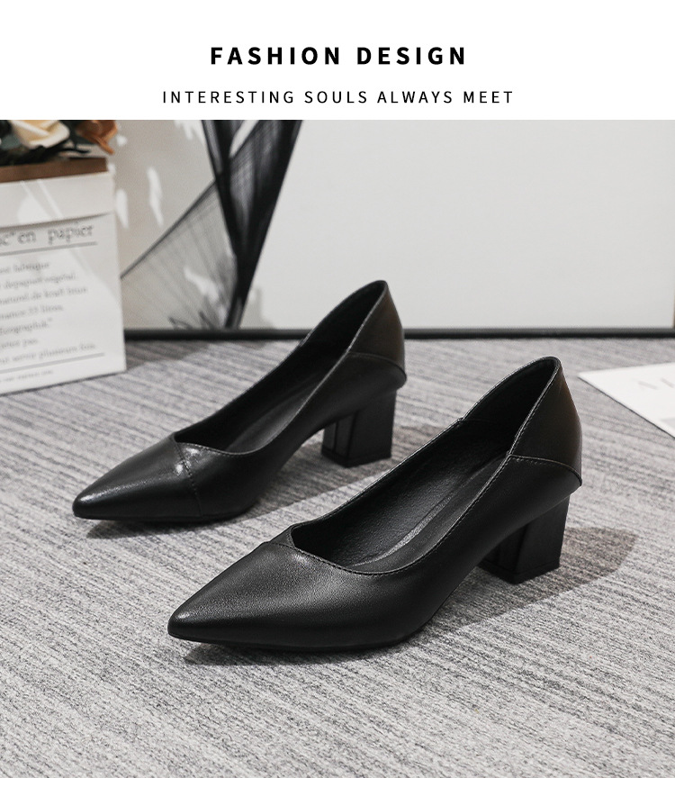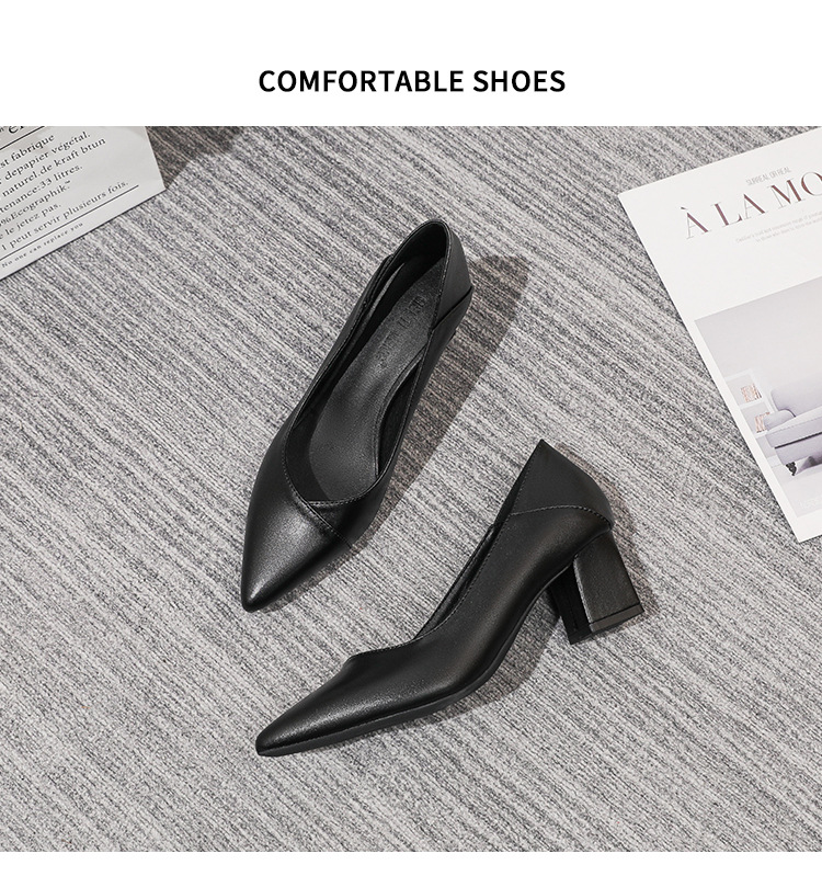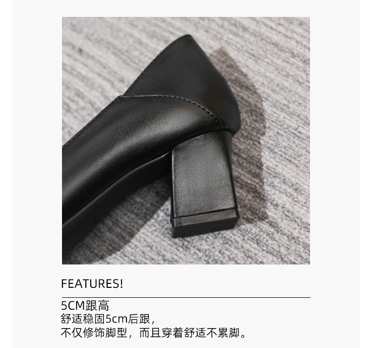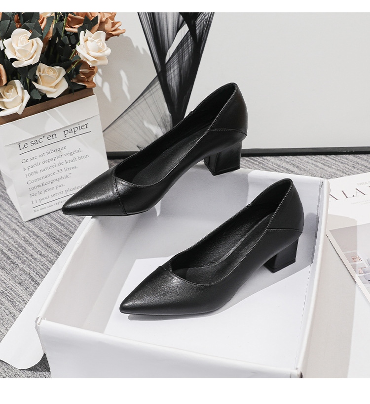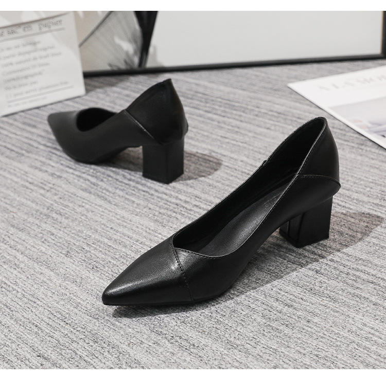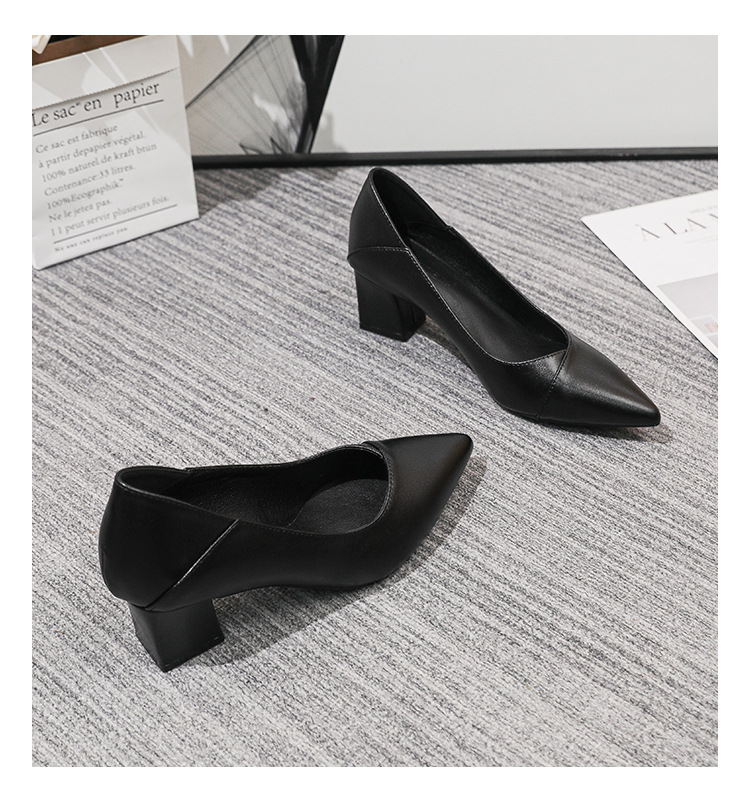 기질 부드러운 가죽 신발 두꺼운 힐 단일 레이어 신발 여성용 미들 힐 2025 블랙 원피스 하이힐 전문 스튜어디스 작업 신발 얕은 입스토어 가기