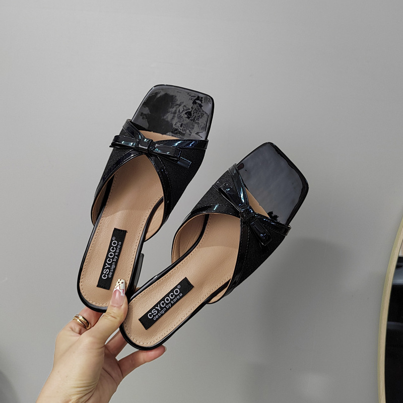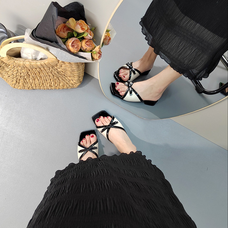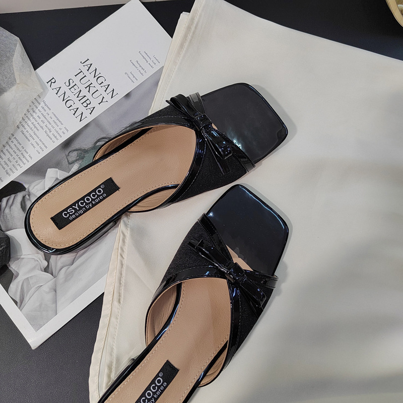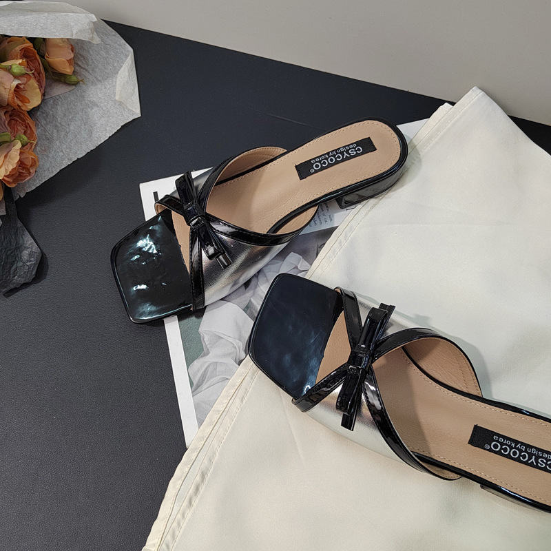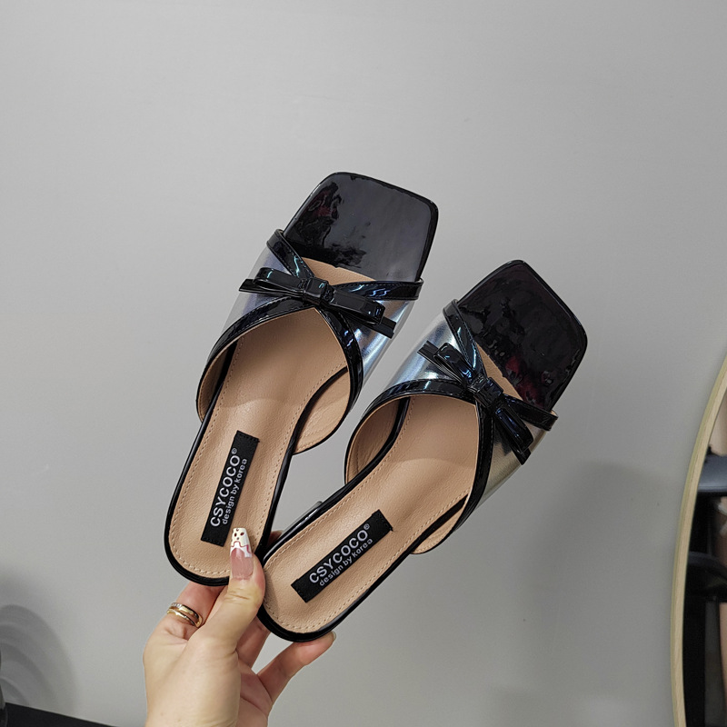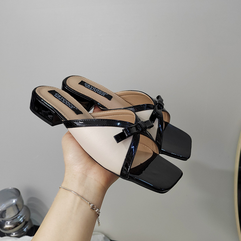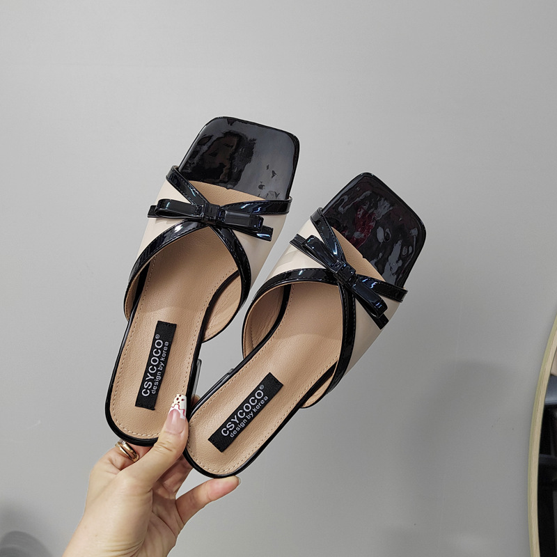 한국식 프렌치 보우 컬러 블록 샌들 로우 힐 다용도 여름 여성 슬리퍼
