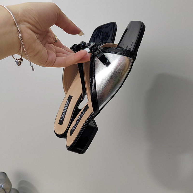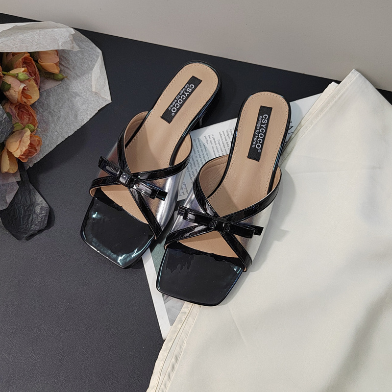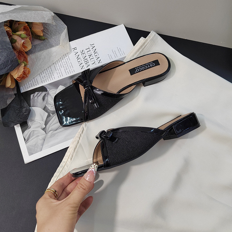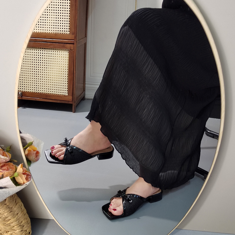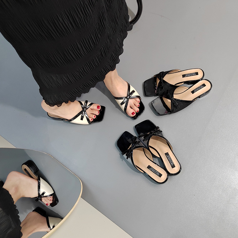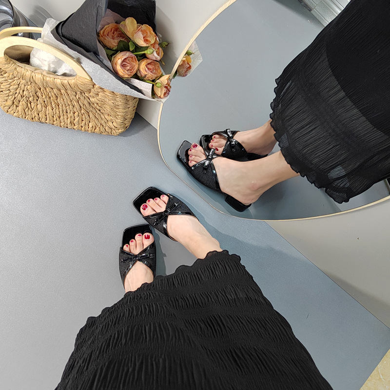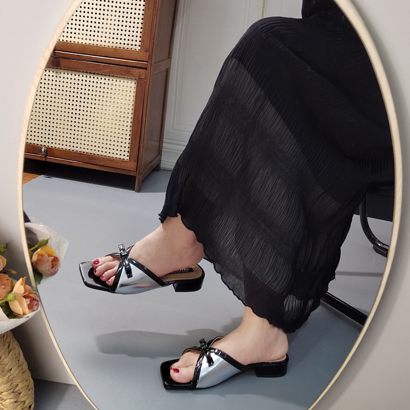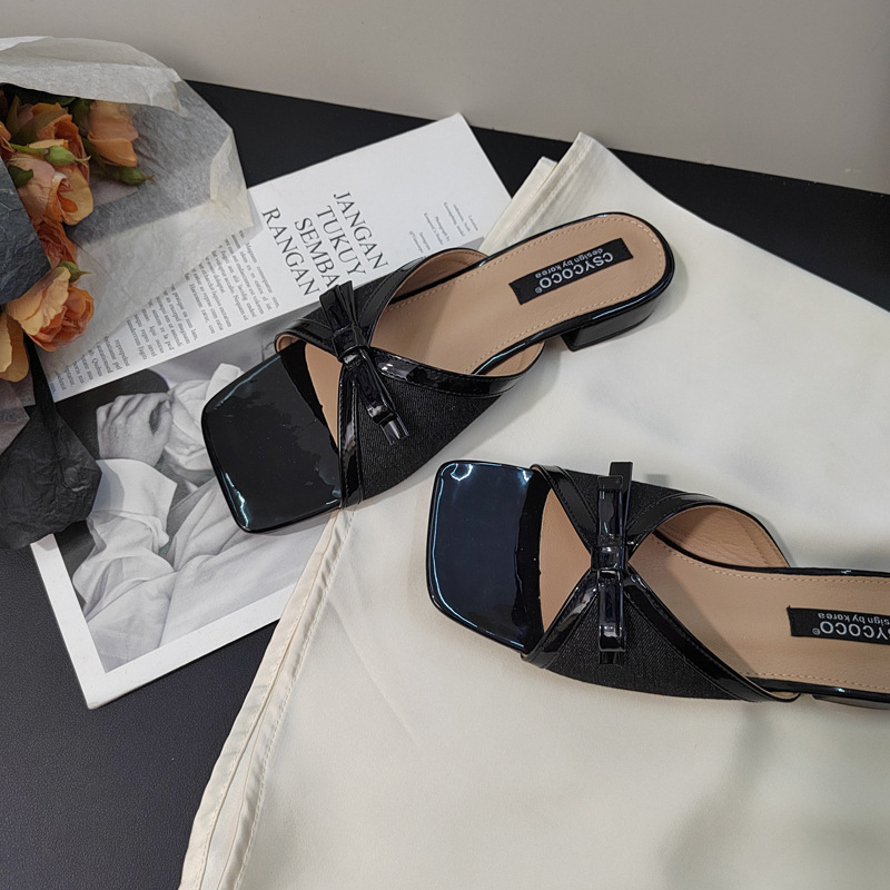한국식 프렌치 보우 컬러 블록 샌들 로우 힐 다용도 여름 여성 슬리퍼