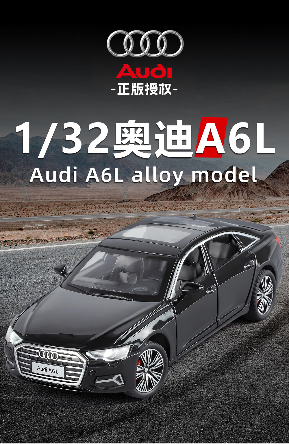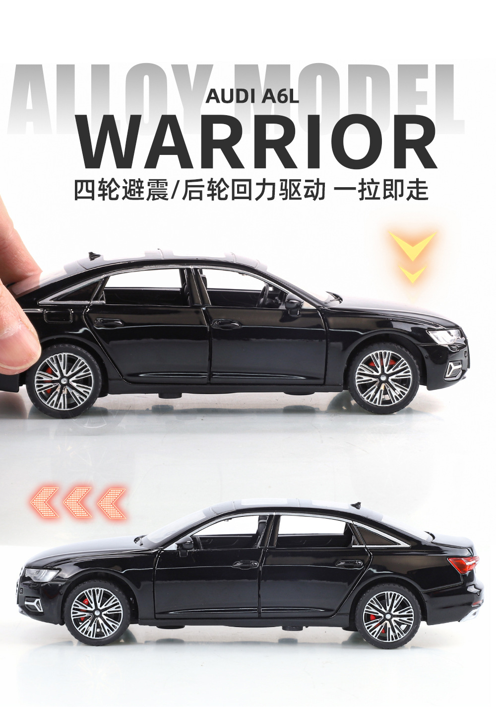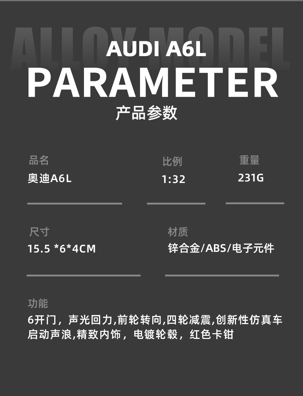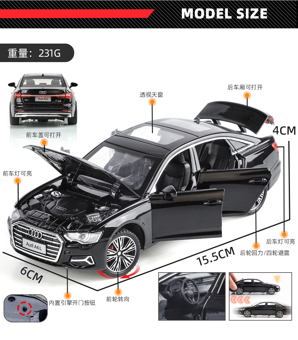 6开门,声光回力,前轮转向,四轮减震,创新性仿真车启动声浪,精致内饰,电镀轮毂,红色卡钳。